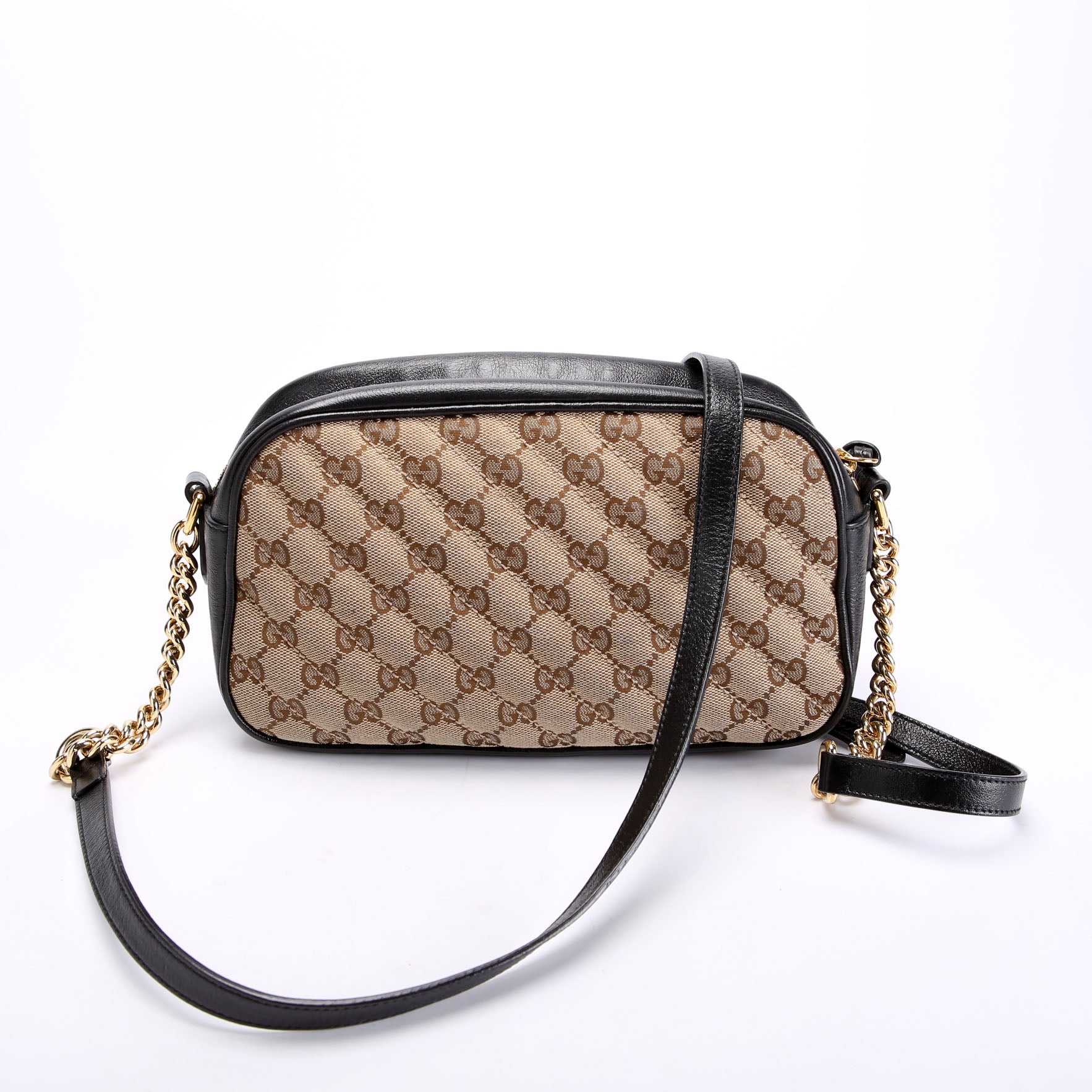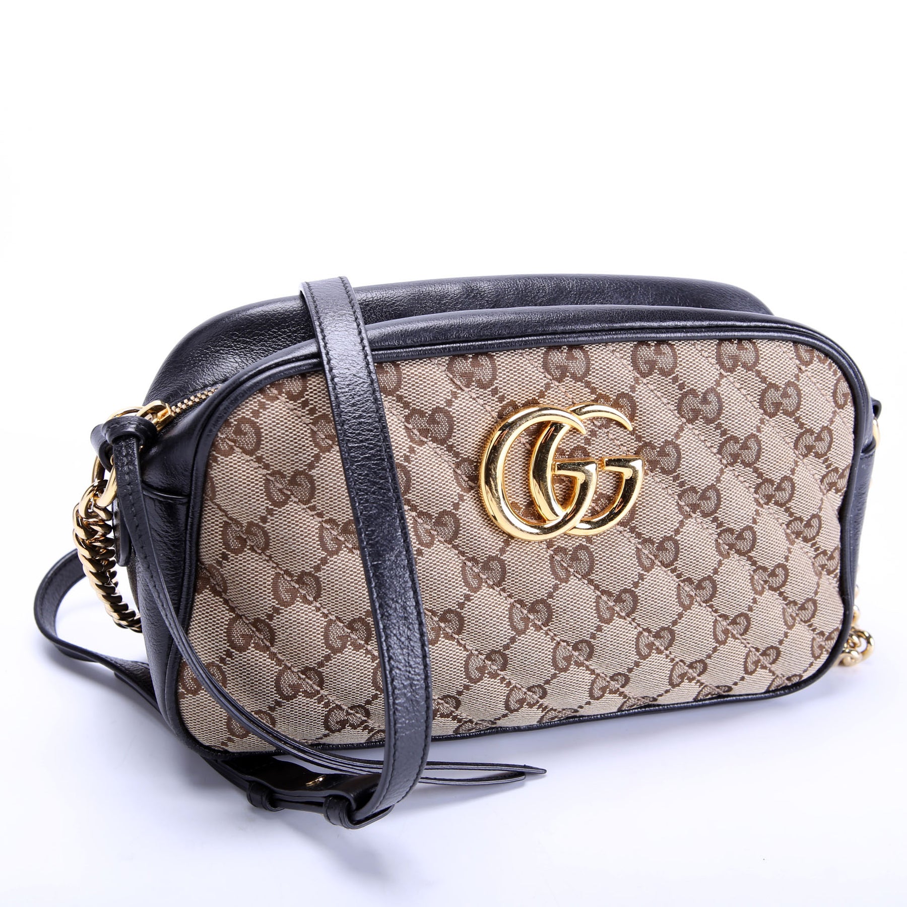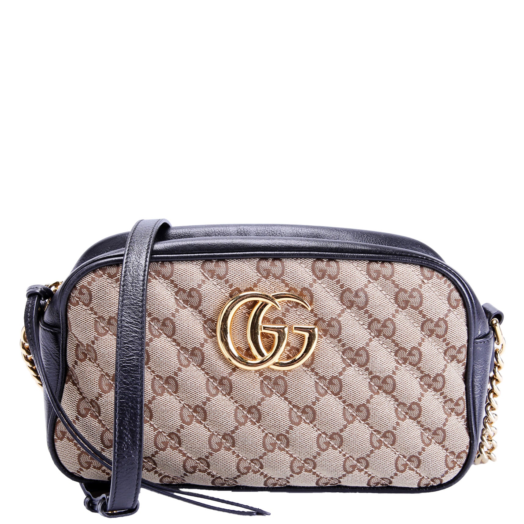 This pre-owned Gucci Marmont Small GG Canvas Camera Bag is guaranteed 100% authentic. The exterior is in the classic Gucci GG Canvas.