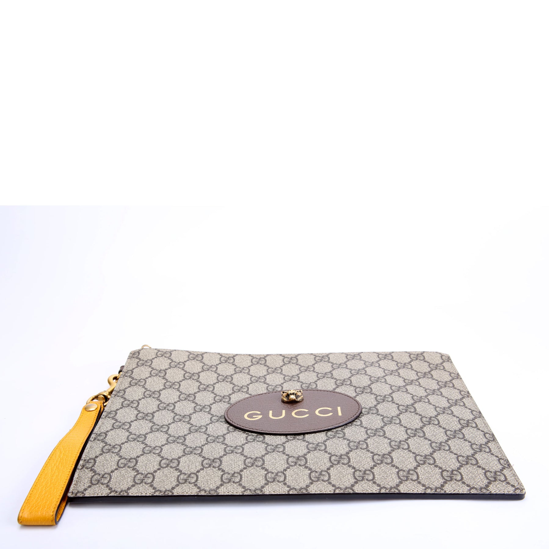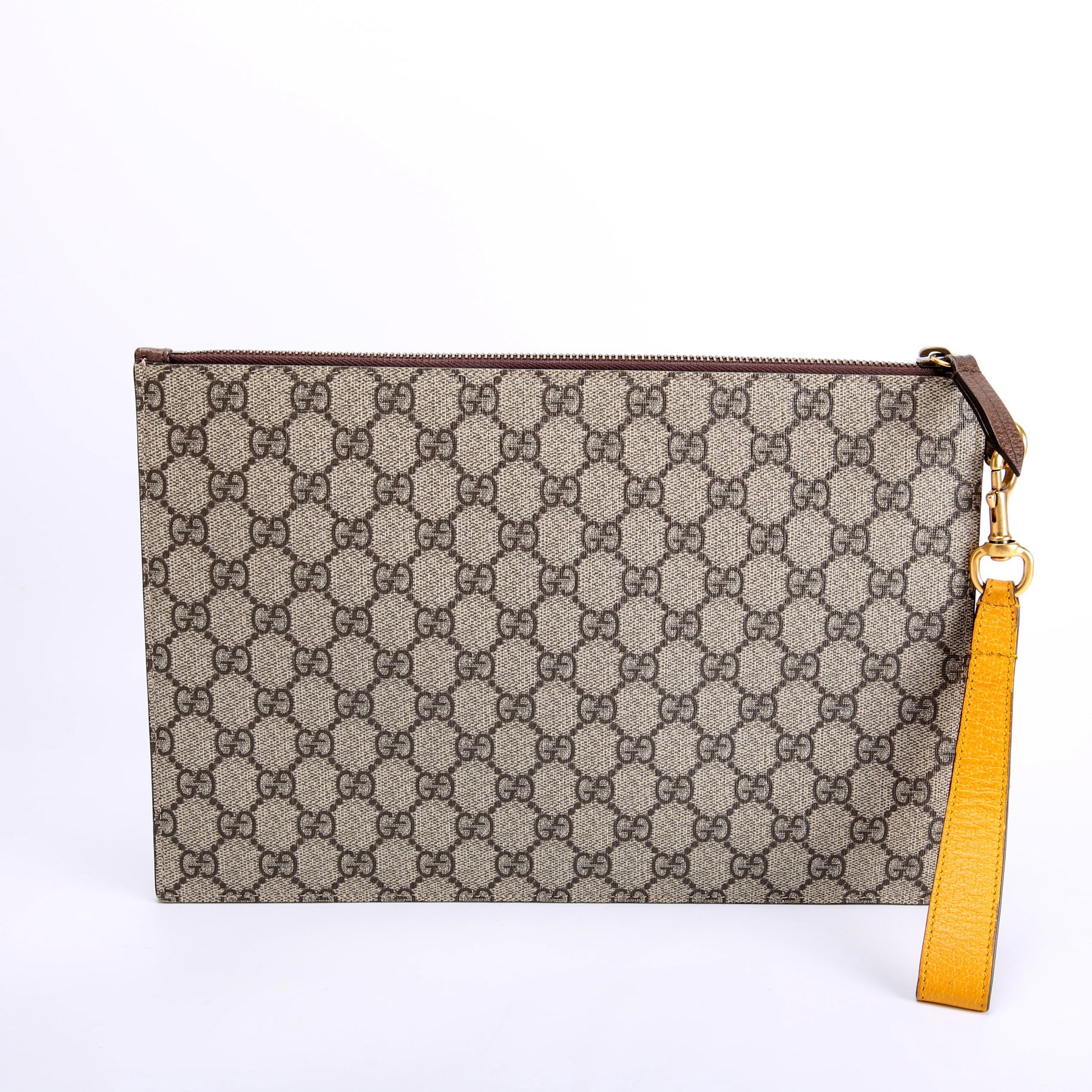 This pre-owned Gucci Neo Vintage Pouch is guaranteed 100% authentic. The exterior is in the classic Gucci Supreme Canvas