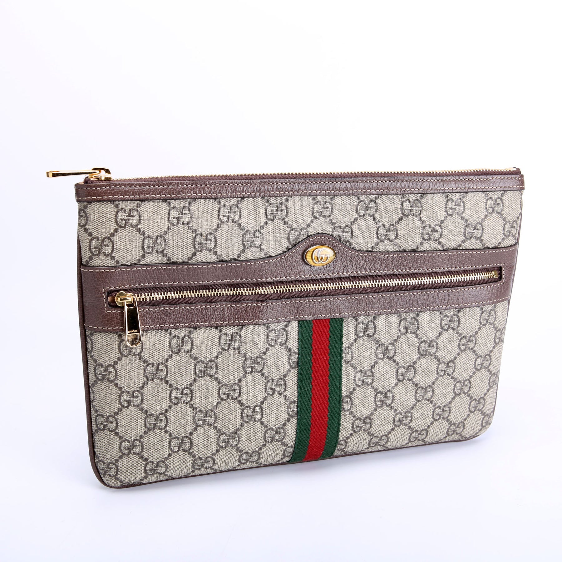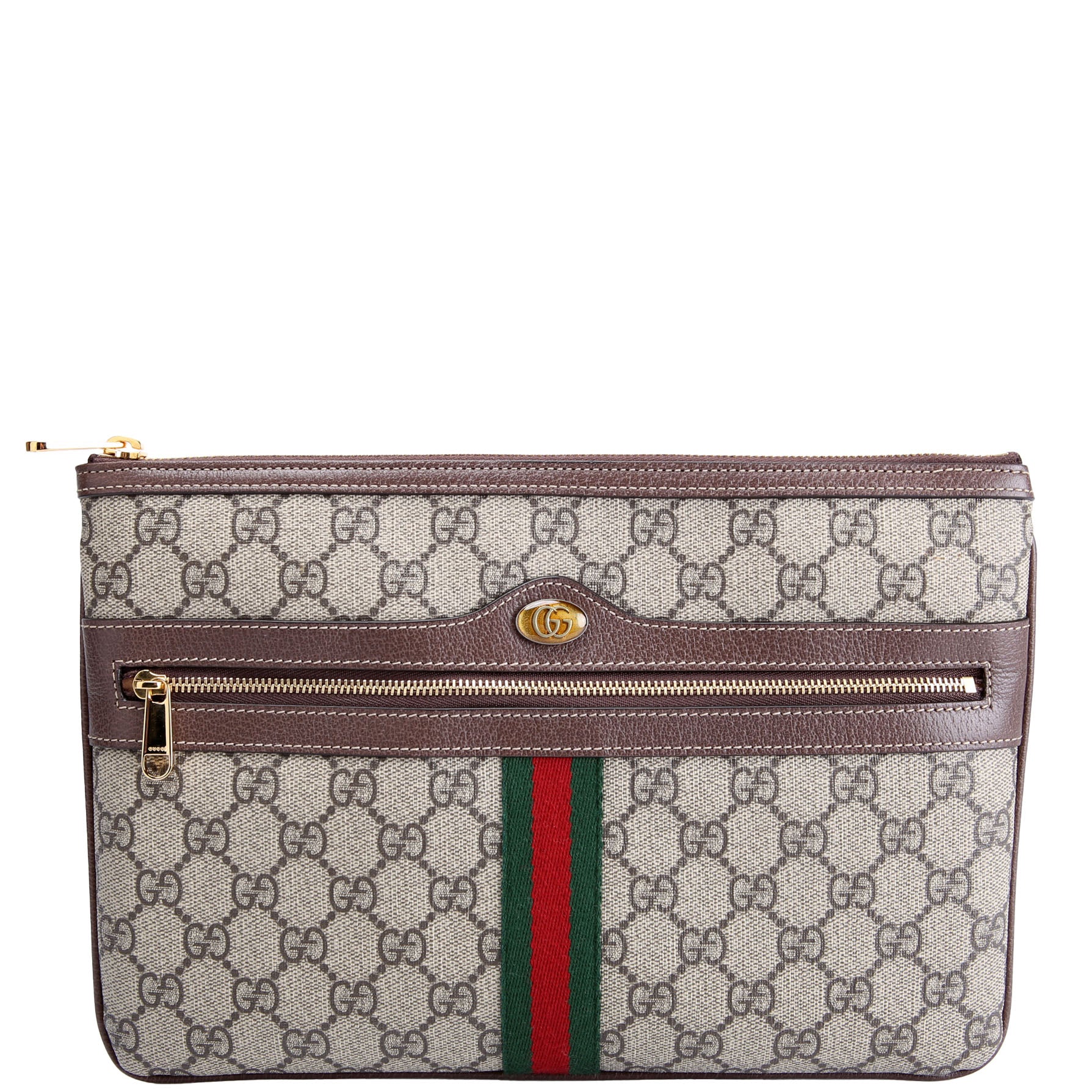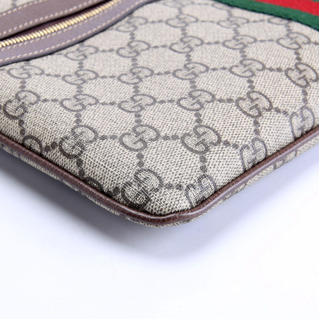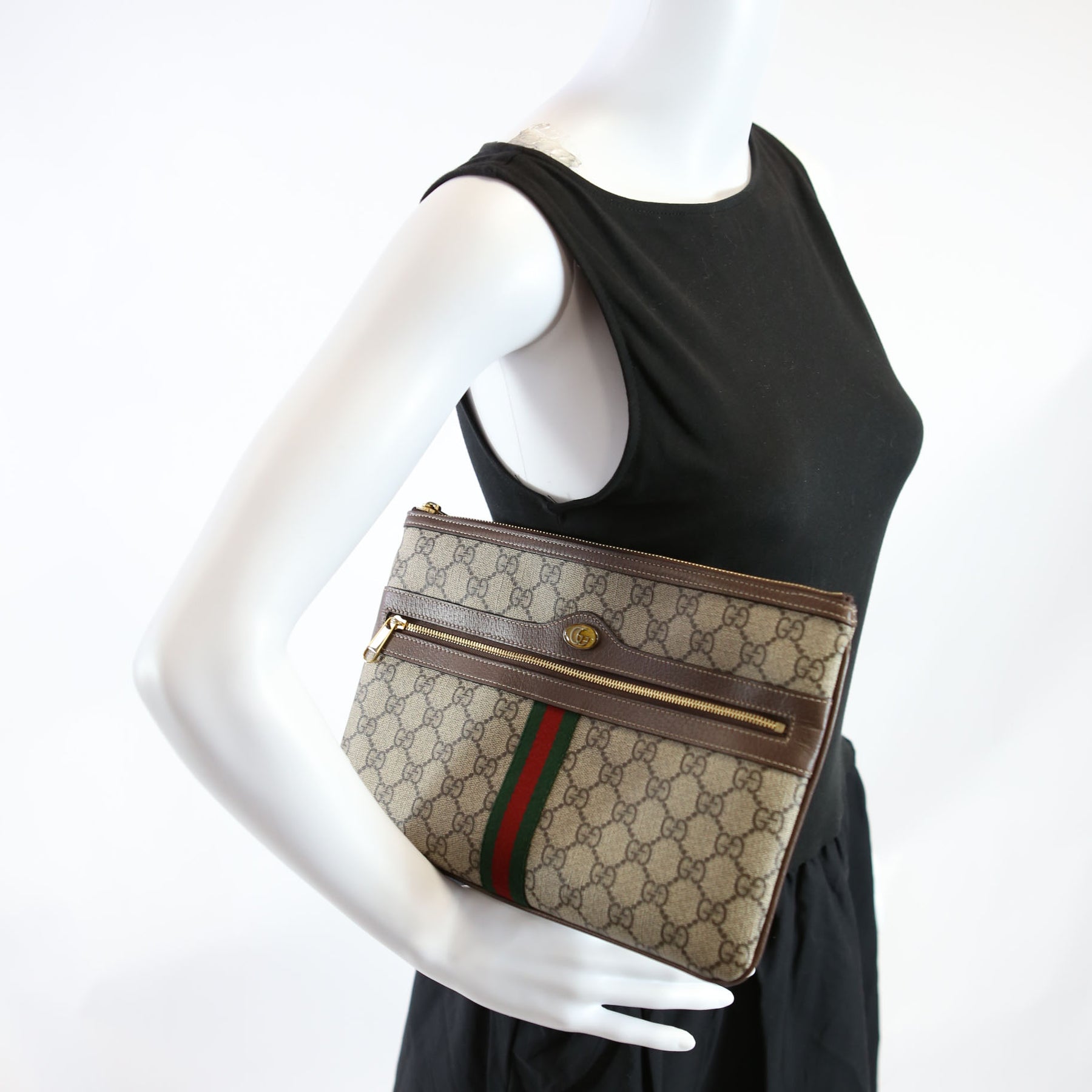 This pre-owned Gucci GG Supreme Ophidia Pouch is guaranteed 100% authentic. The exterior is in the classic Gucci GG Supreme coated canvas.