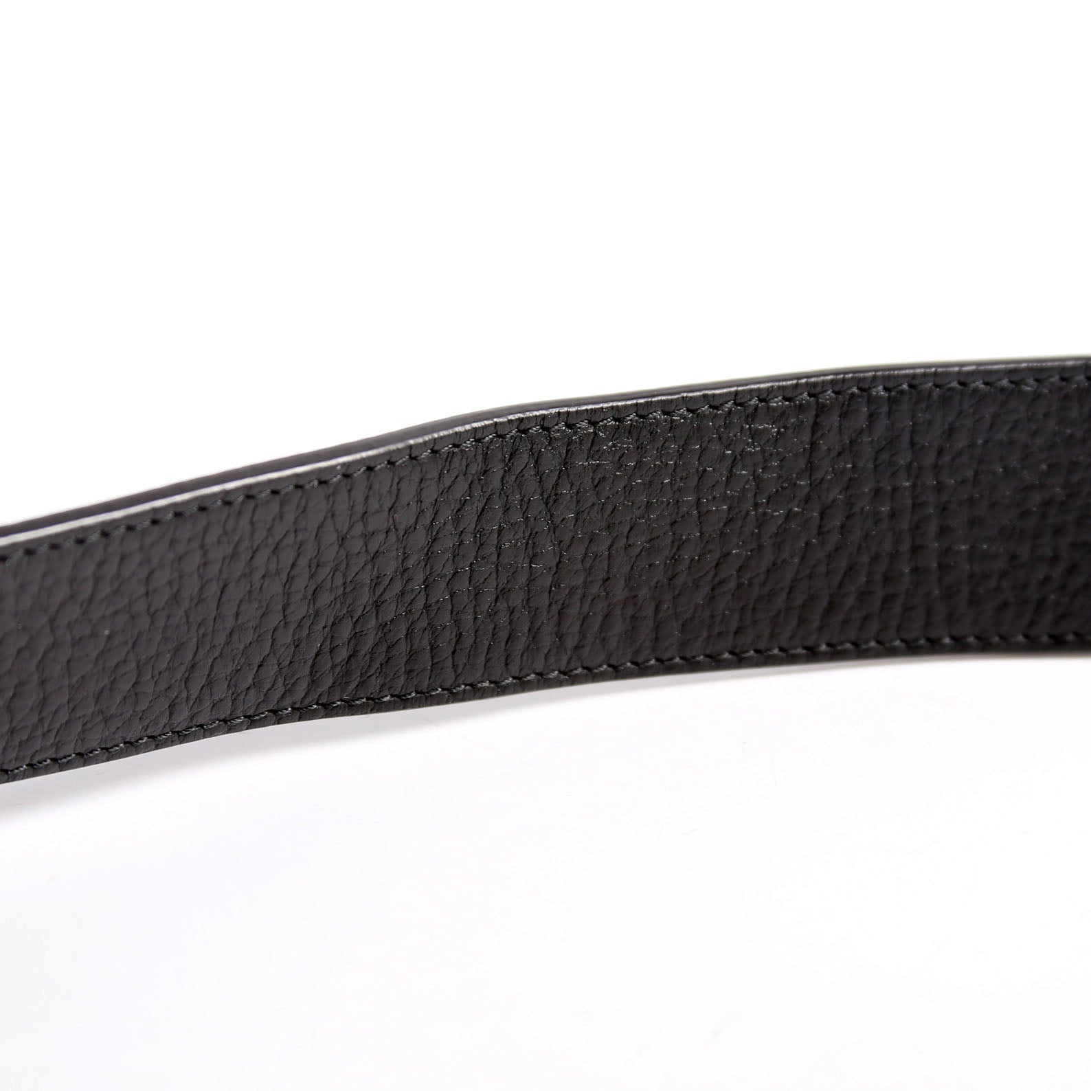 Exterior: The exterior leather is free from wear. There are minor bends and wrinkling to the leather throughout. The piping shows heavy indentions. This belt is missing the belt loop.