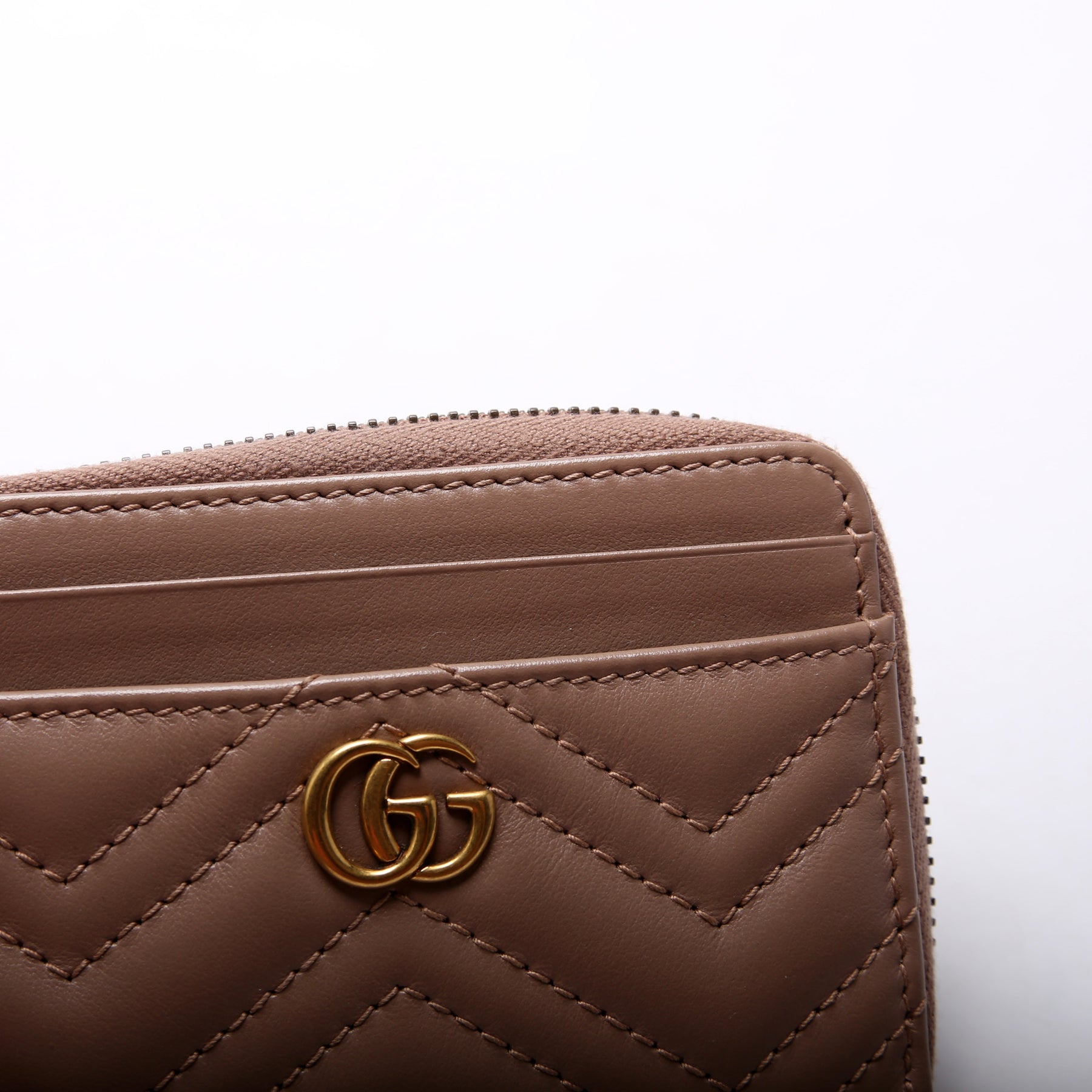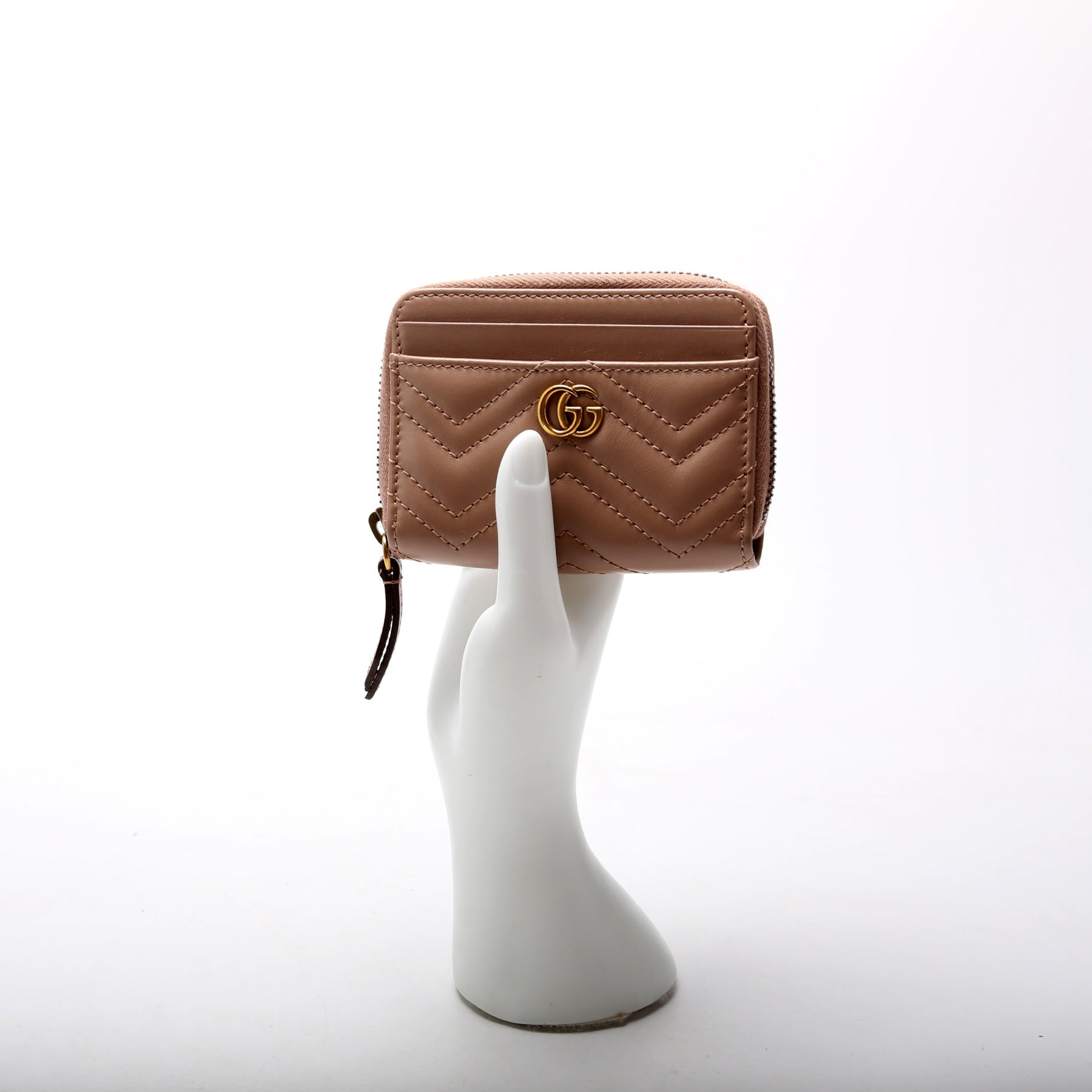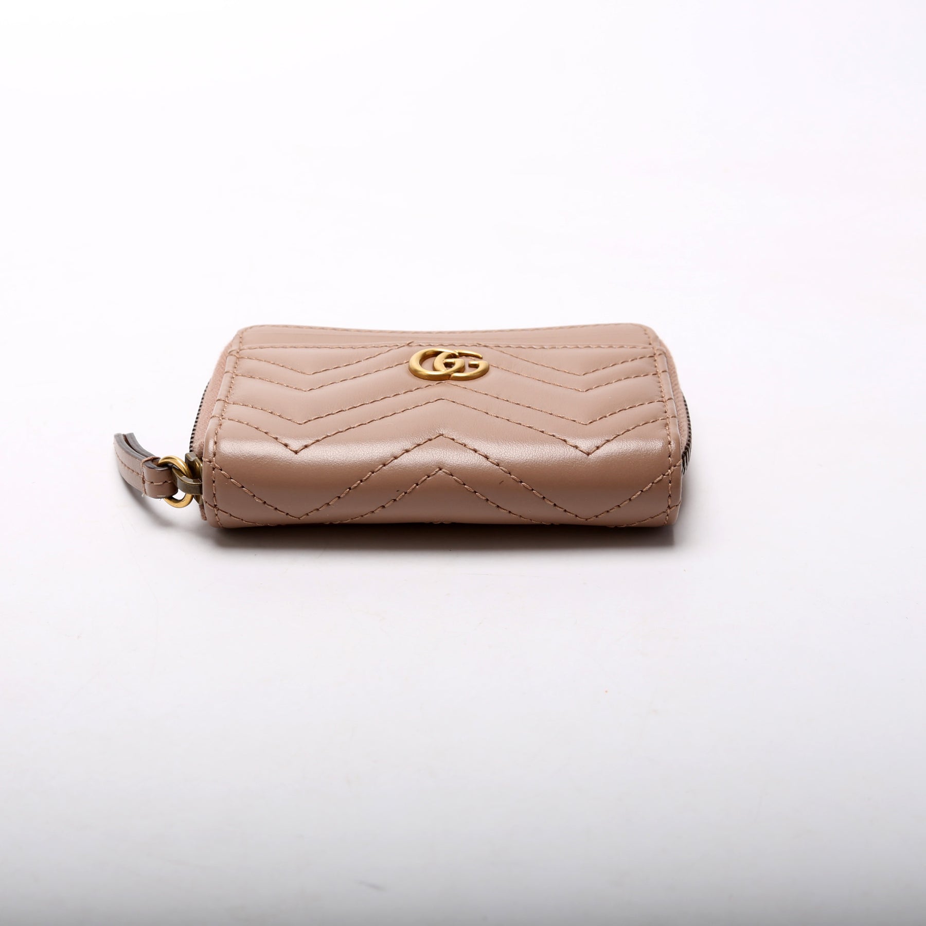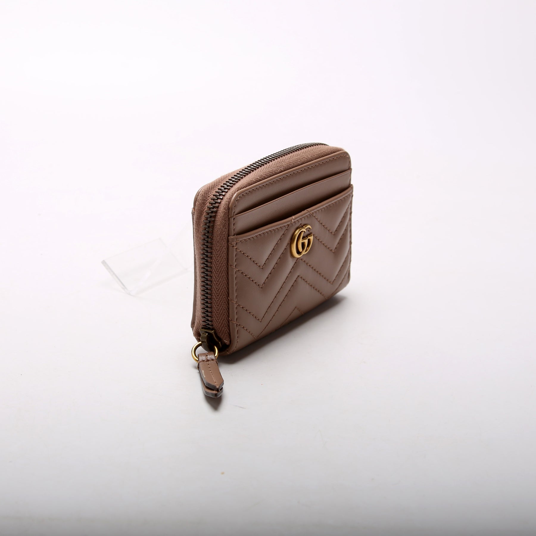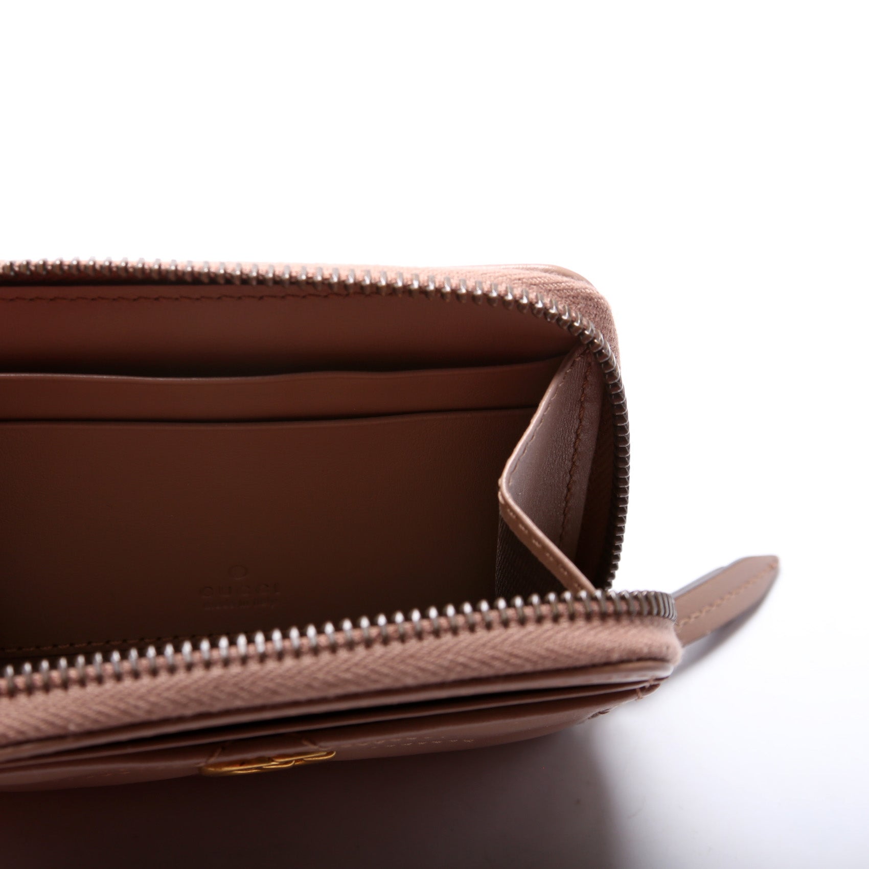 This pre-owned Gucci GG Marmont Zip Around Coin Card Holder is guaranteed 100% authentic. The exterior is in the classic Gucci Micro GG Marmont leather.