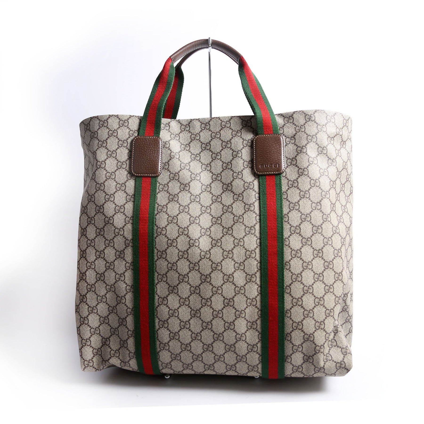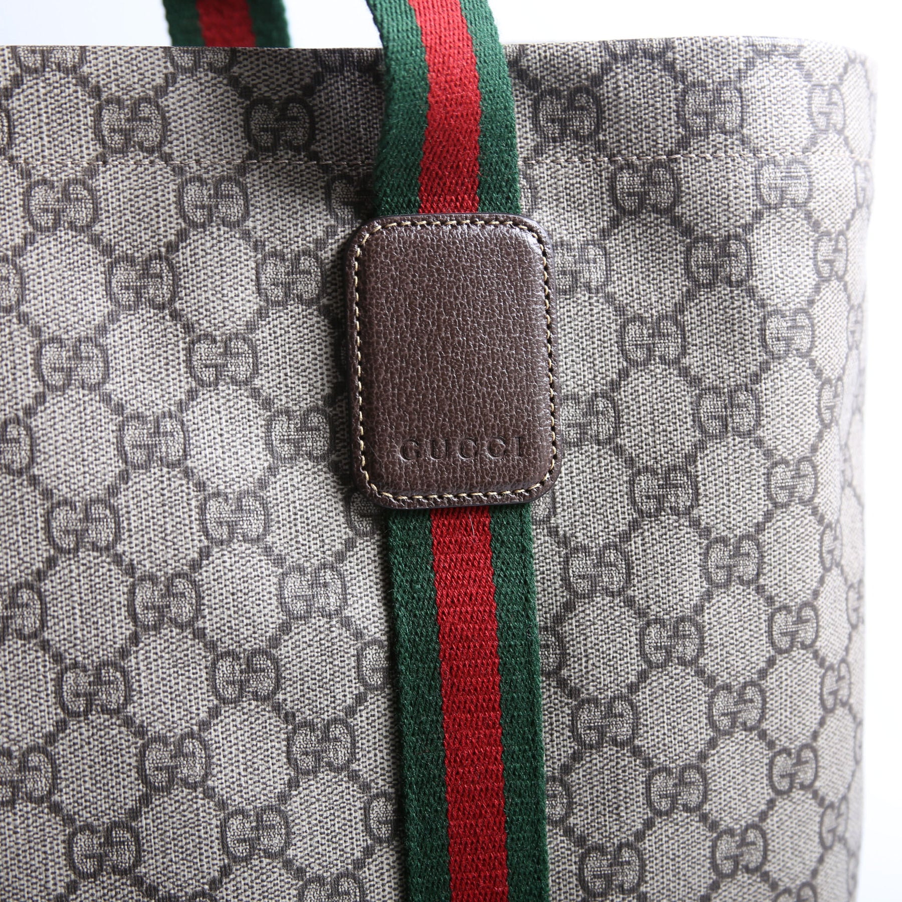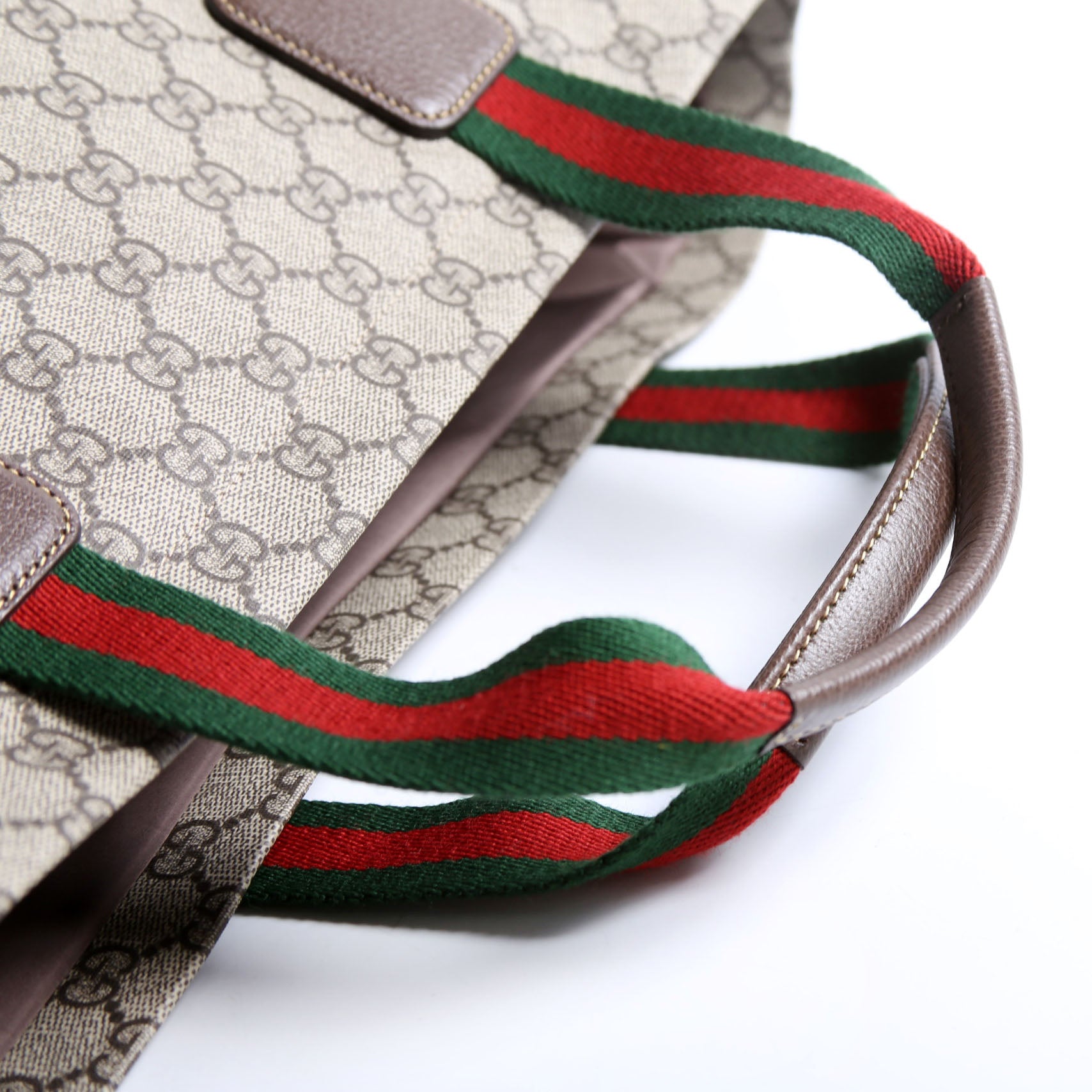 This pre-owned Gucci GG Supreme Web Tote Large is guaranteed 100% authentic. The exterior is in the classic Gucci GG Supreme coated canvas.