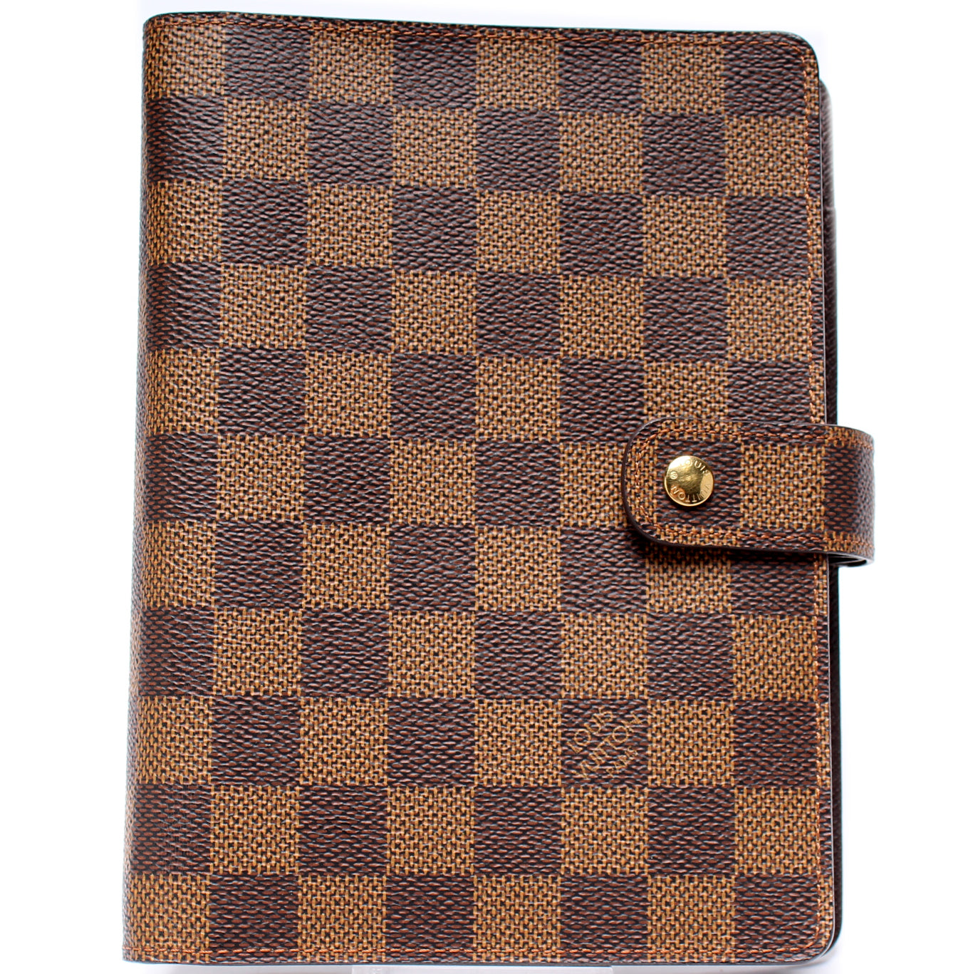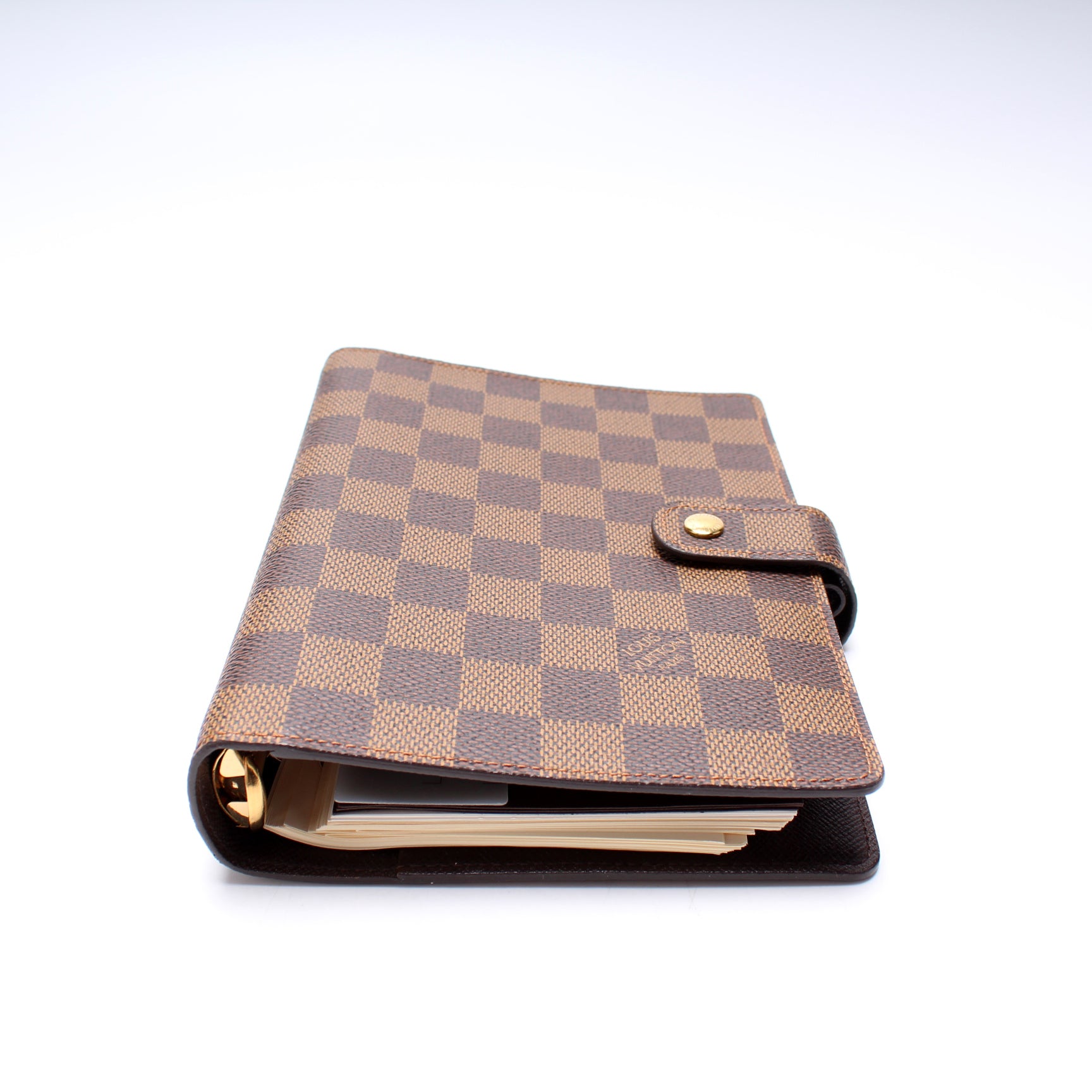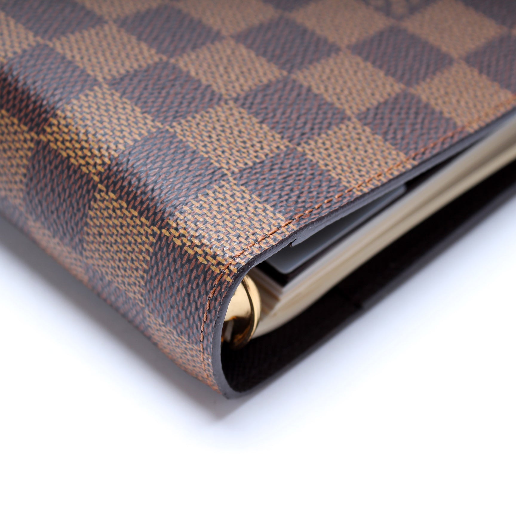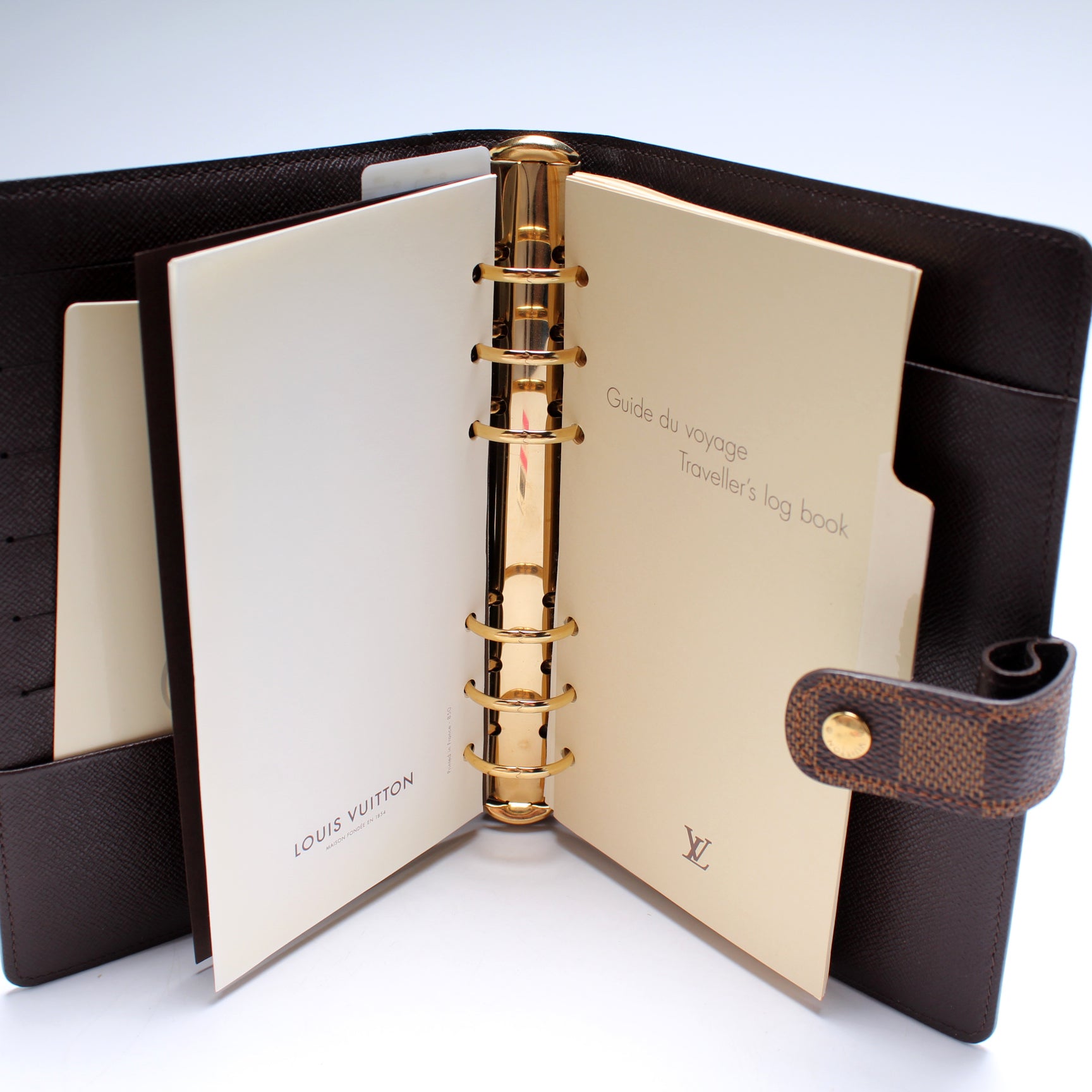 This pre-owned Louis Vuitton Agenda Medium Ring is guaranteed 100% authentic. The exterior is in the classic Louis Vuitton Damier Ebene coated canvas.