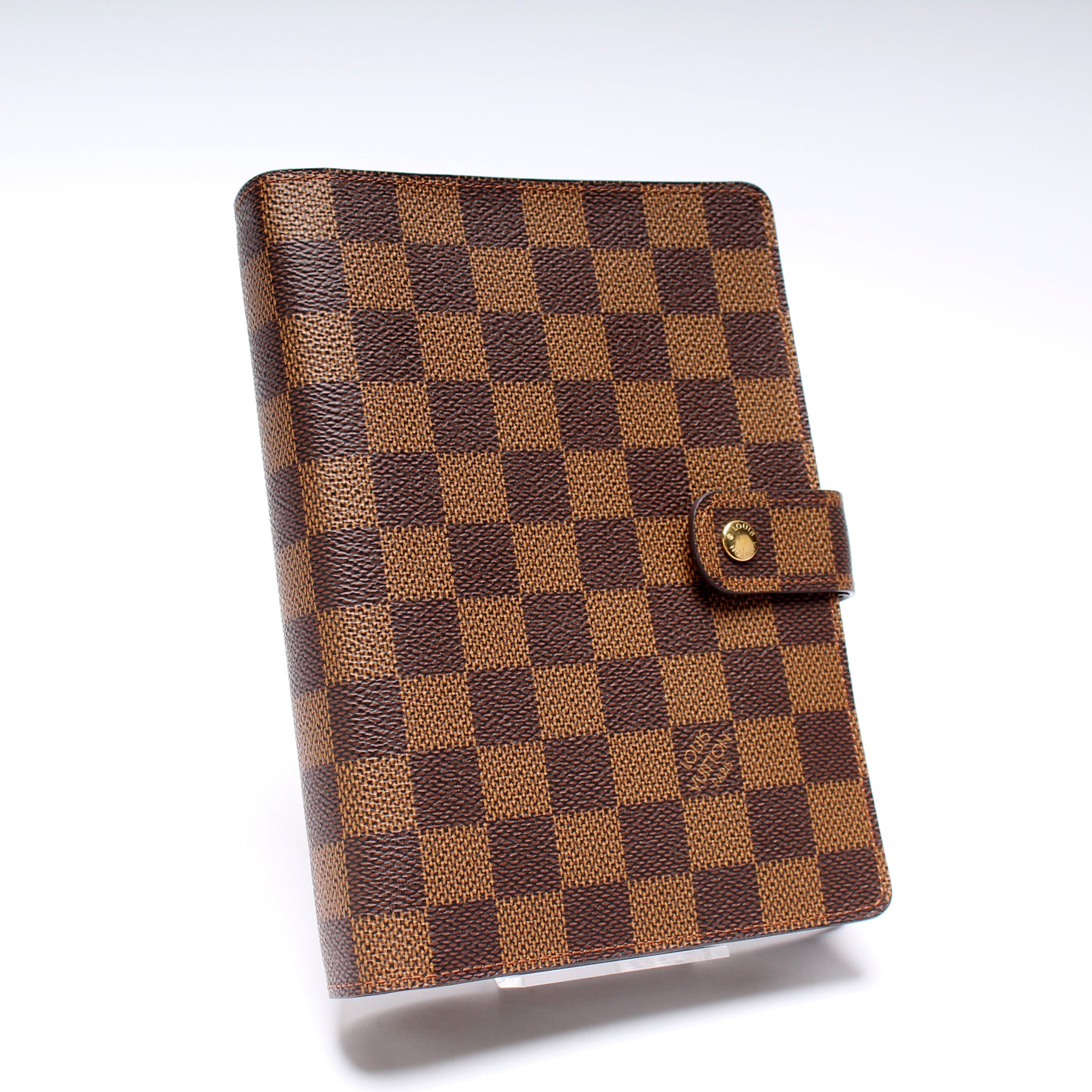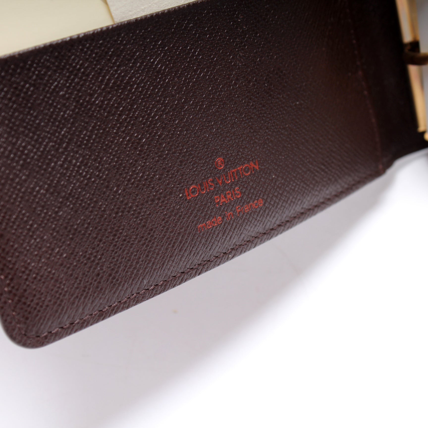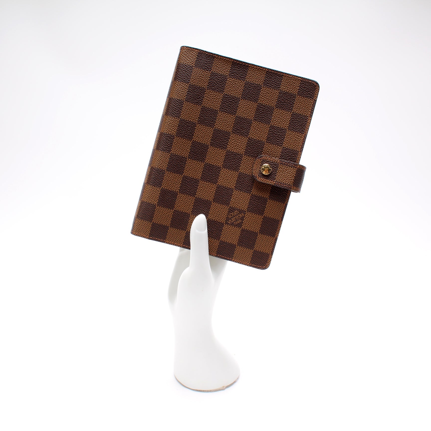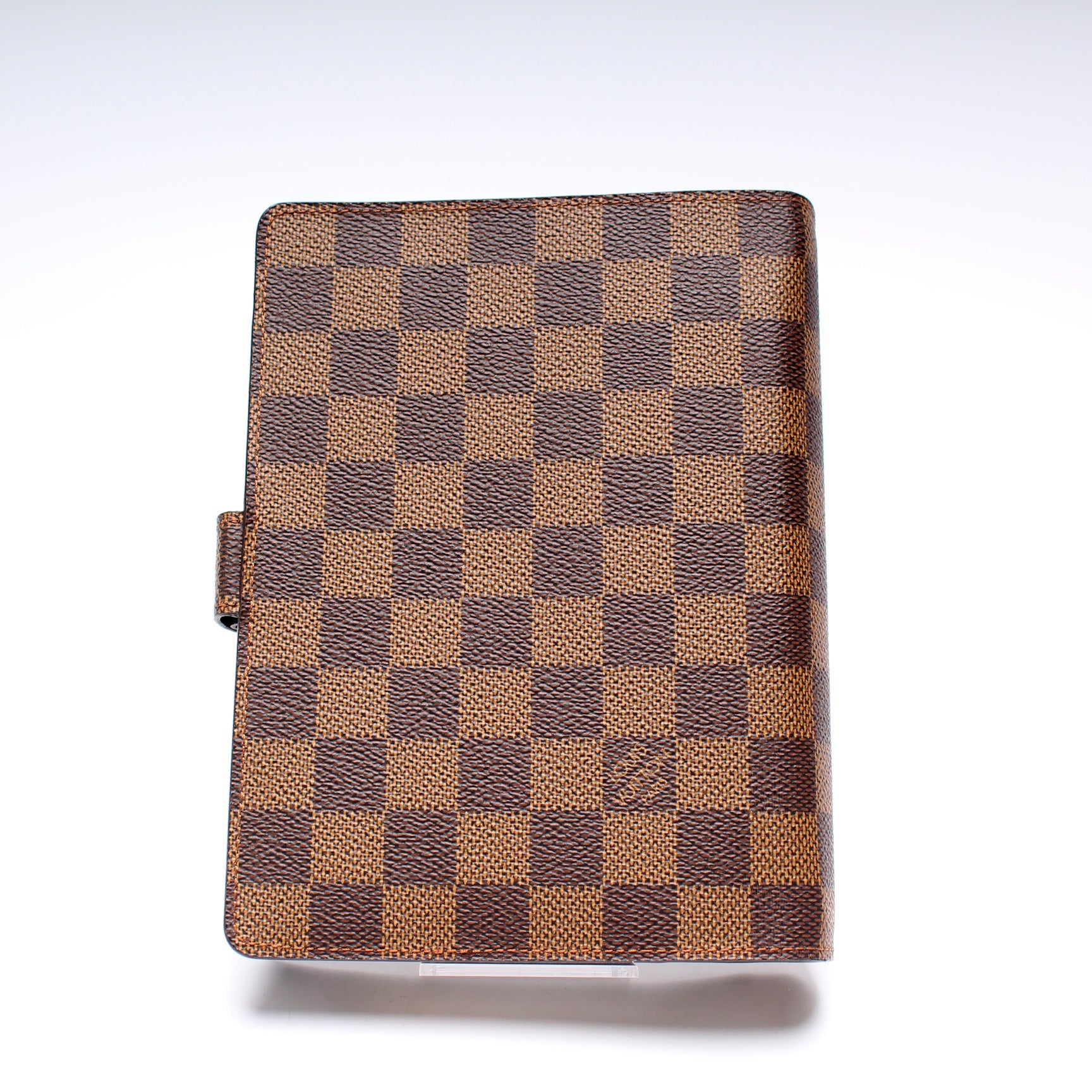 This pre-owned Louis Vuitton Agenda Medium Ring is guaranteed 100% authentic. The exterior is in the classic Louis Vuitton Damier Ebene coated canvas.
