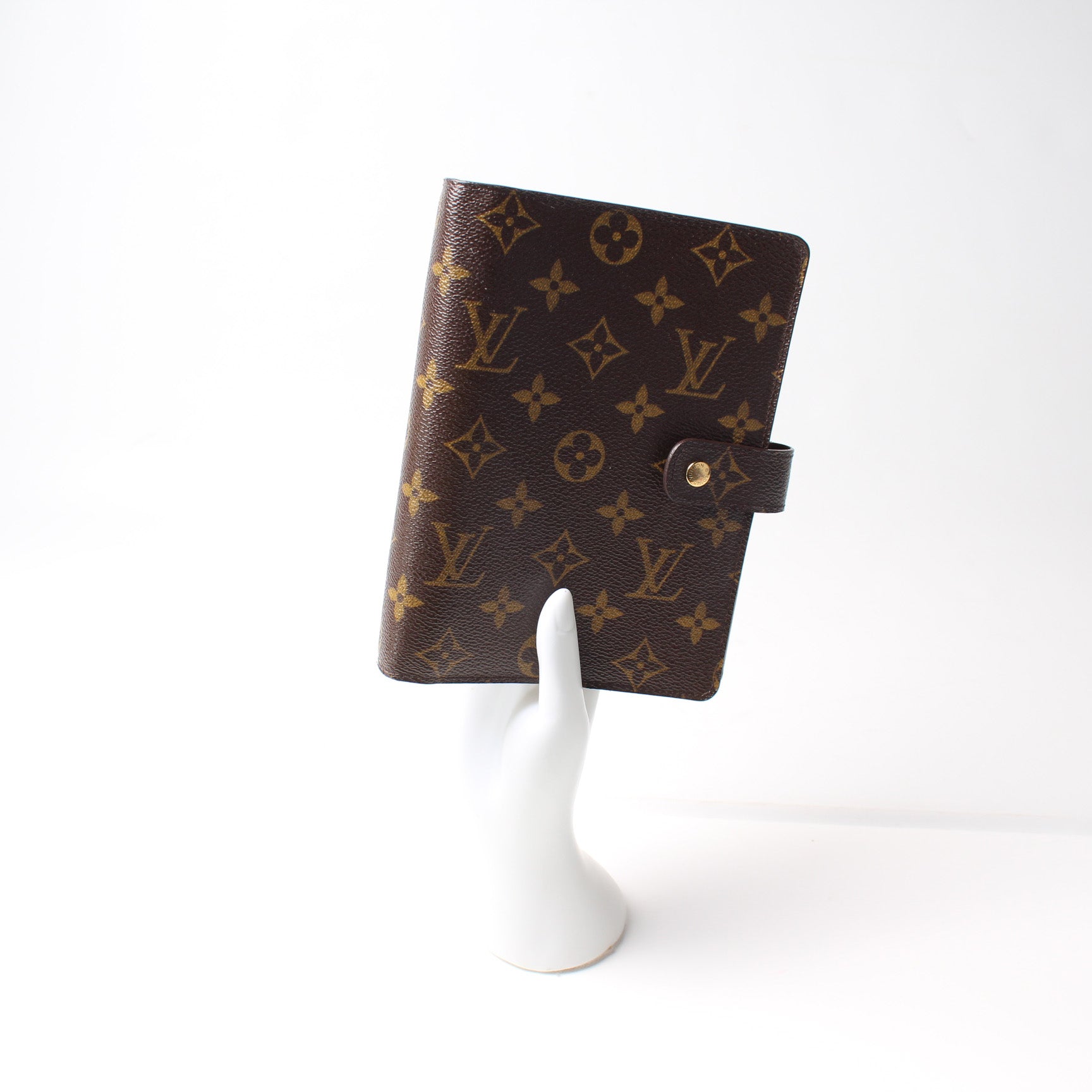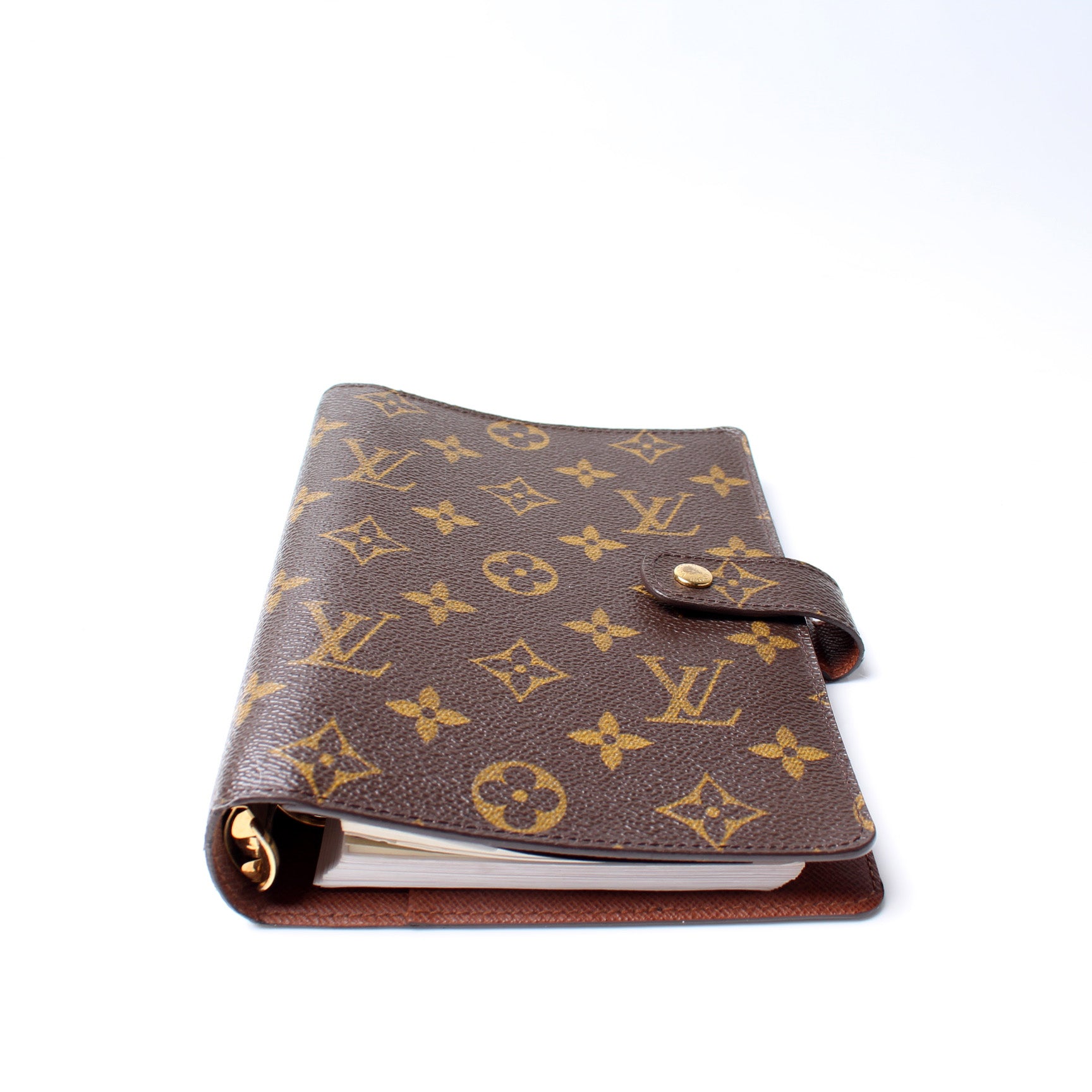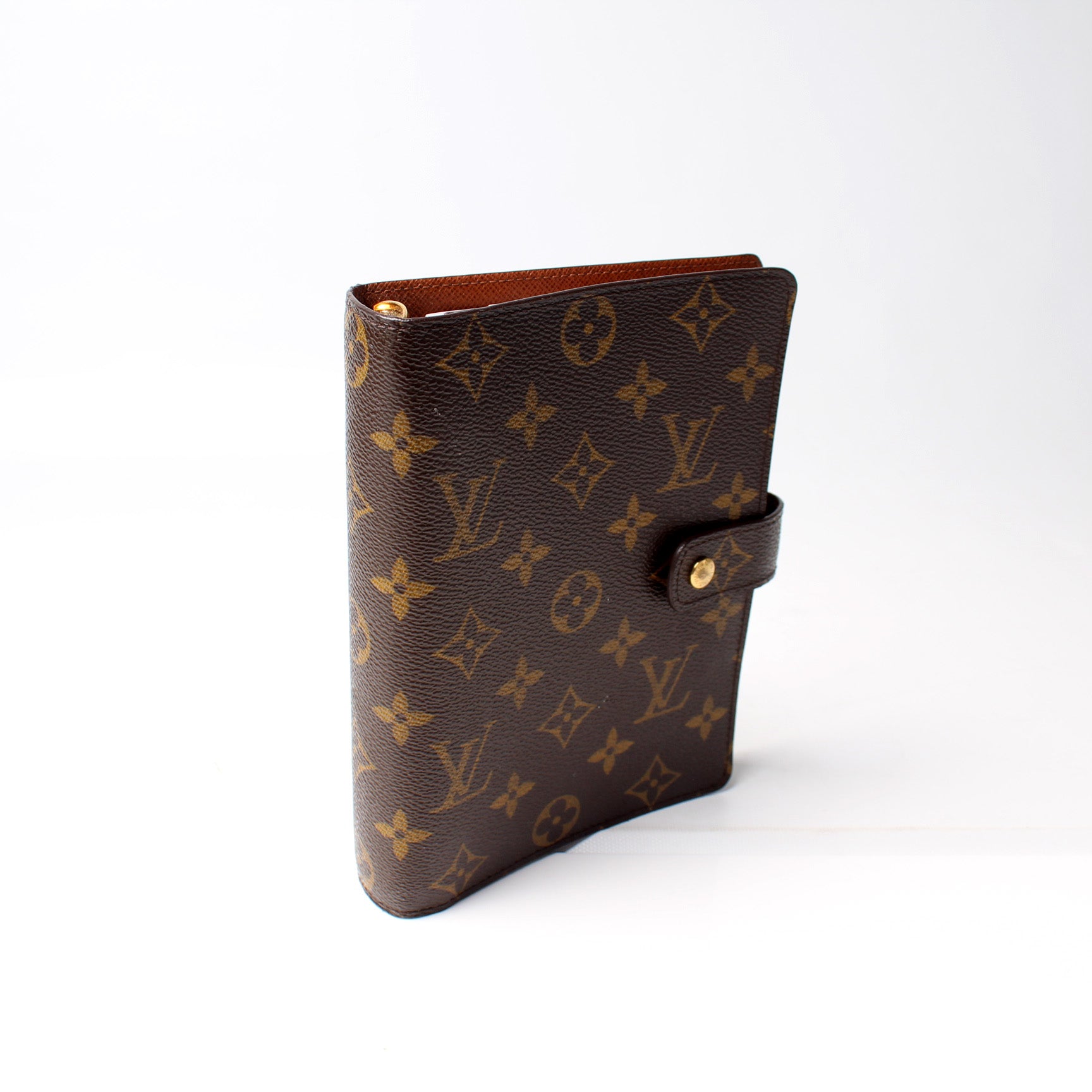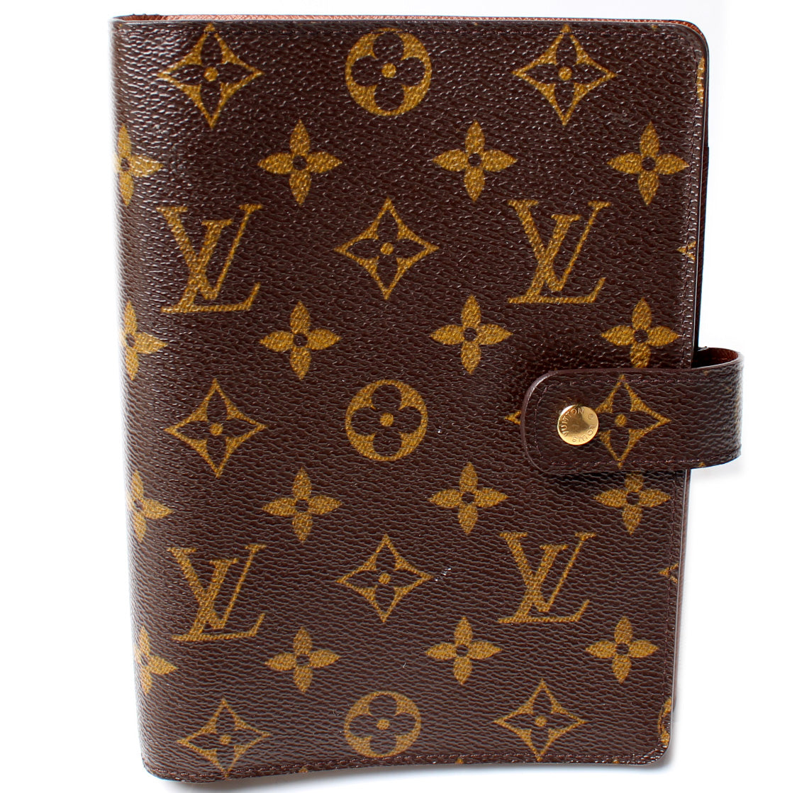 This pre-owned Louis Vuitton Agenda Medium Ring is guaranteed 100% authentic. The exterior is in the classic Louis Vuitton Monogram coated canvas.