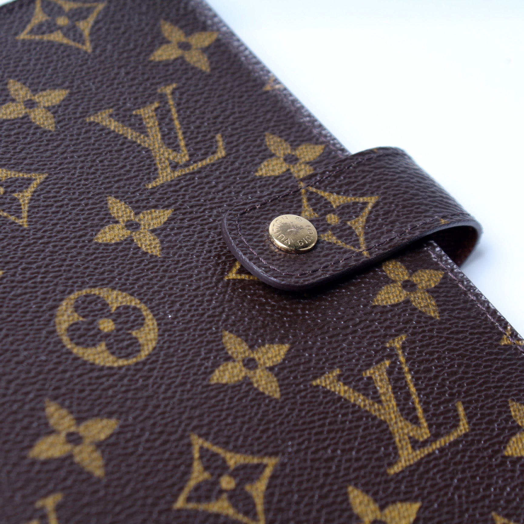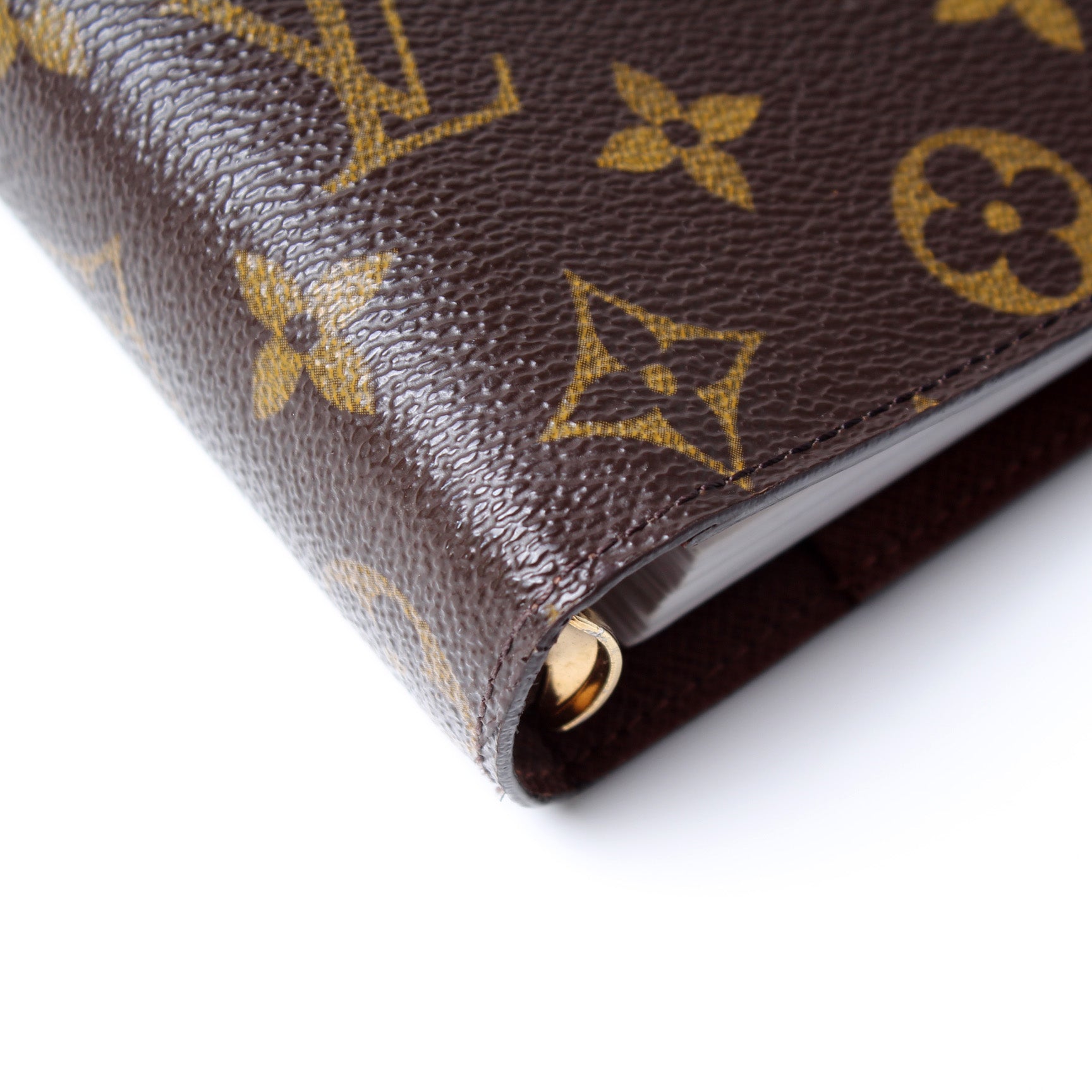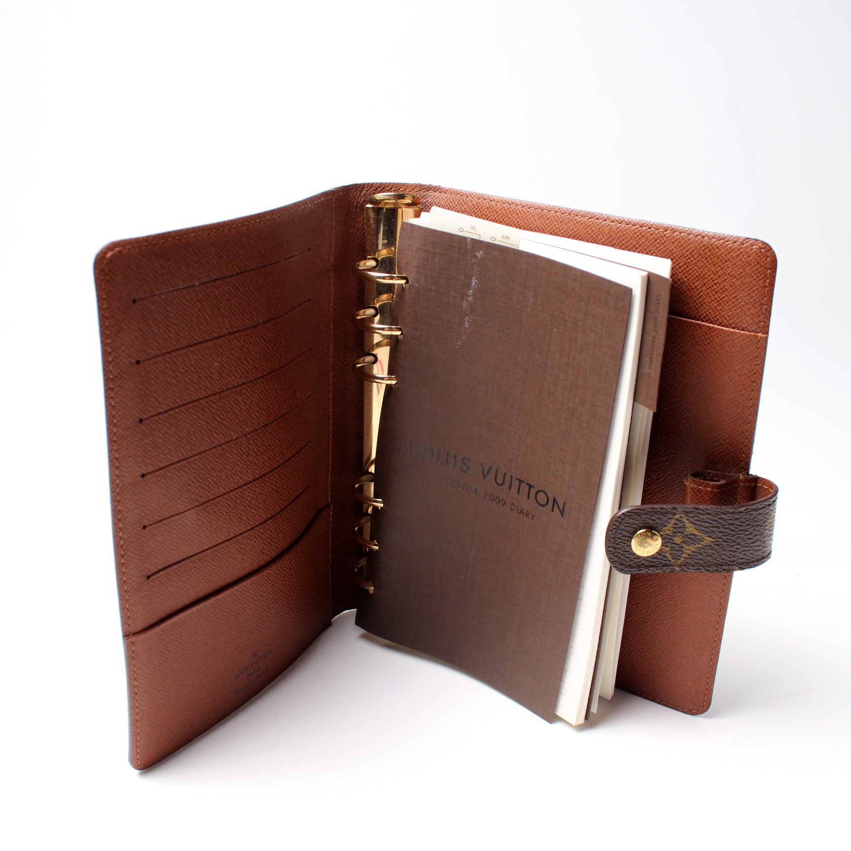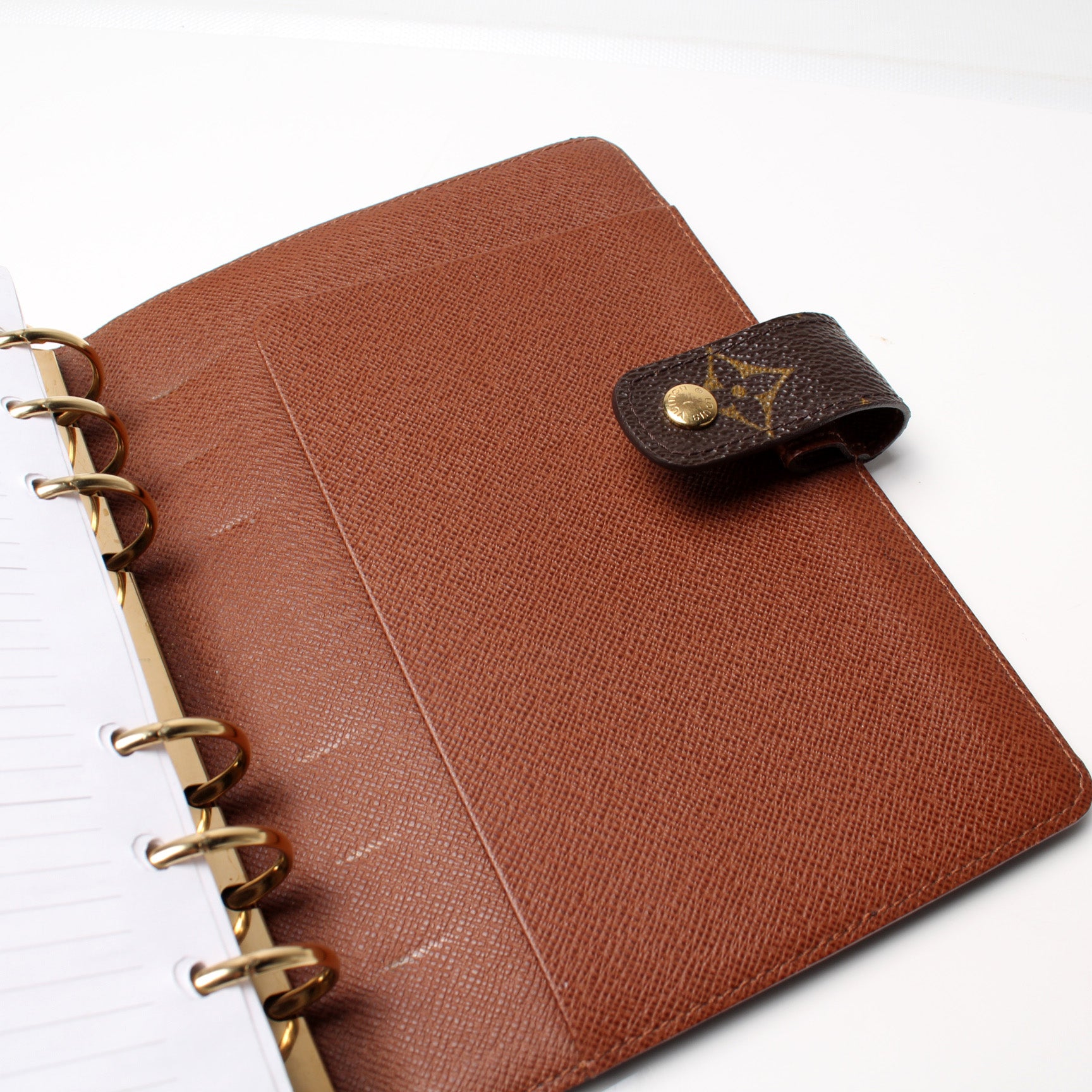 This pre-owned Louis Vuitton Agenda Medium Ring is guaranteed 100% authentic. The exterior is in the classic Louis Vuitton Monogram coated canvas.