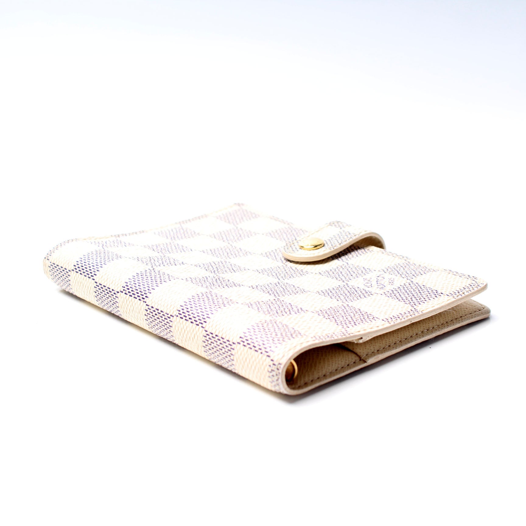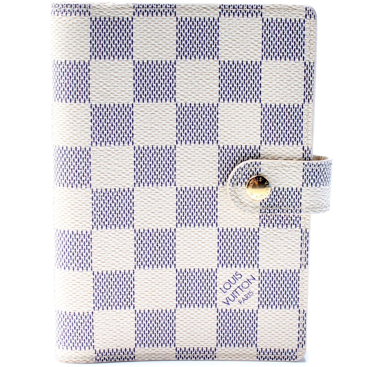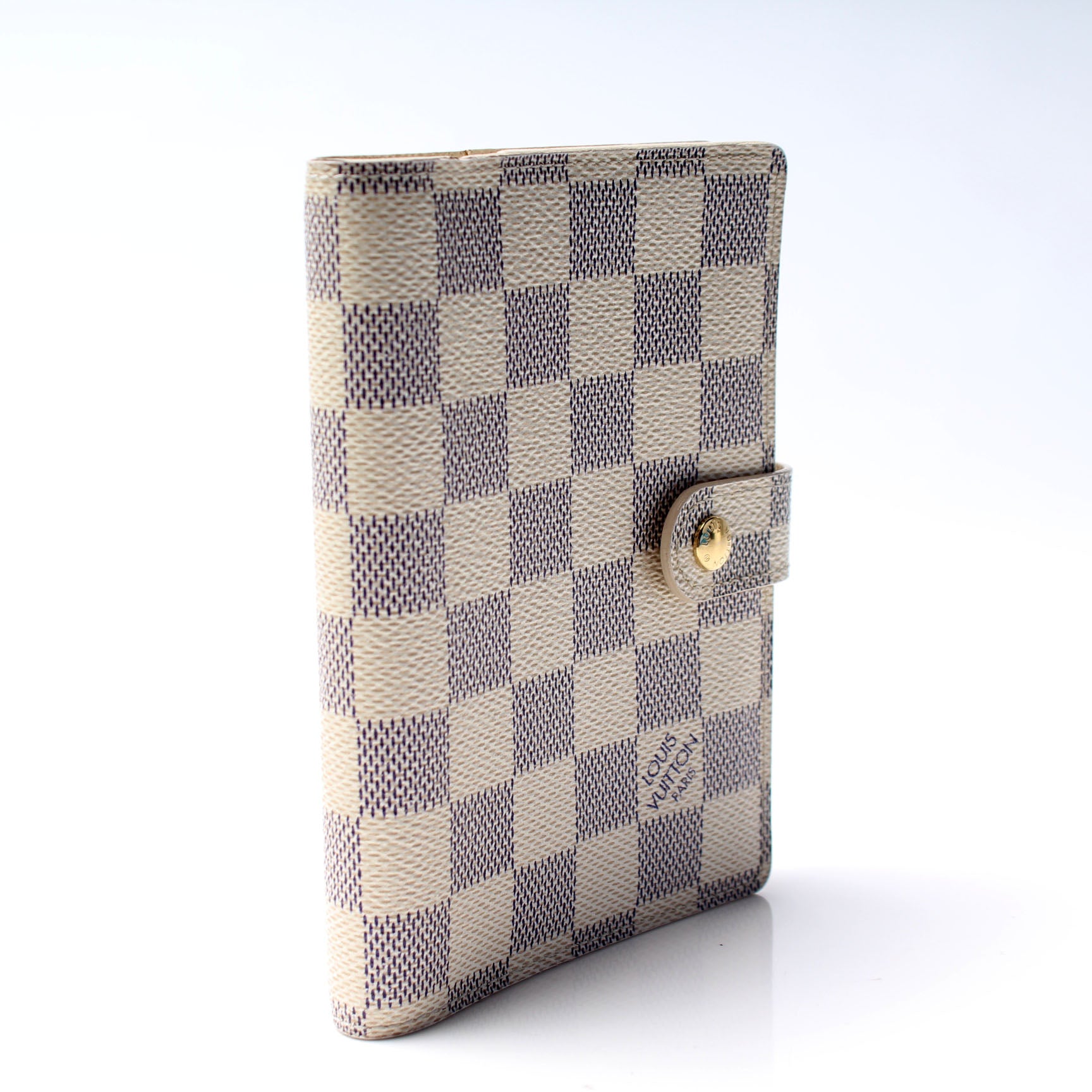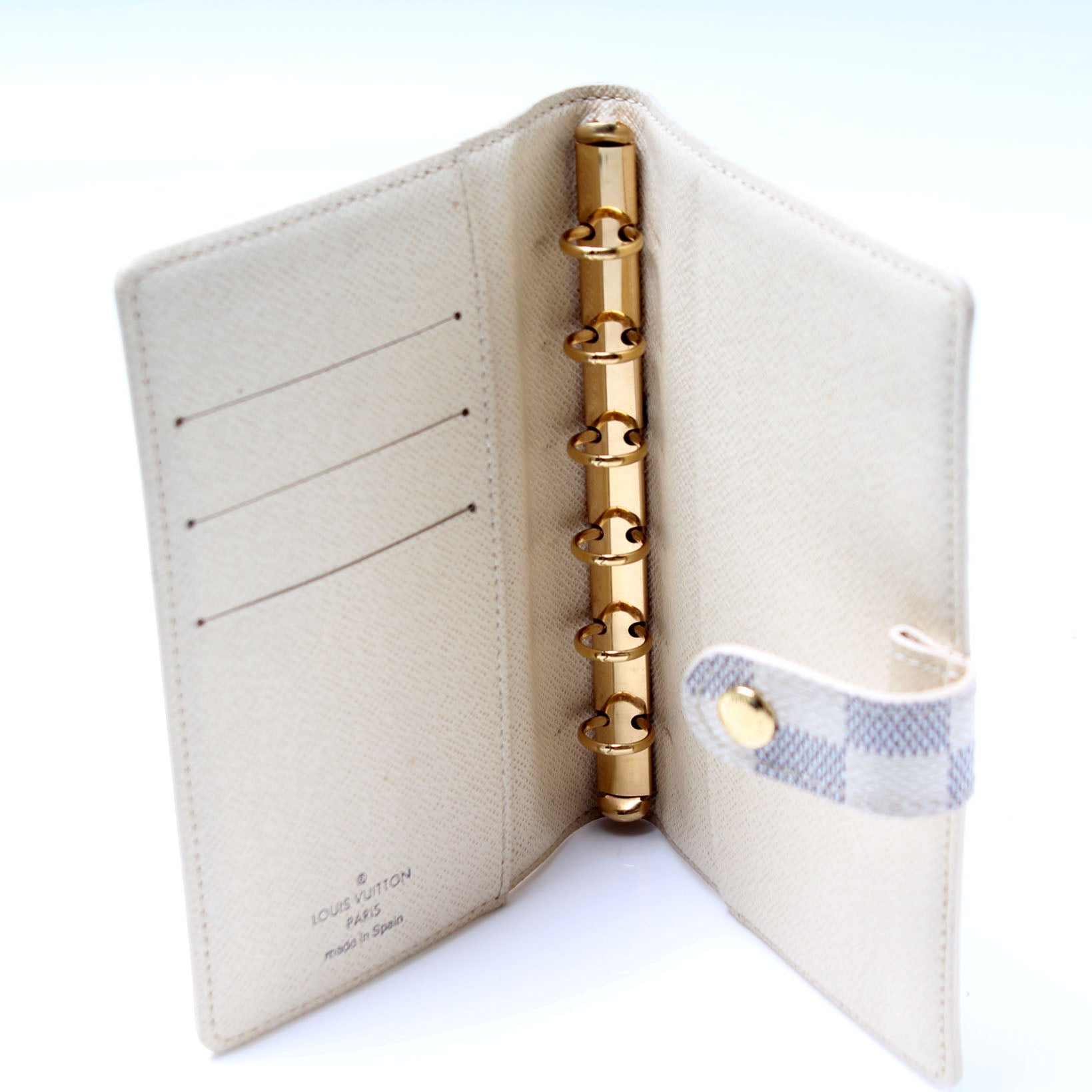 This pre-owned Louis Vuitton Agenda Small Ring is guaranteed 100% authentic. The exterior is in the classic Louis Vuitton Damier Azur coated canvas.