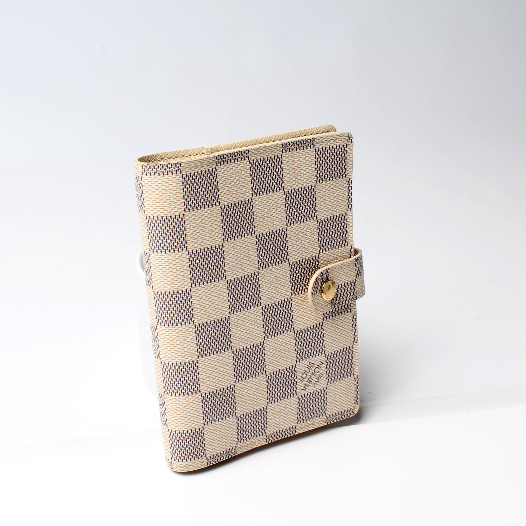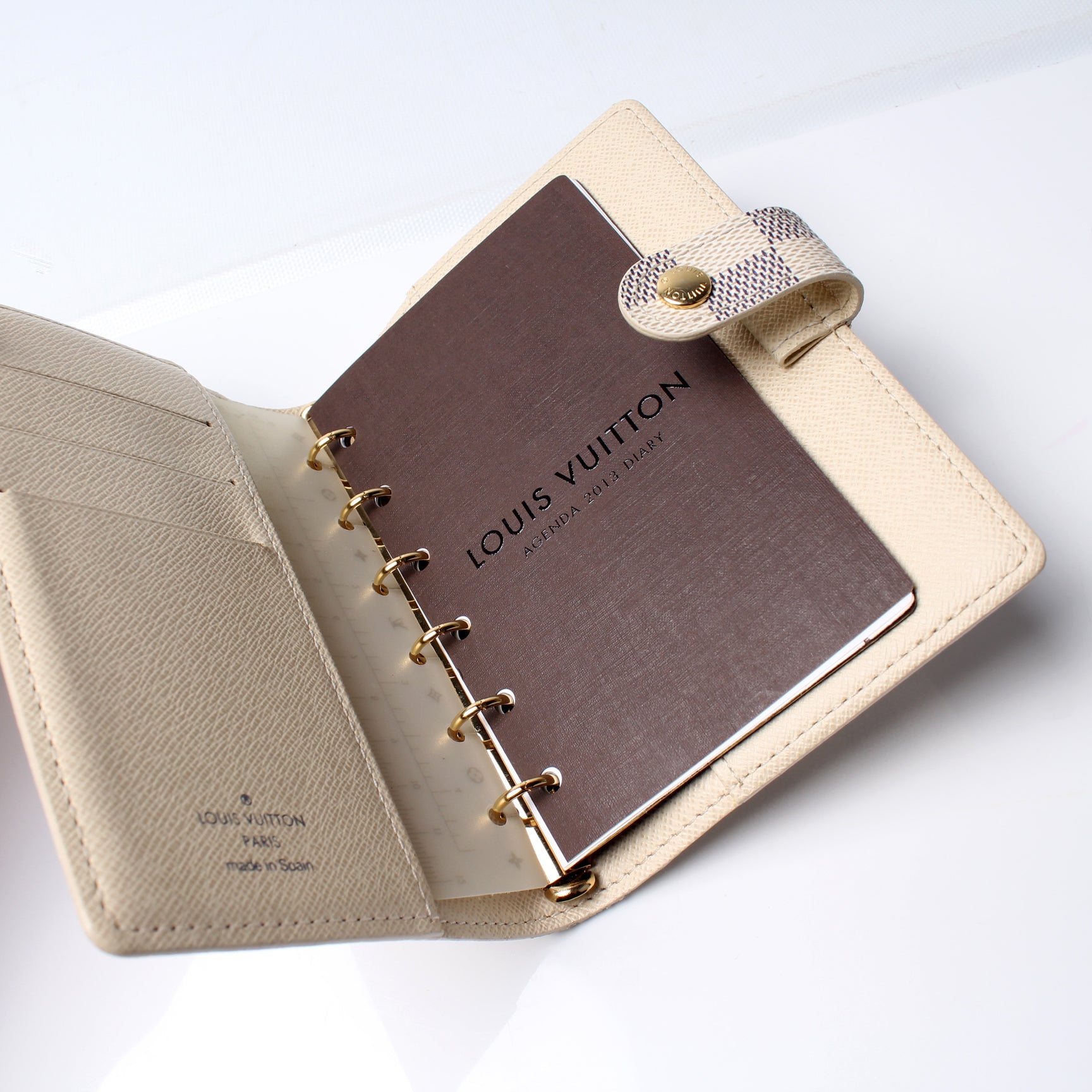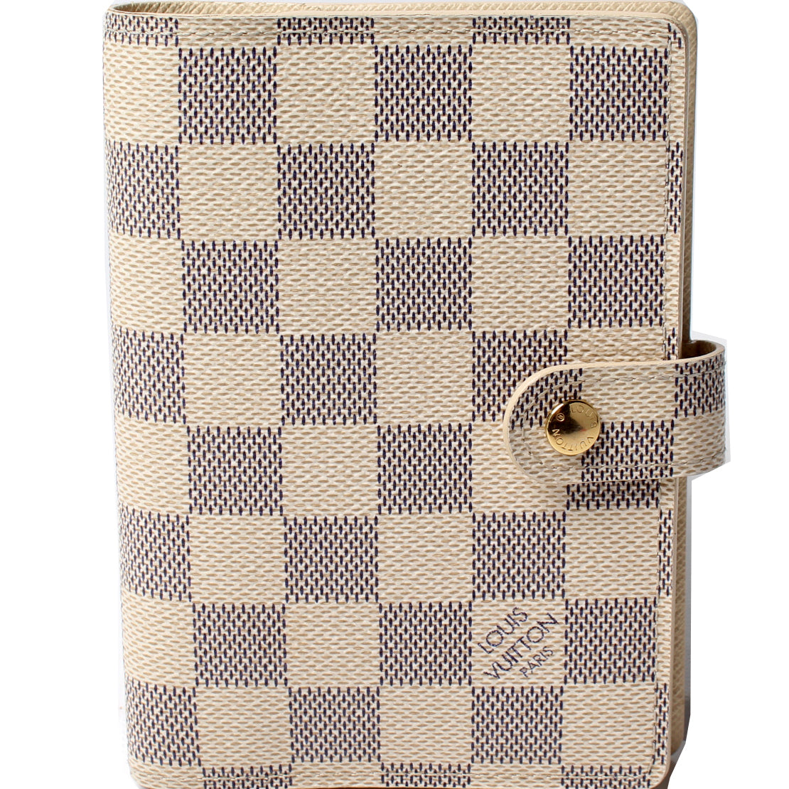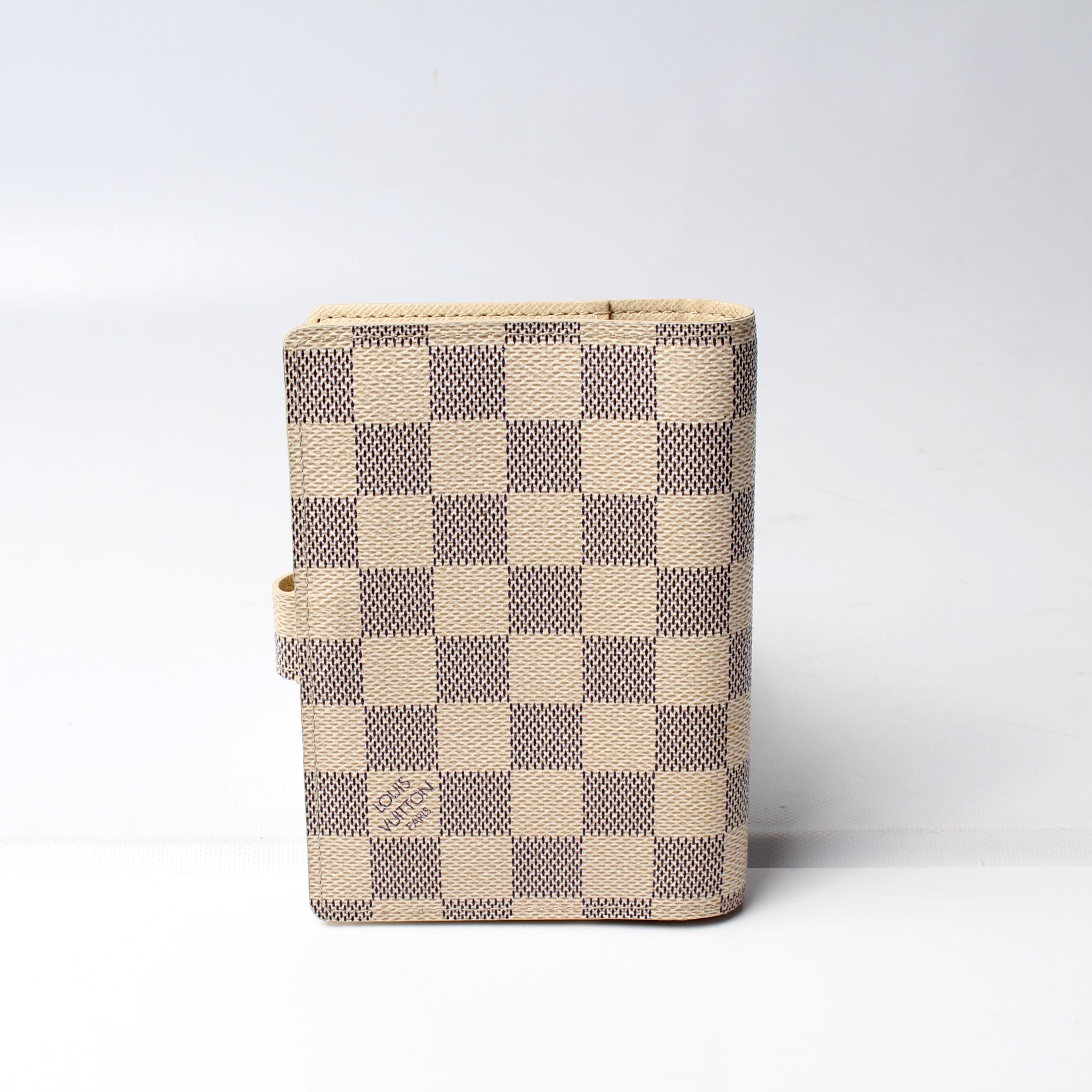 This pre-owned Louis Vuitton Agenda Small Ring is guaranteed 100% authentic. The exterior is in the classic Louis Vuitton Damier Azur coated canvas.