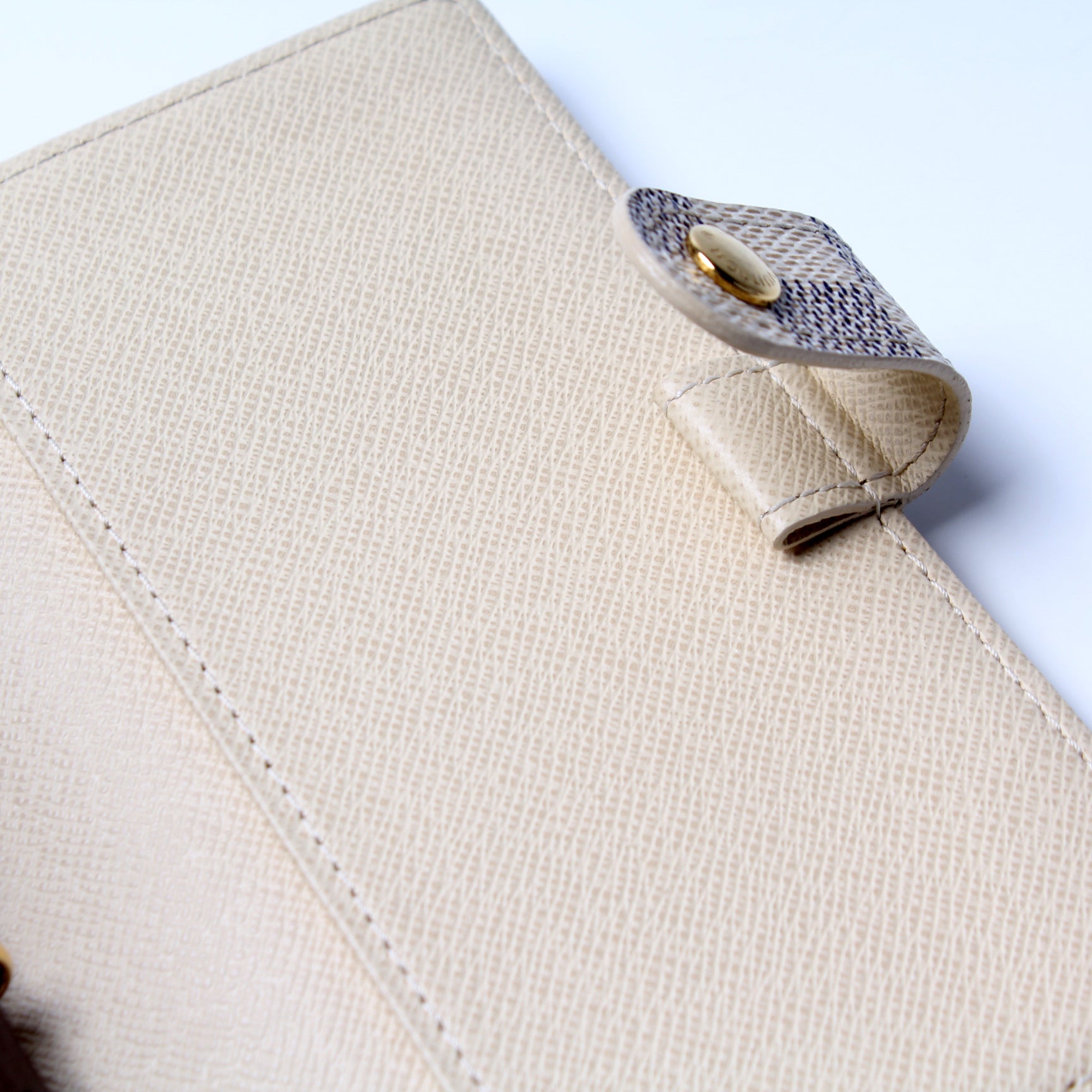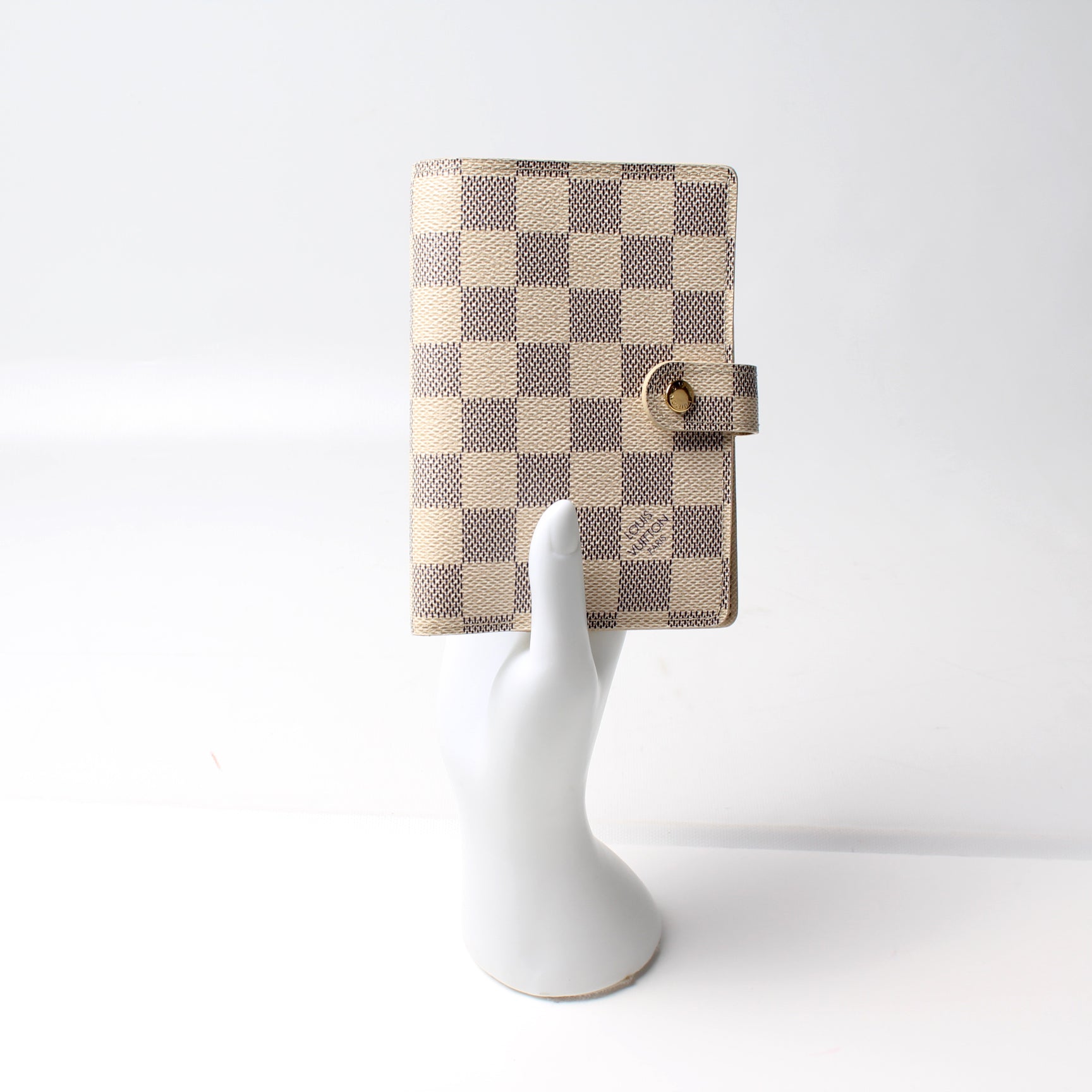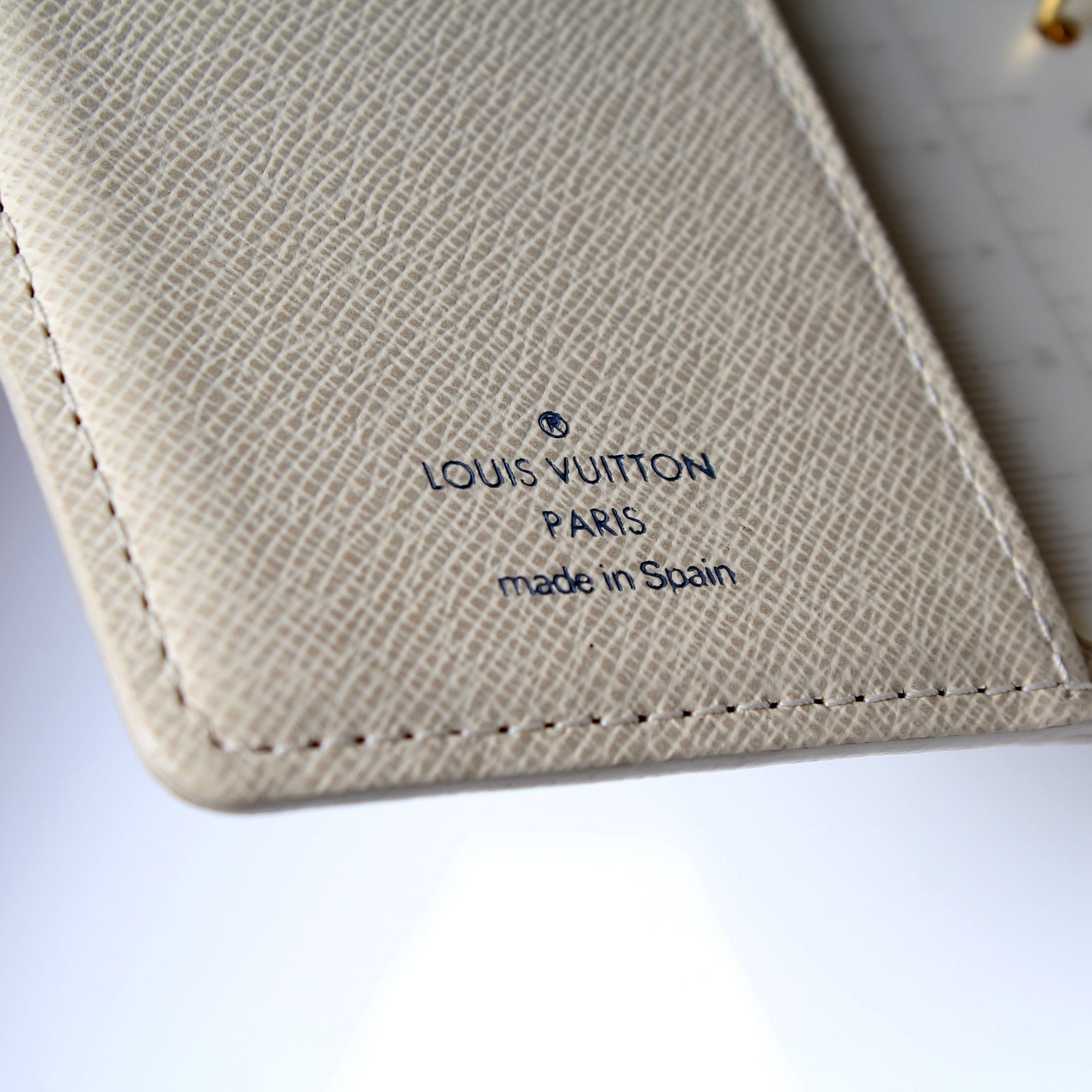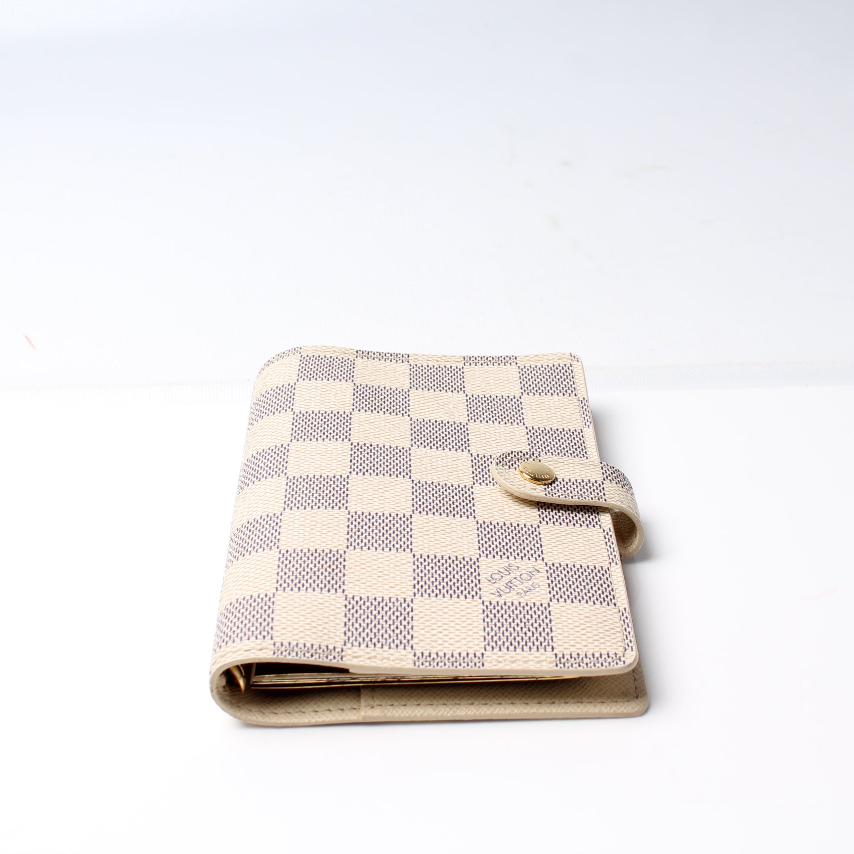 This pre-owned Louis Vuitton Agenda Small Ring is guaranteed 100% authentic. The exterior is in the classic Louis Vuitton Damier Azur coated canvas.