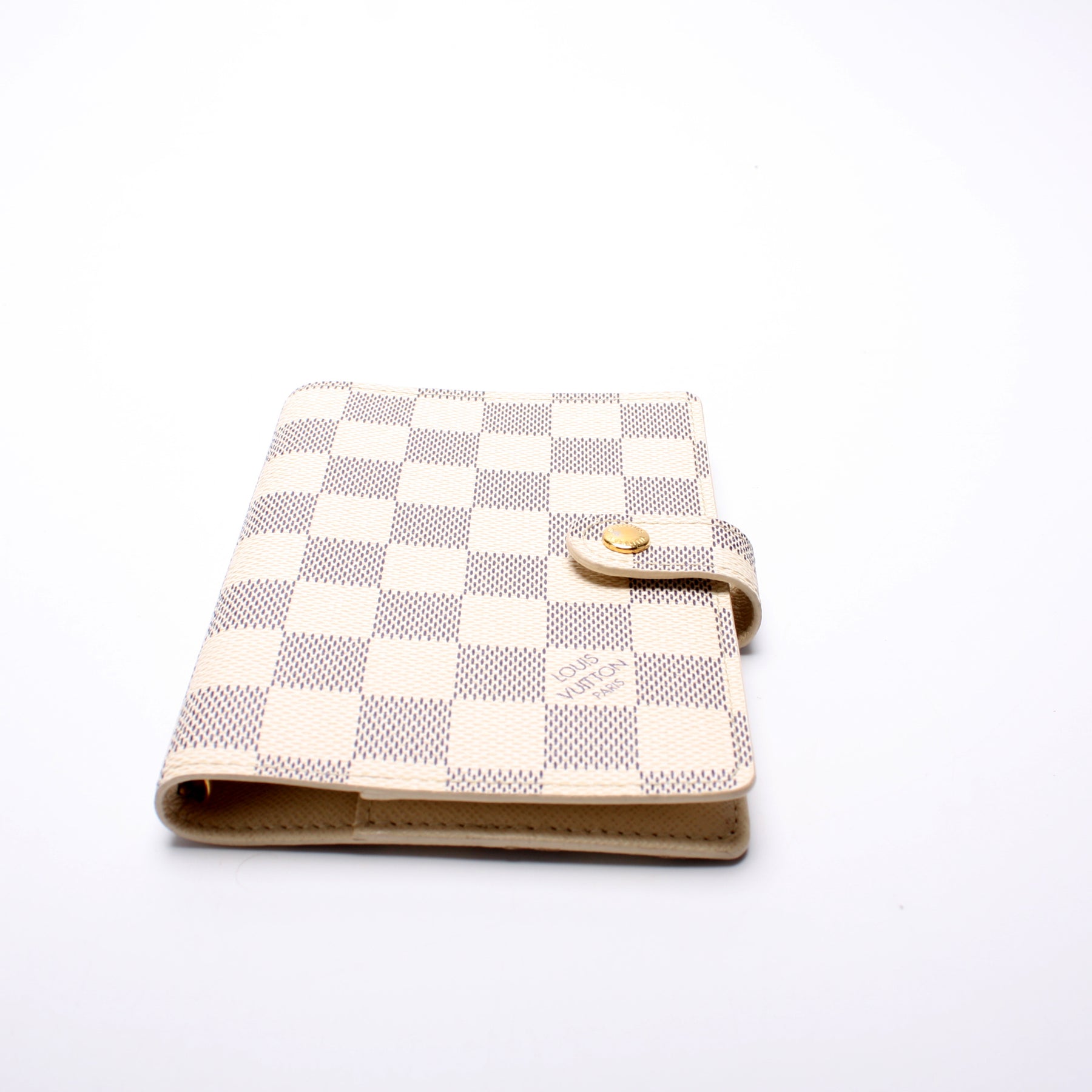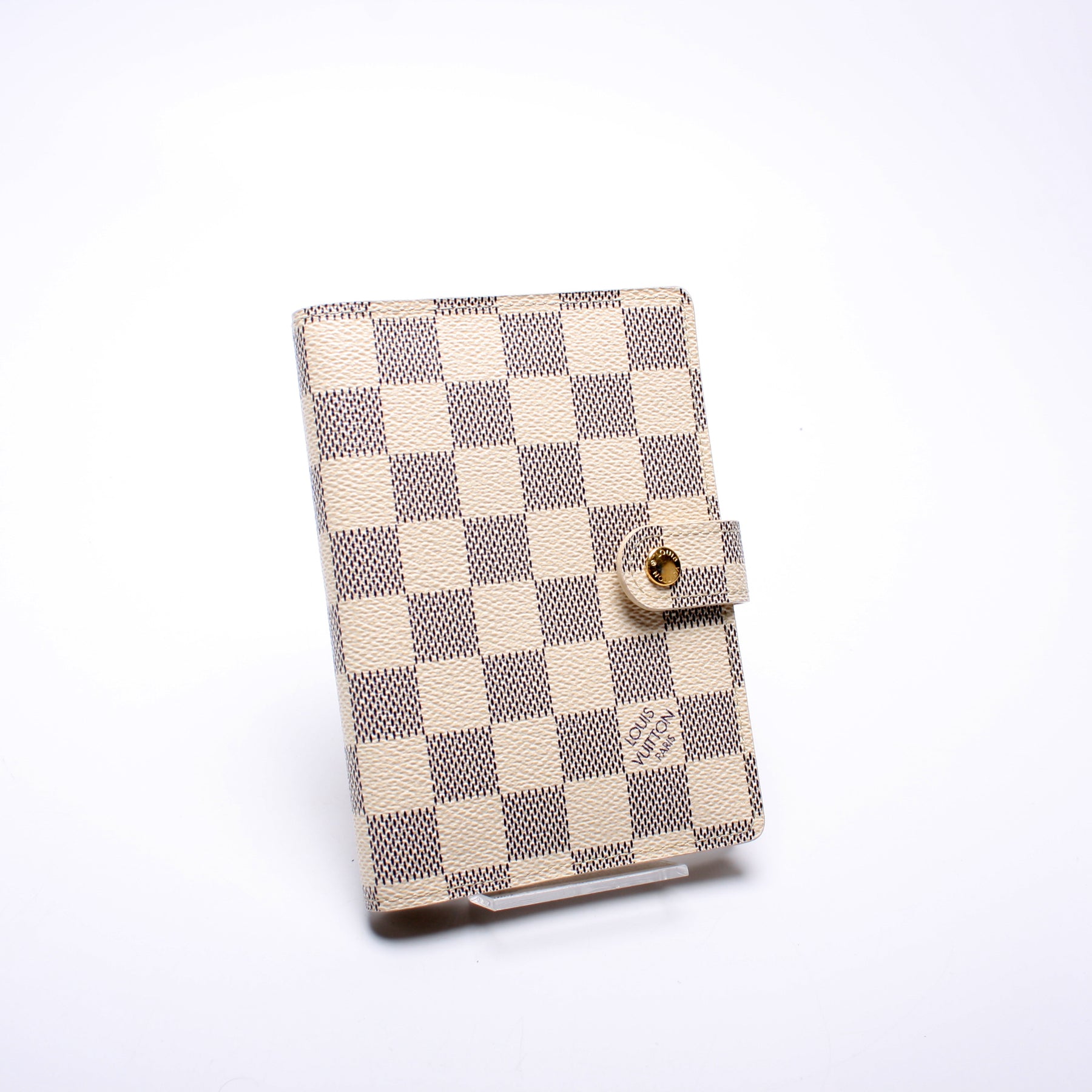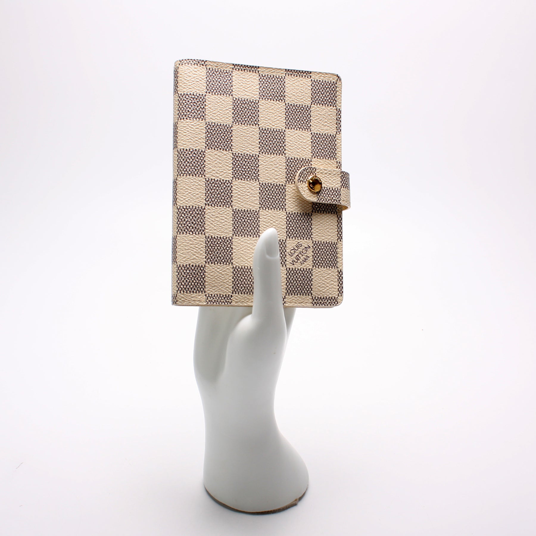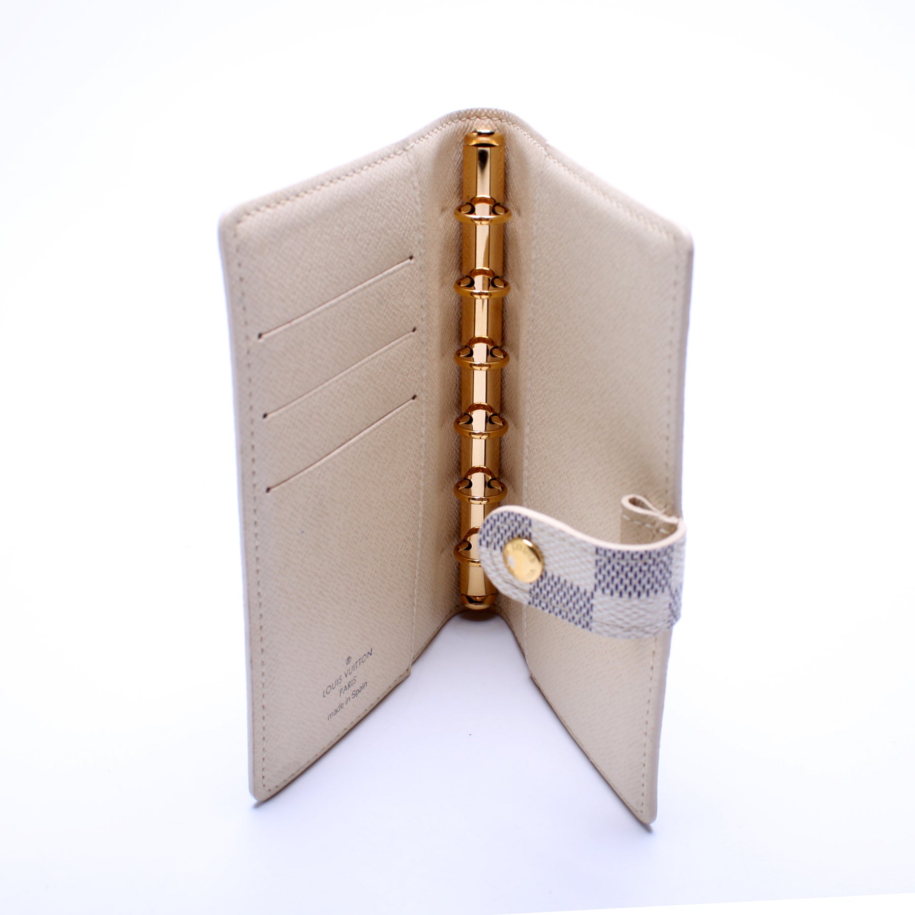 This pre-owned Louis Vuitton Agenda Small Ring is guaranteed 100% authentic. The exterior is in the classic Louis Vuitton Damier Azur coated canvas.
