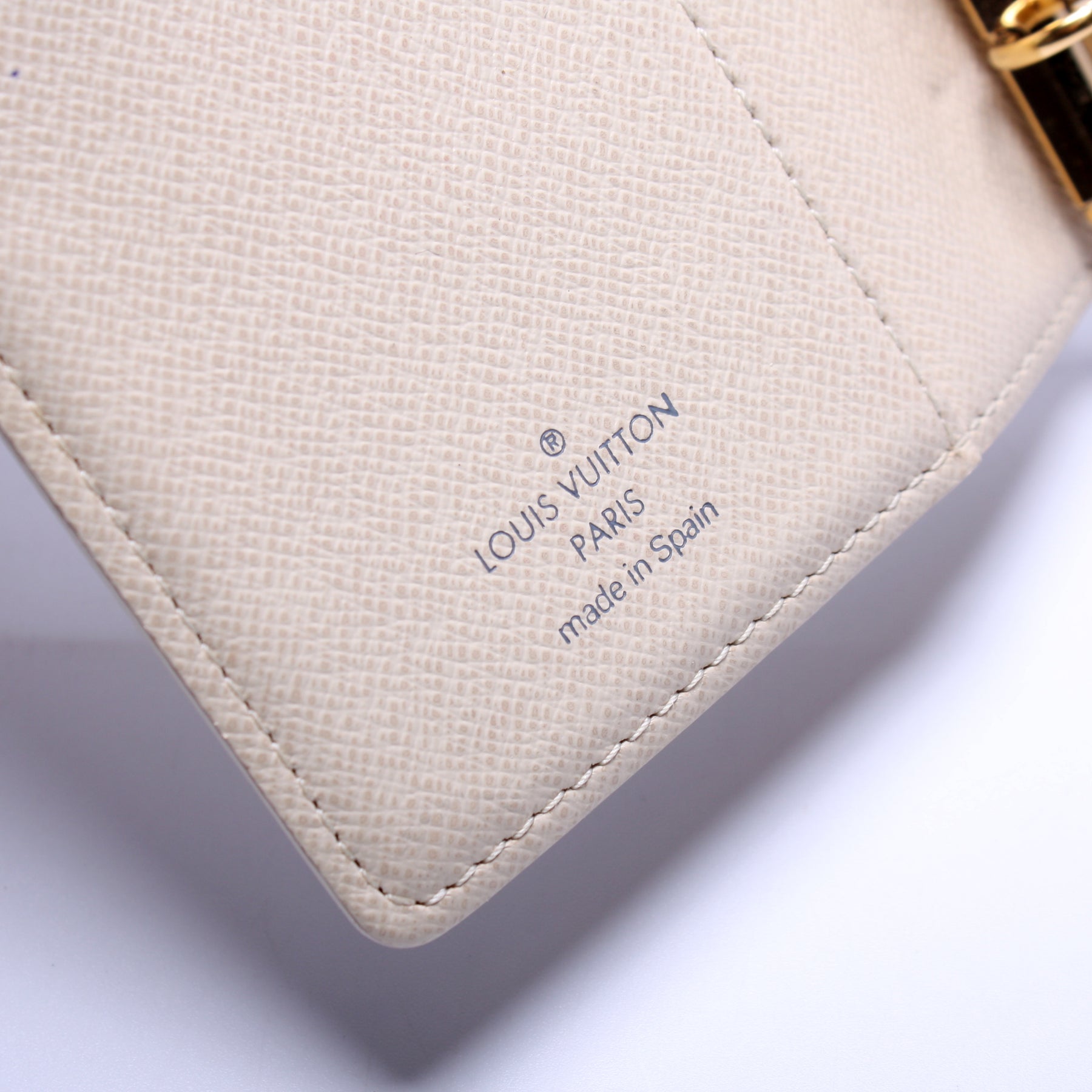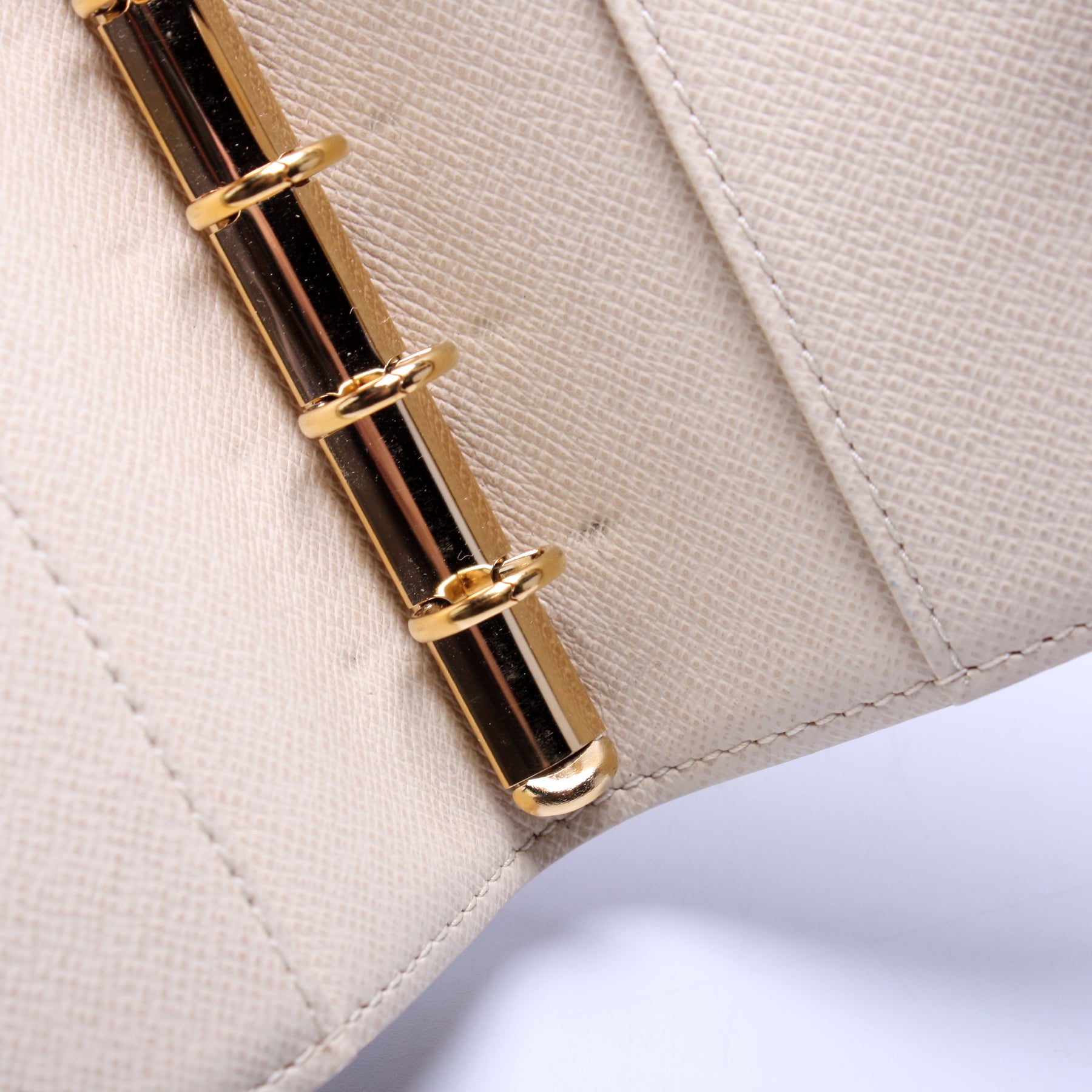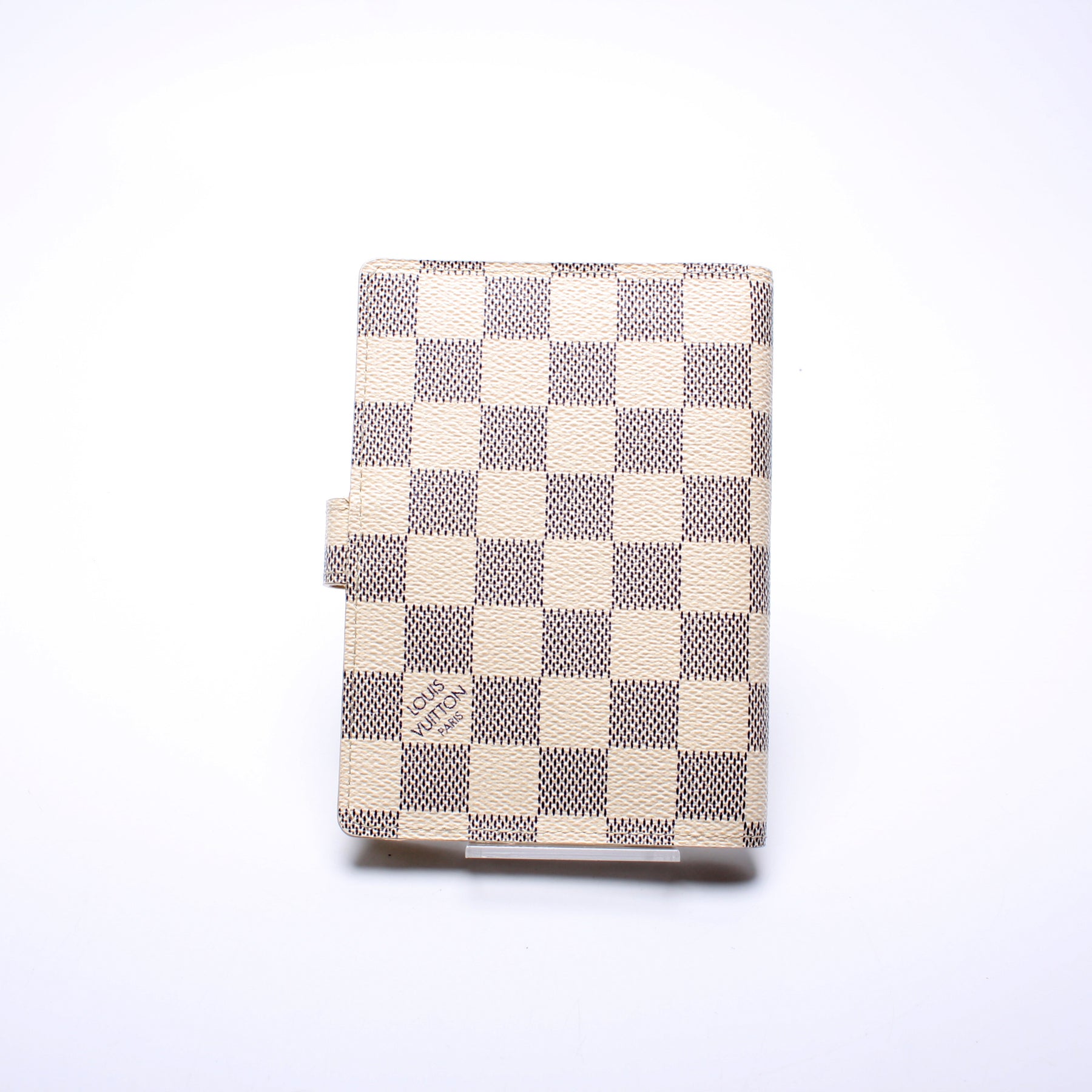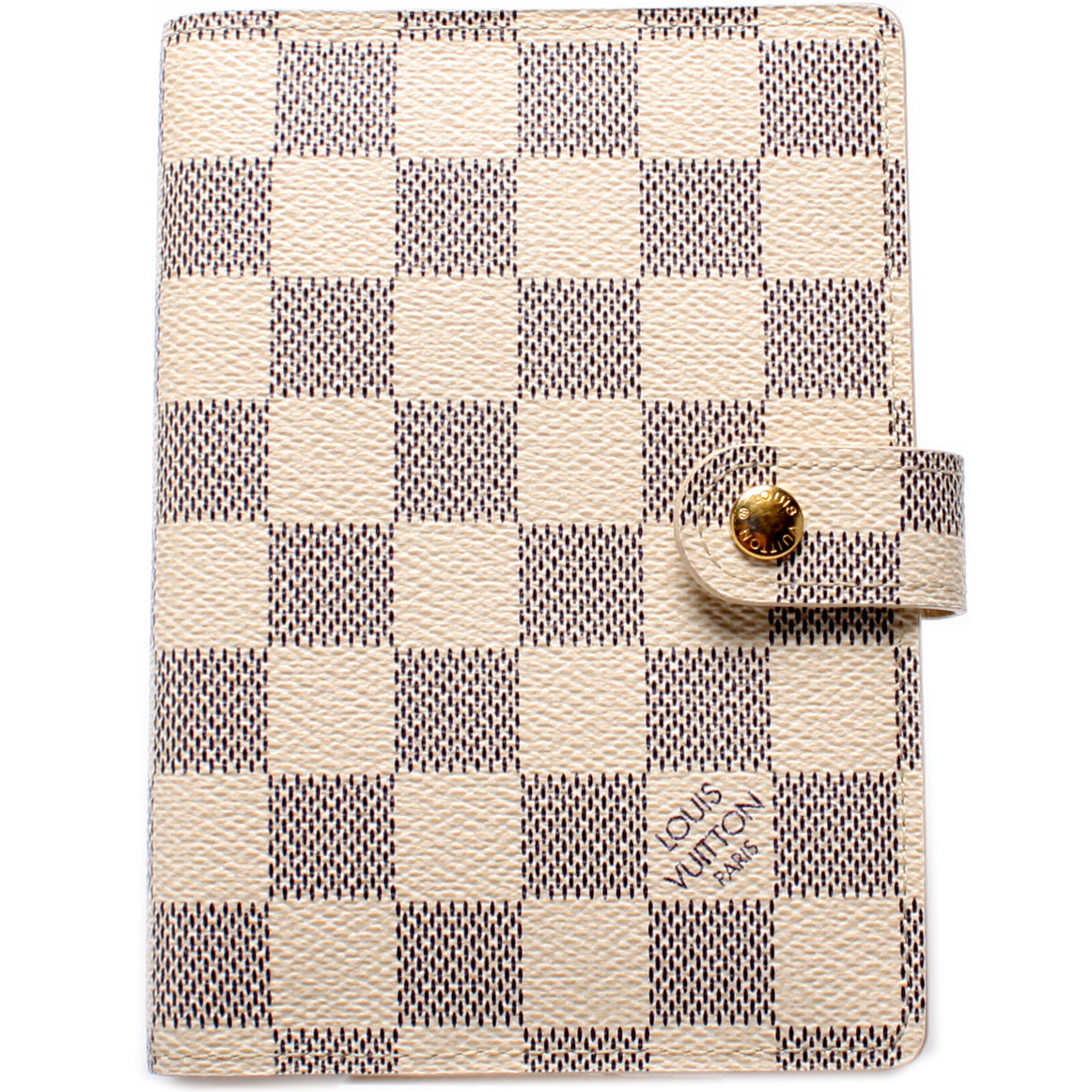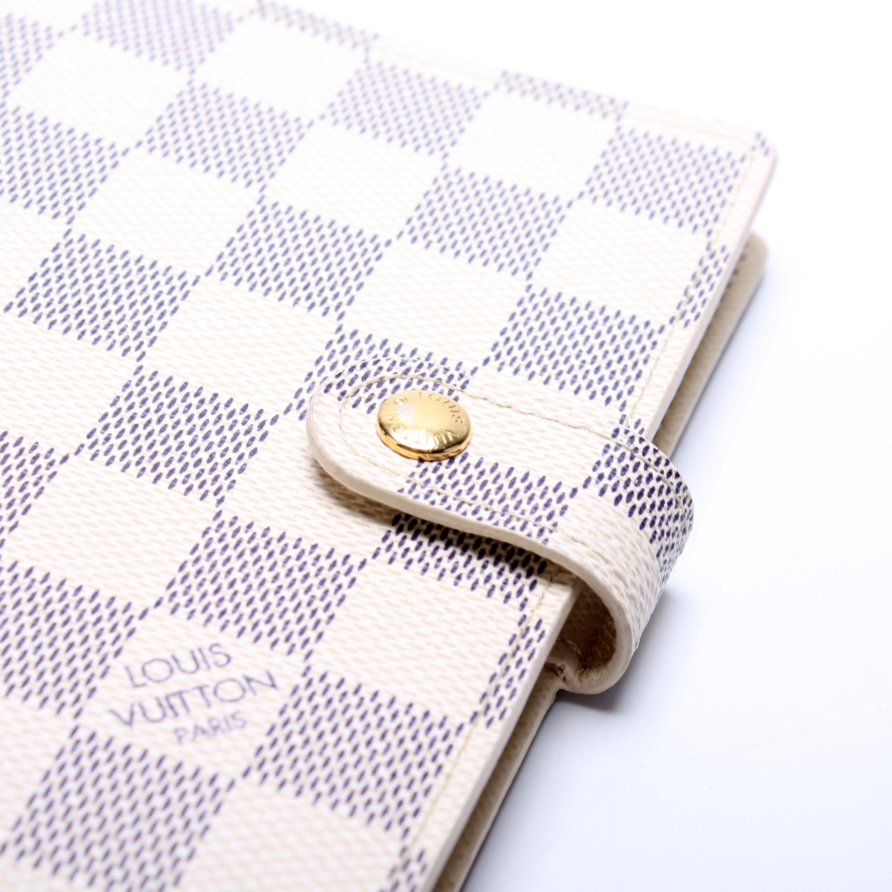 This pre-owned Louis Vuitton Agenda Small Ring is guaranteed 100% authentic. The exterior is in the classic Louis Vuitton Damier Azur coated canvas.