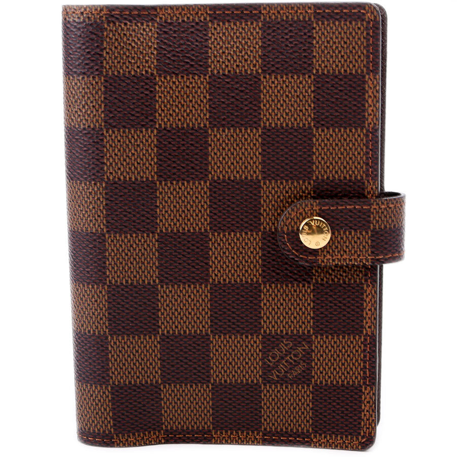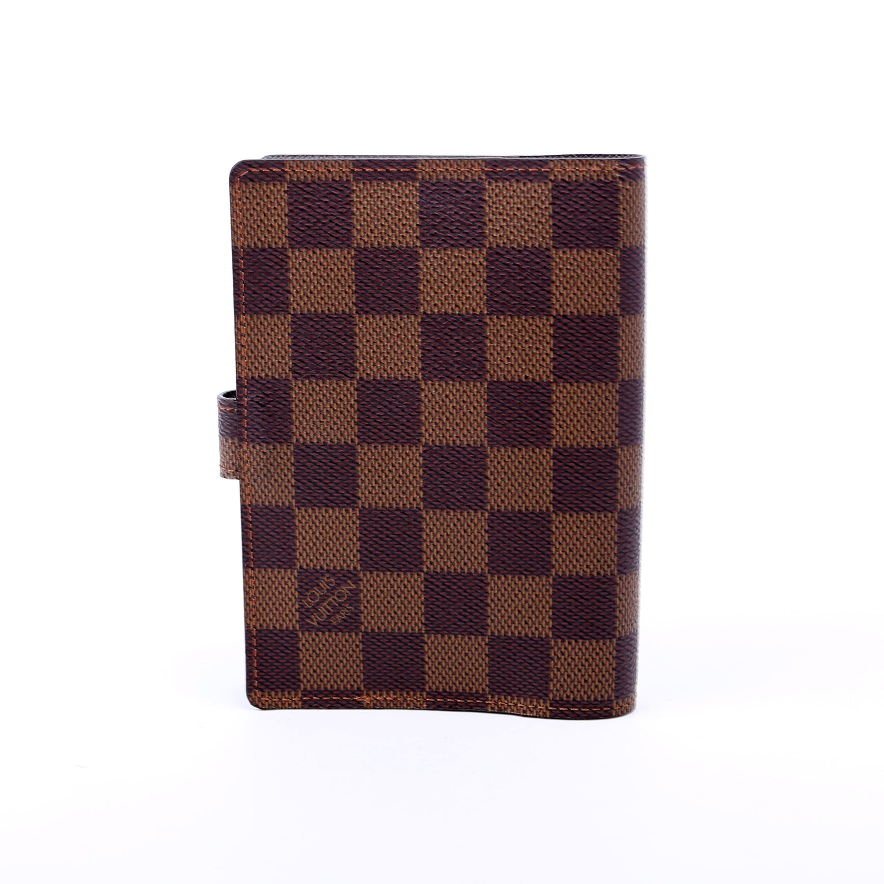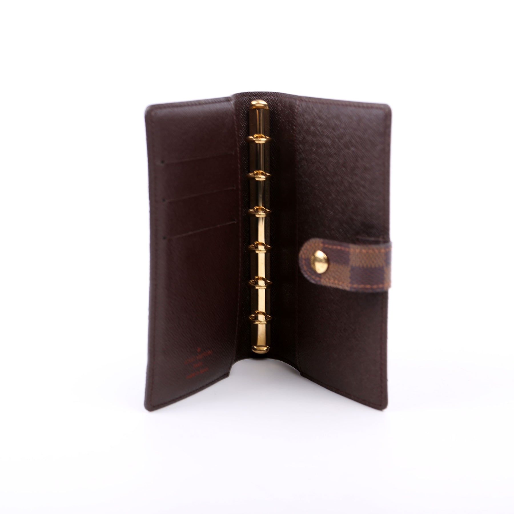 This pre-owned Louis Vuitton Agenda Small Ring is guaranteed 100% authentic. The exterior is in the classic Damier Ebene coated canvas.