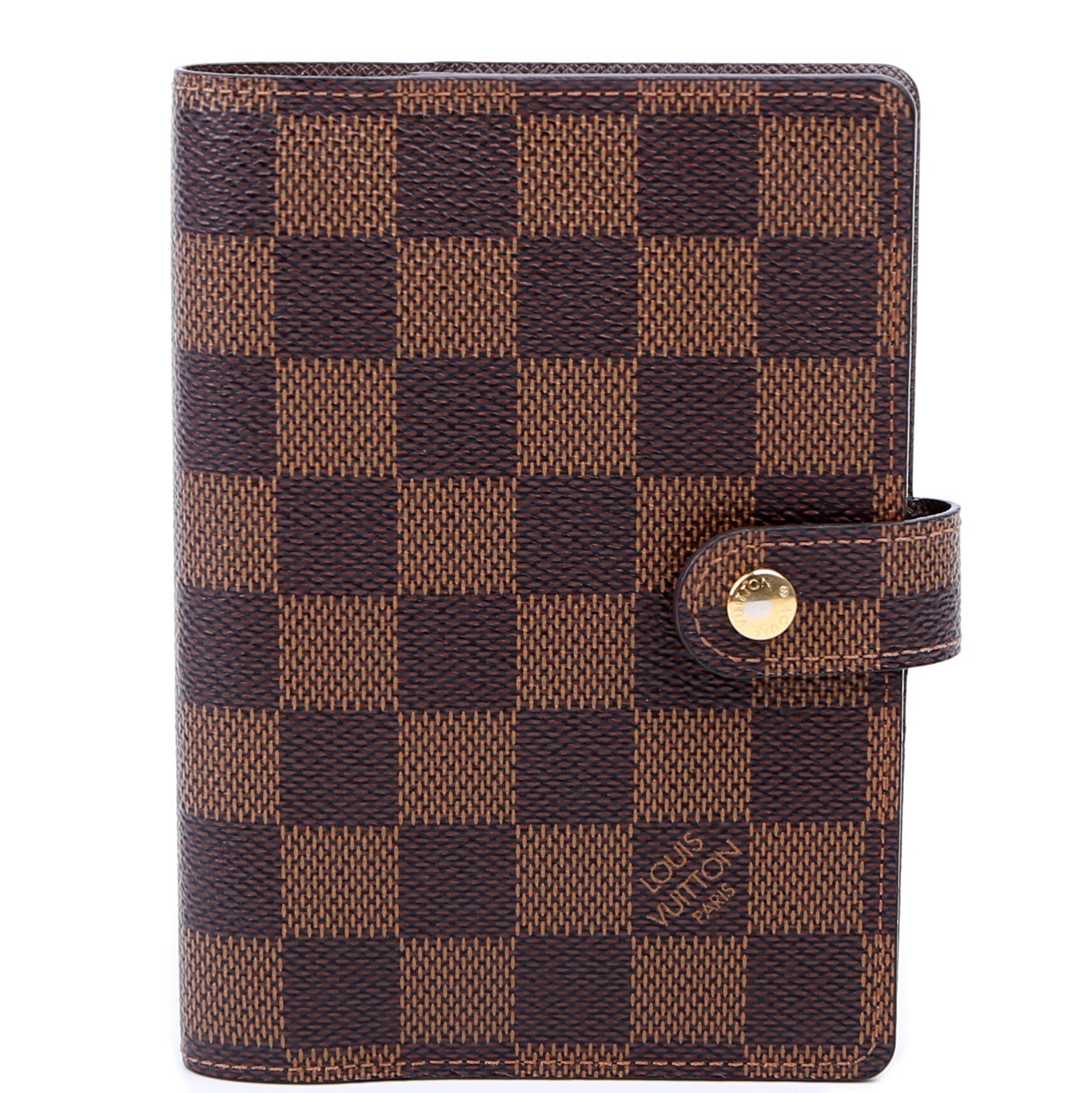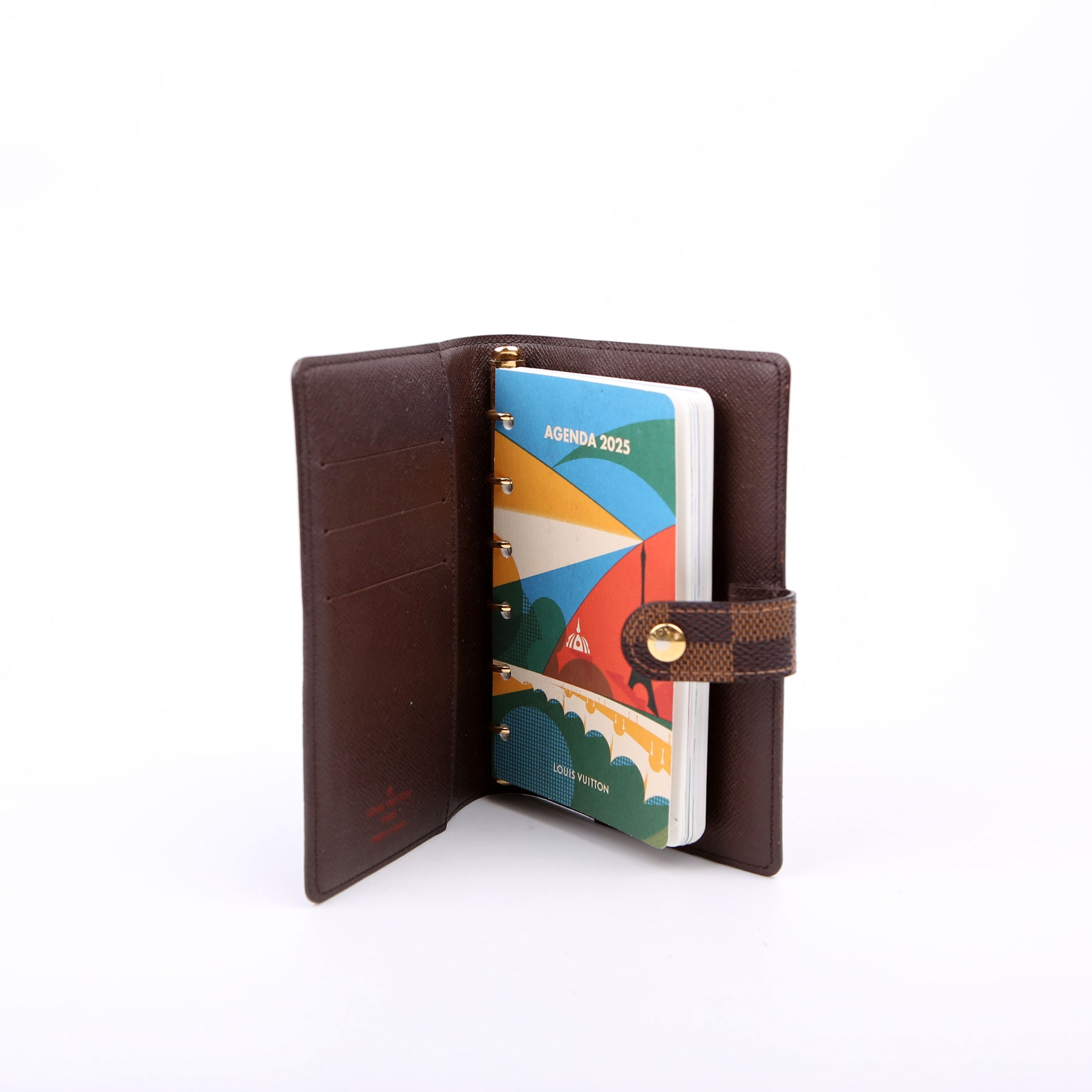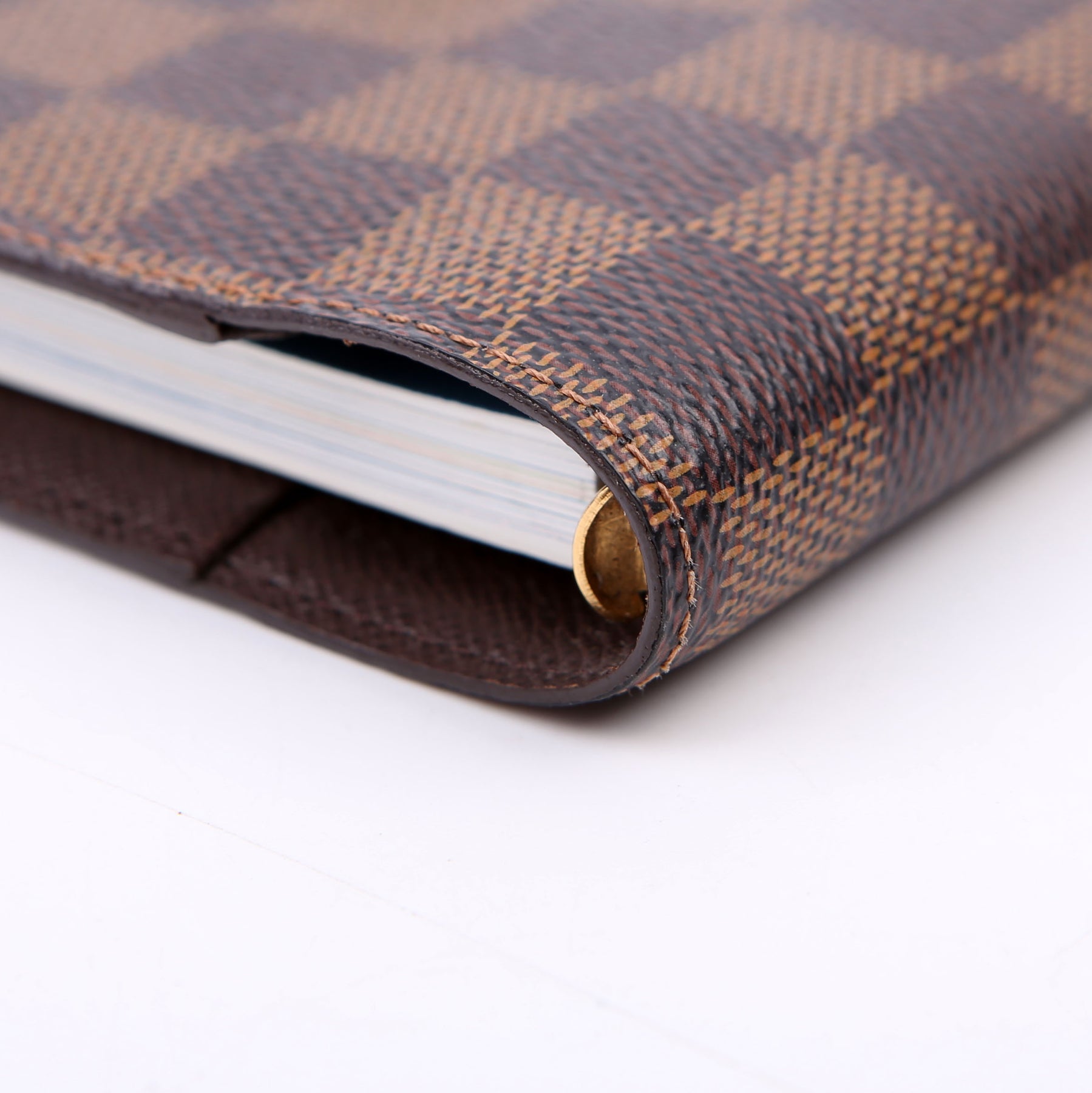 This pre-owned Louis Vuitton Agenda Small Ring is guaranteed 100% authentic. The exterior is in the classic Louis Vuitton Damier Ebene coated canvas.
