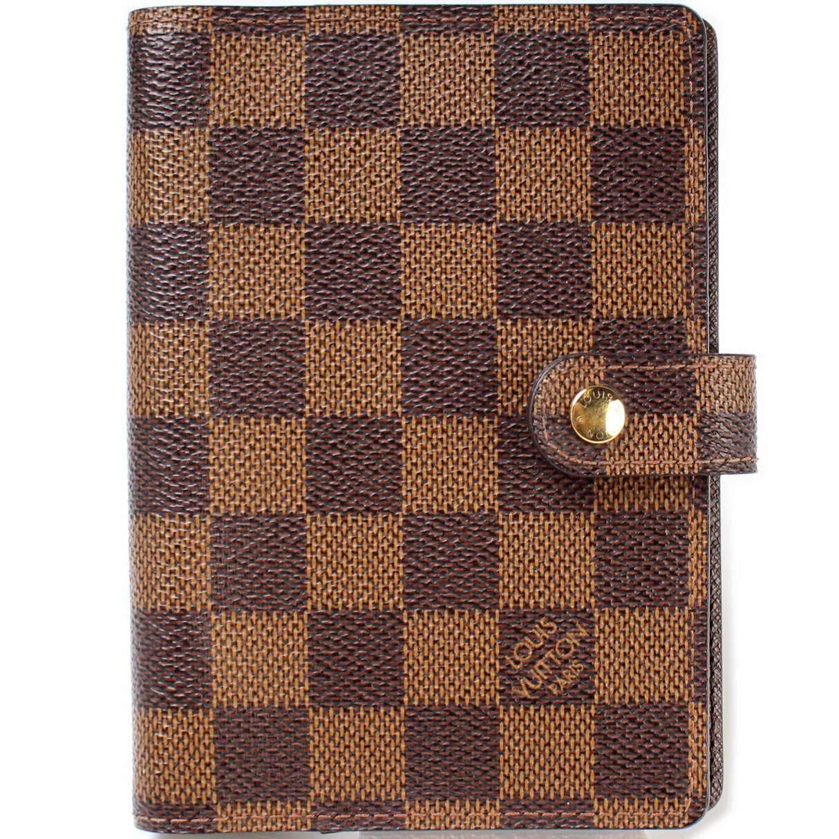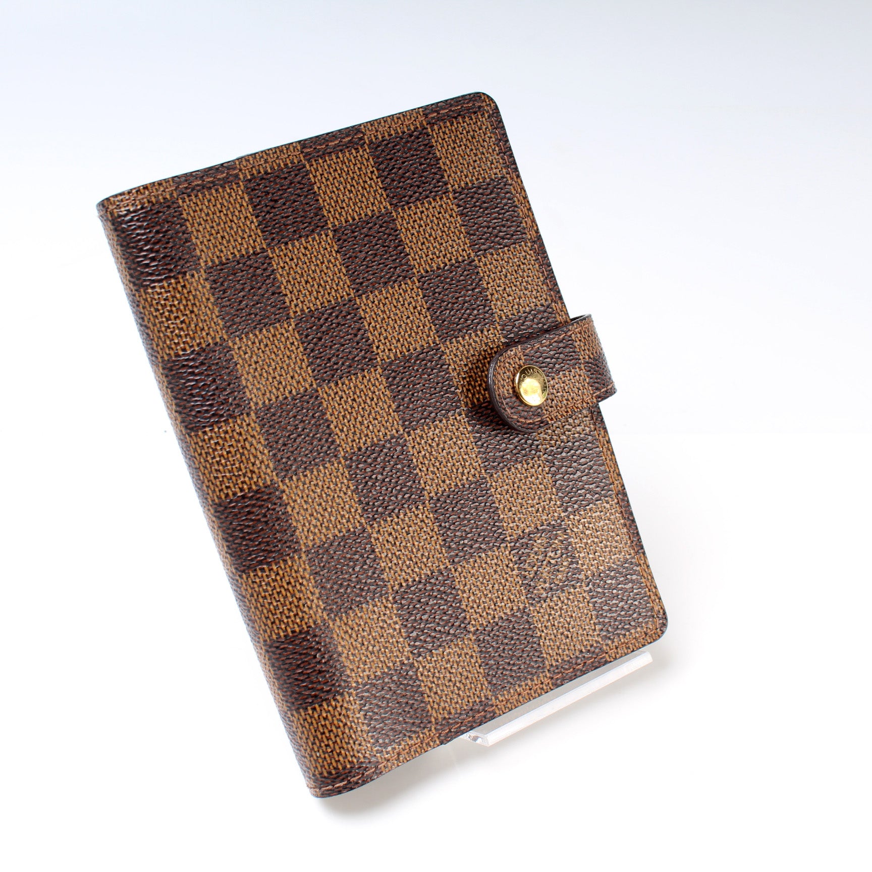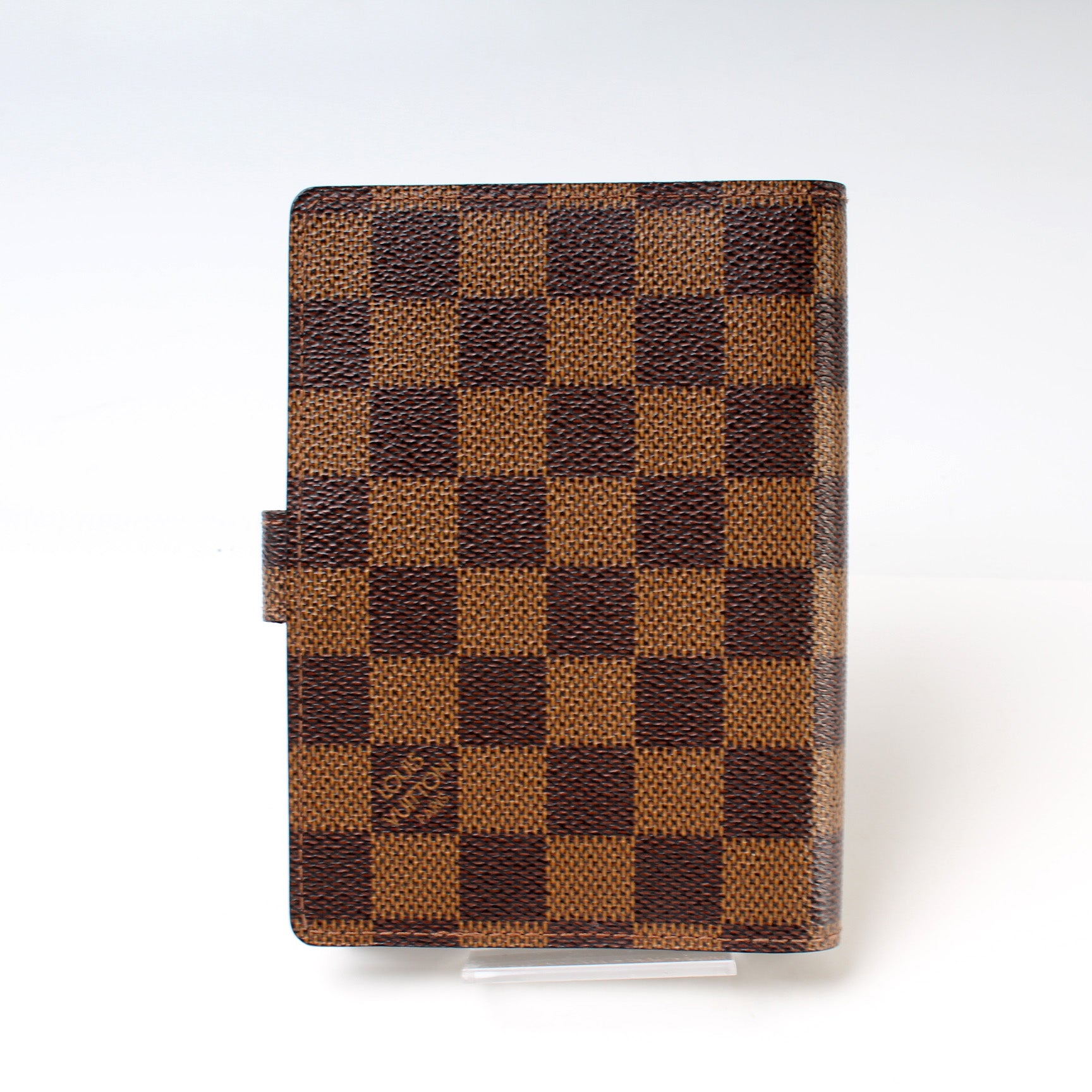 This pre-owned Louis Vuitton Agenda Small Ring is guaranteed 100% authentic. The exterior is in the classic Damier Ebene coated canvas.