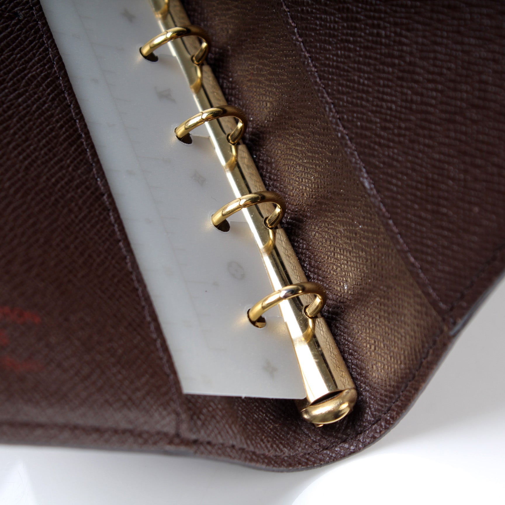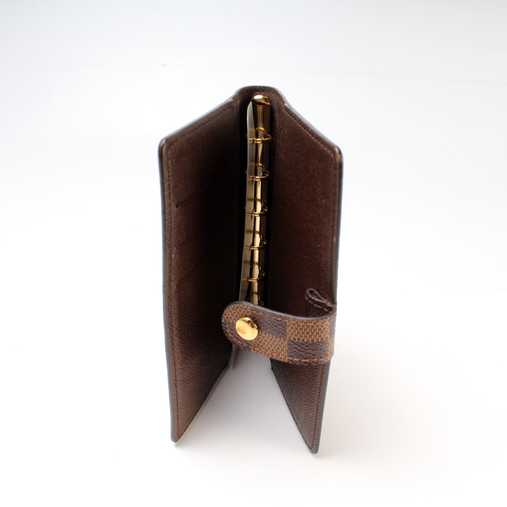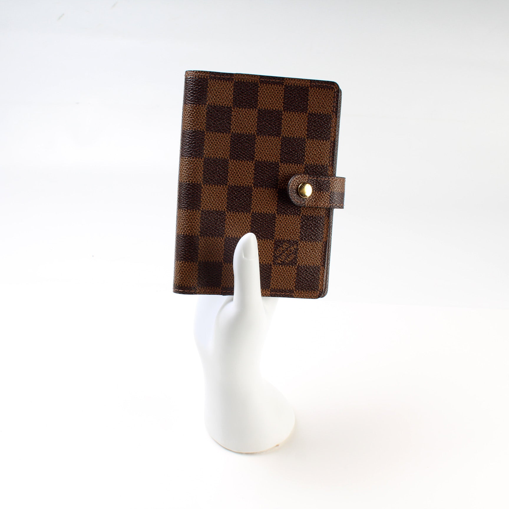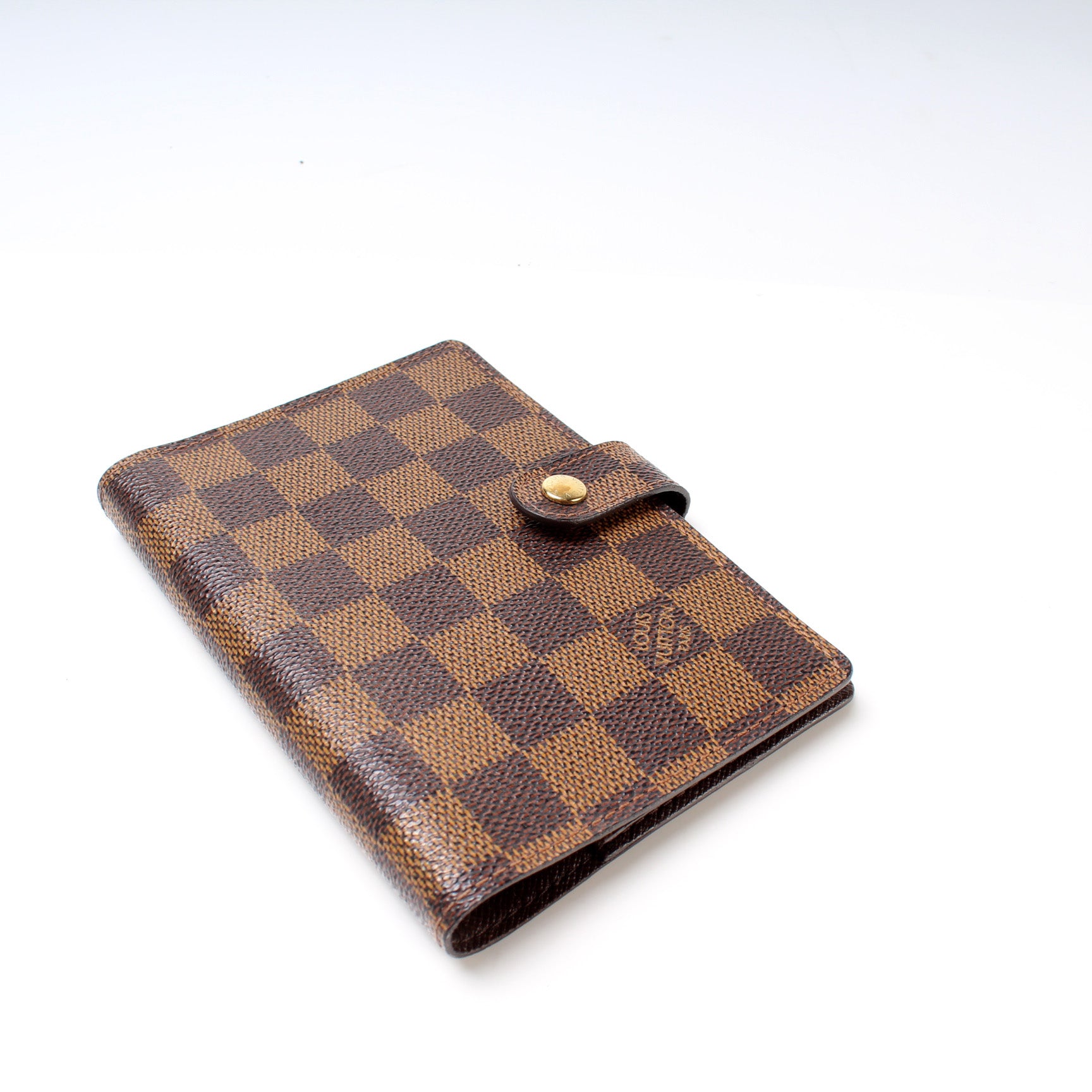 This pre-owned Louis Vuitton Agenda Small Ring is guaranteed 100% authentic. The exterior is in the classic Damier Ebene coated canvas.