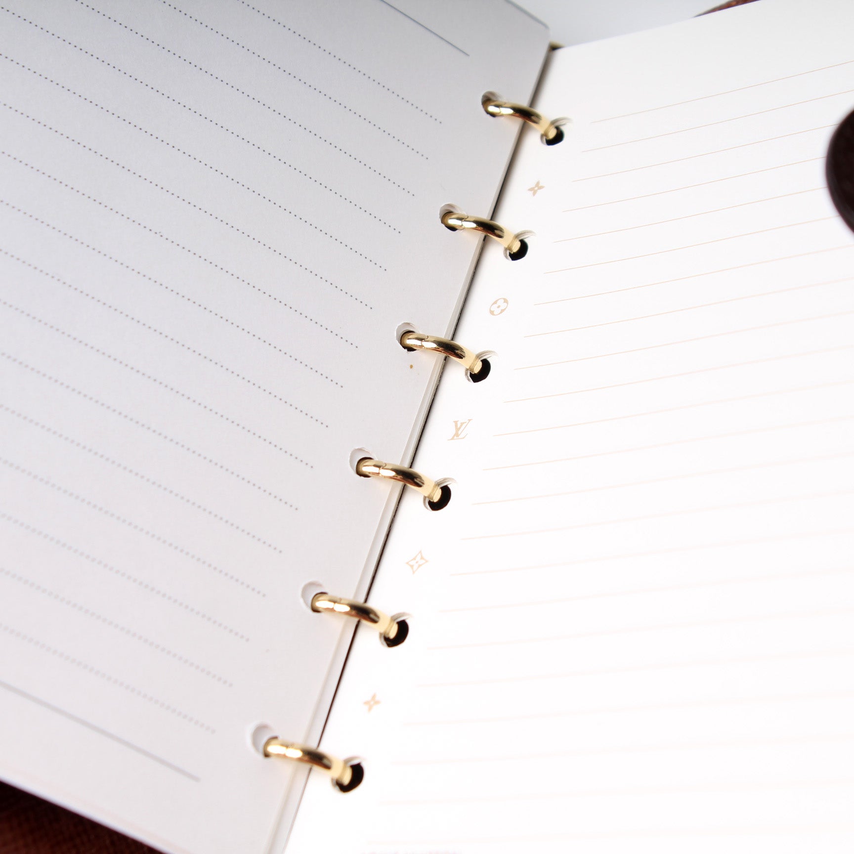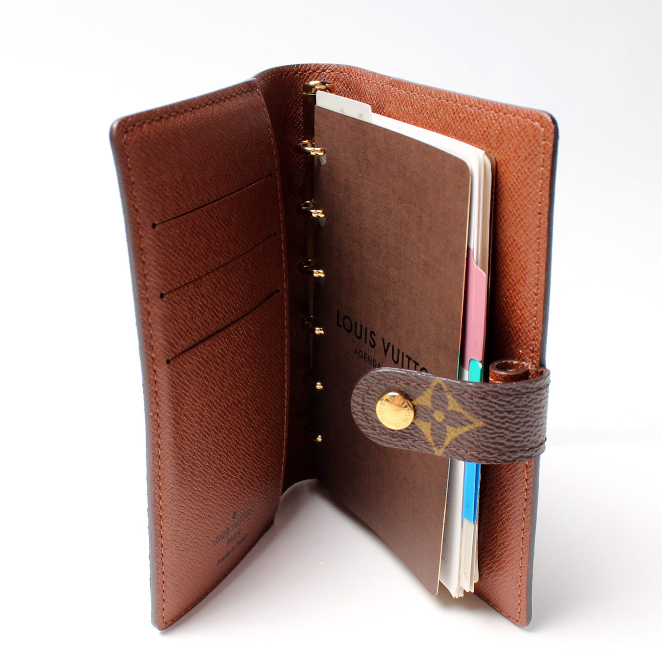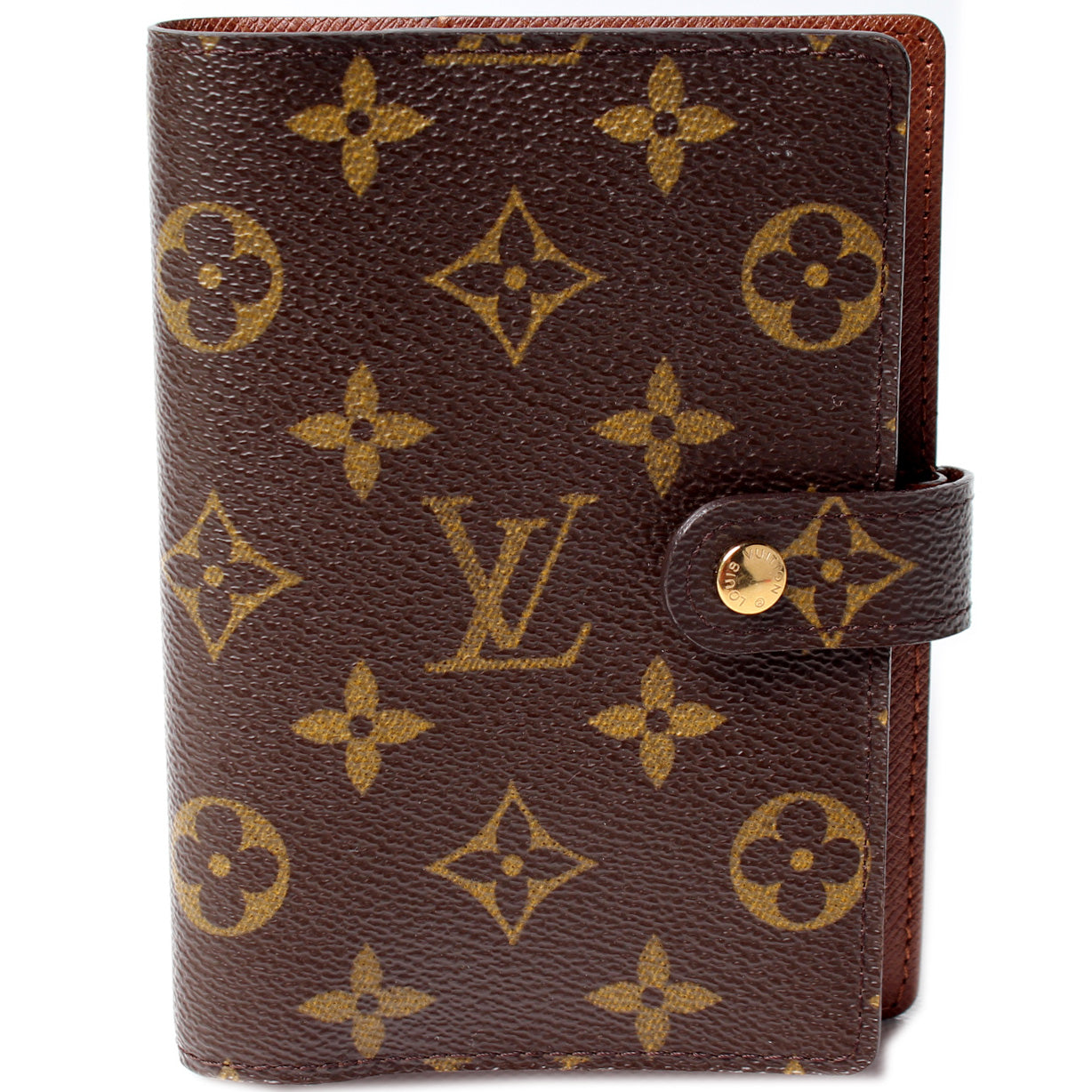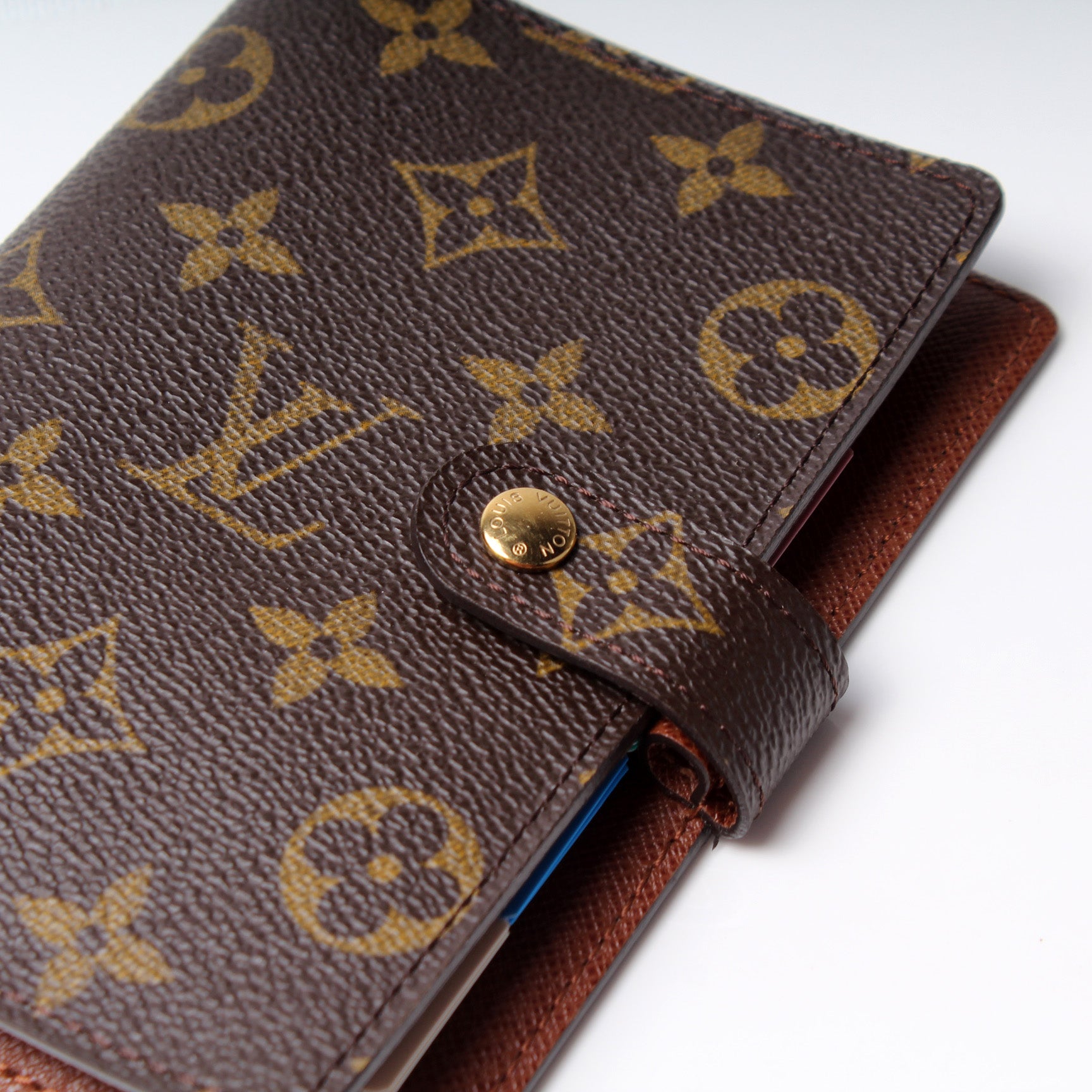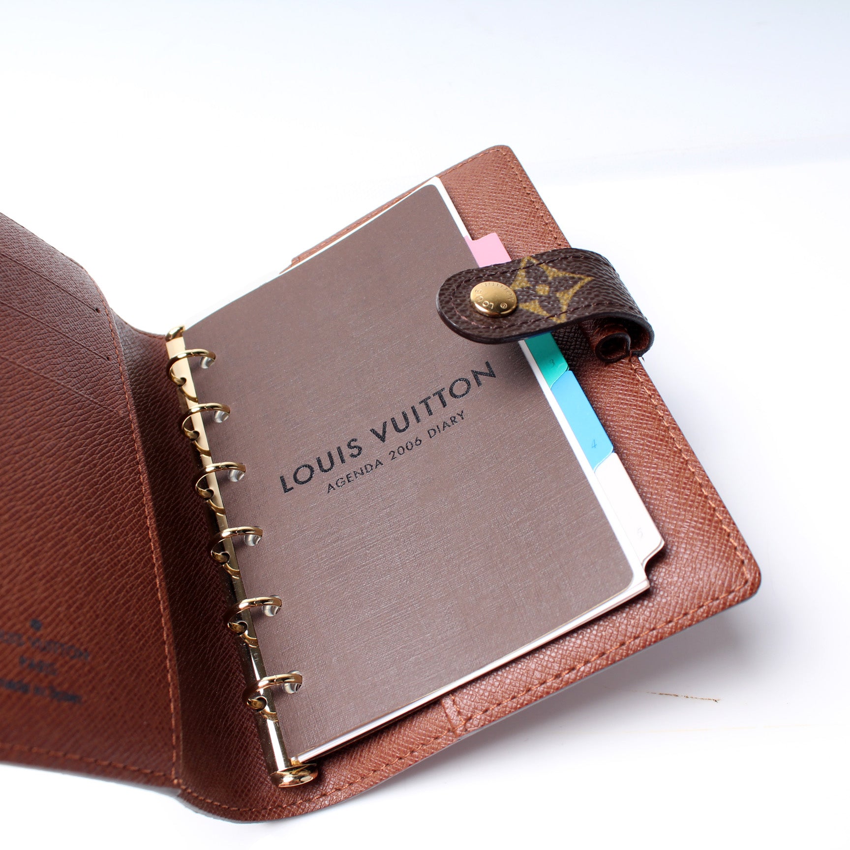 This pre-owned Louis Vuitton Agenda Small Ring is guaranteed 100% authentic. The exterior is in the classic Louis Vuitton Monogram coated canvas.