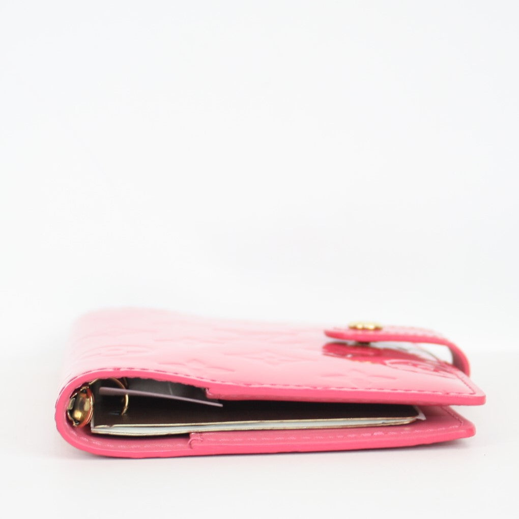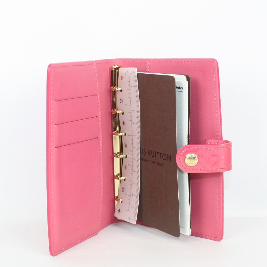 This pre-owned Louis Vuitton Agenda Small Ring is guaranteed 100% authentic. The exterior is in the classic Louis Vuitton Vernis leather.