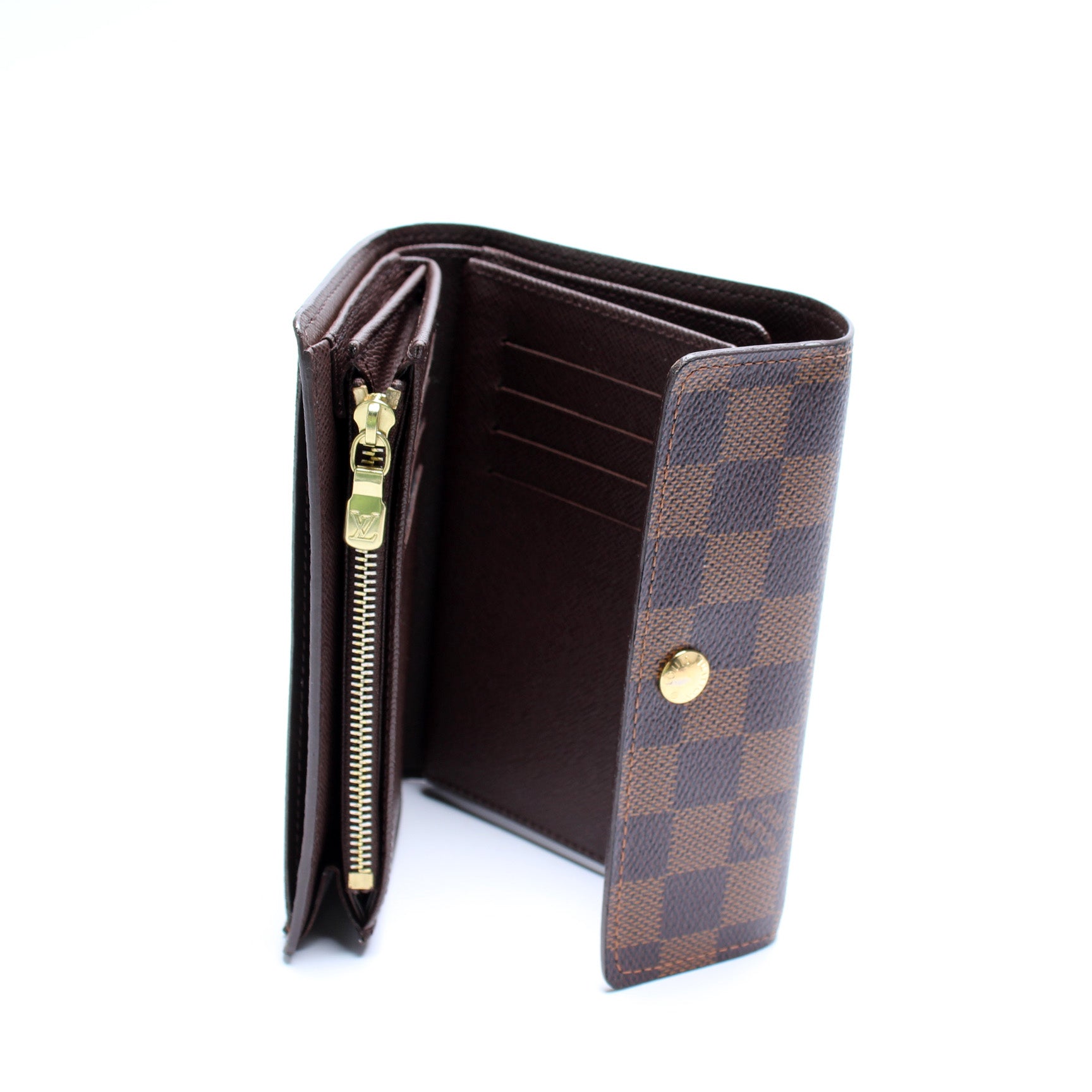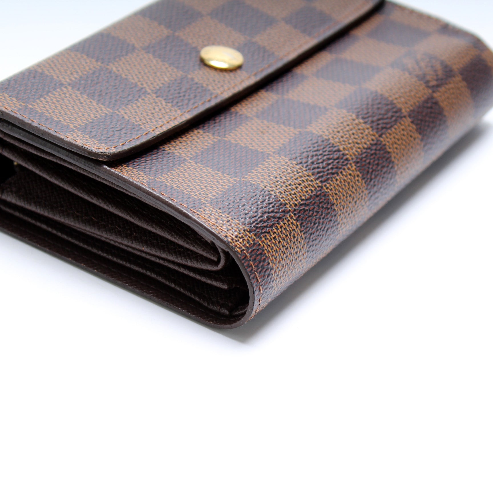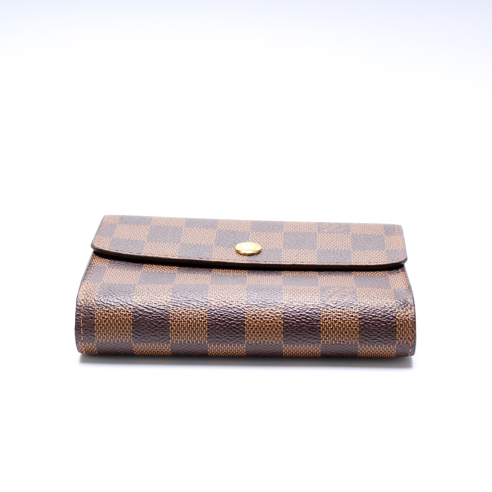 This pre-owned Louis Vuitton Alexandra Wallet is guaranteed 100% authentic. The exterior is in the classic Louis Vuitton Damier Ebene coated canvas.