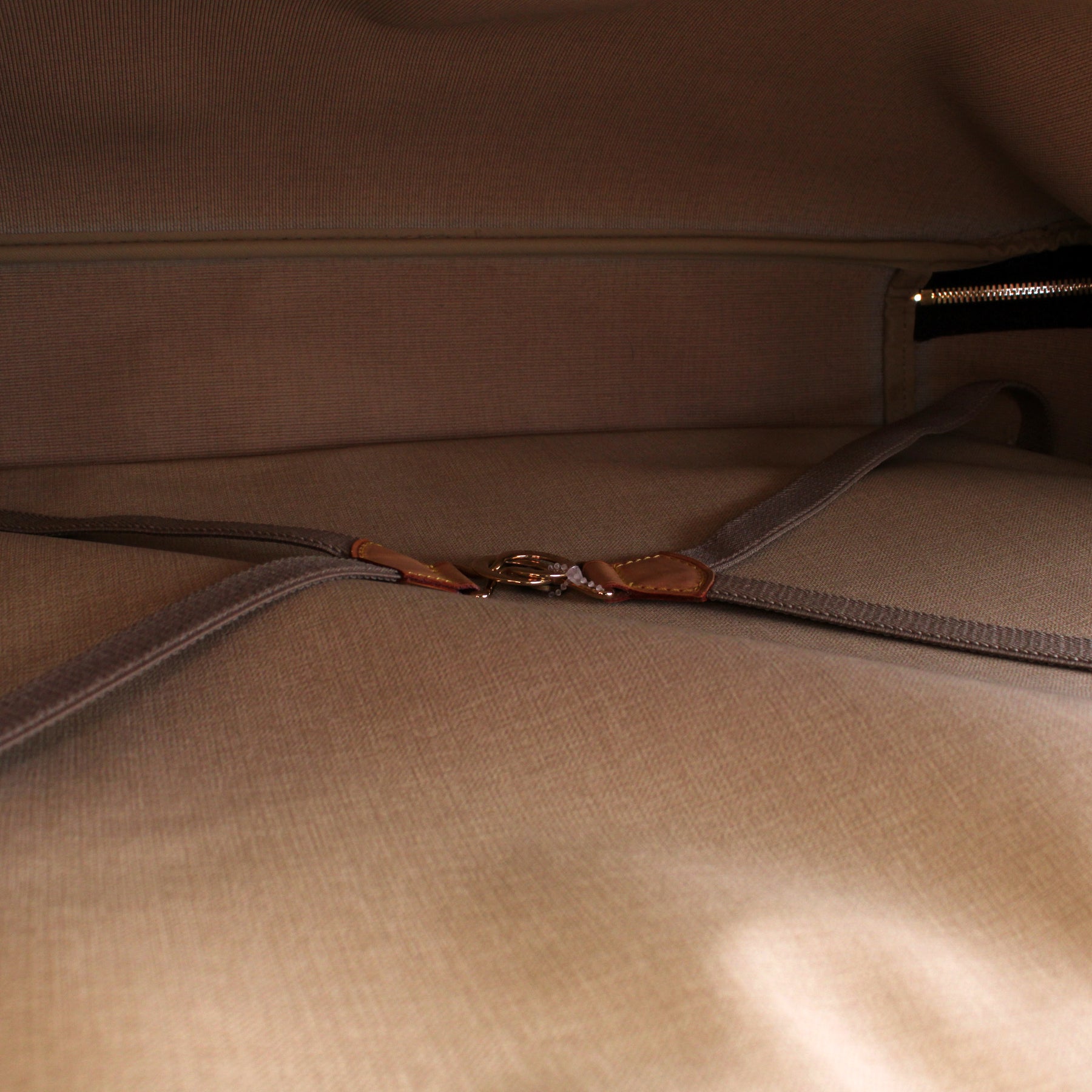 Exterior: The exterior coated canvas is free of any rips or cracks. The corners and leather trim show minor signs of wear and discoloration.