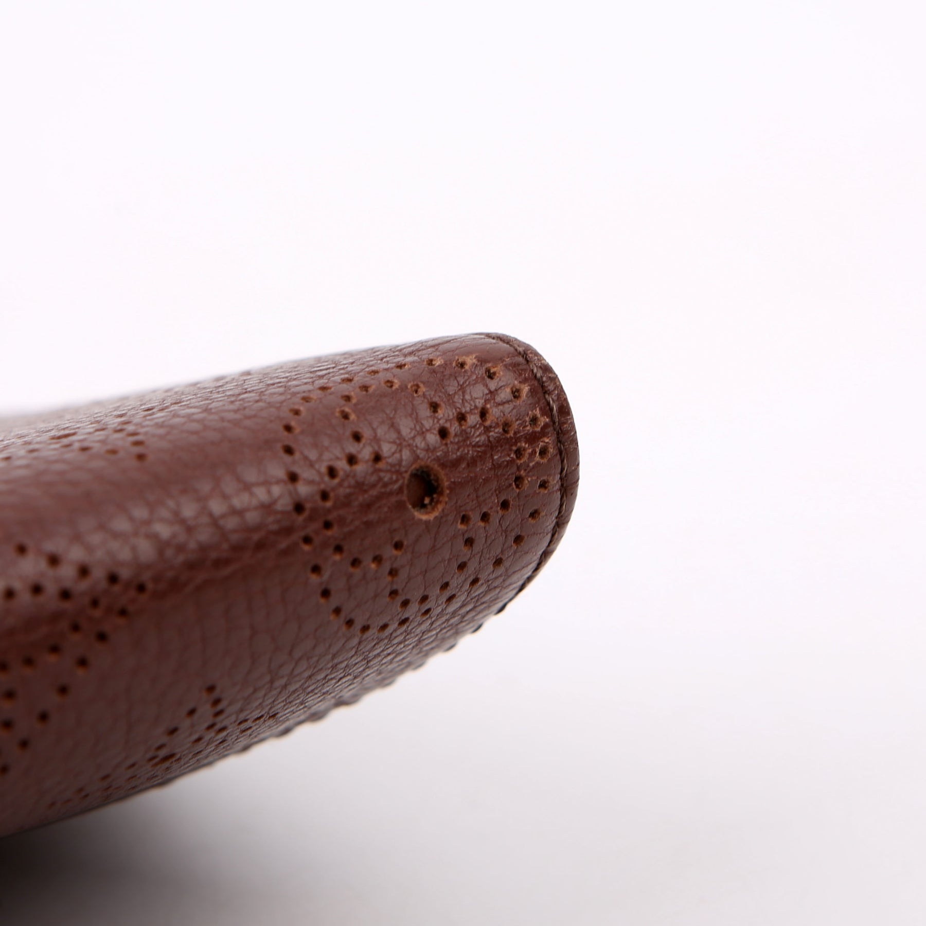 Exterior: The exterior leather shows minor wear. The corners and edges show minor wear.