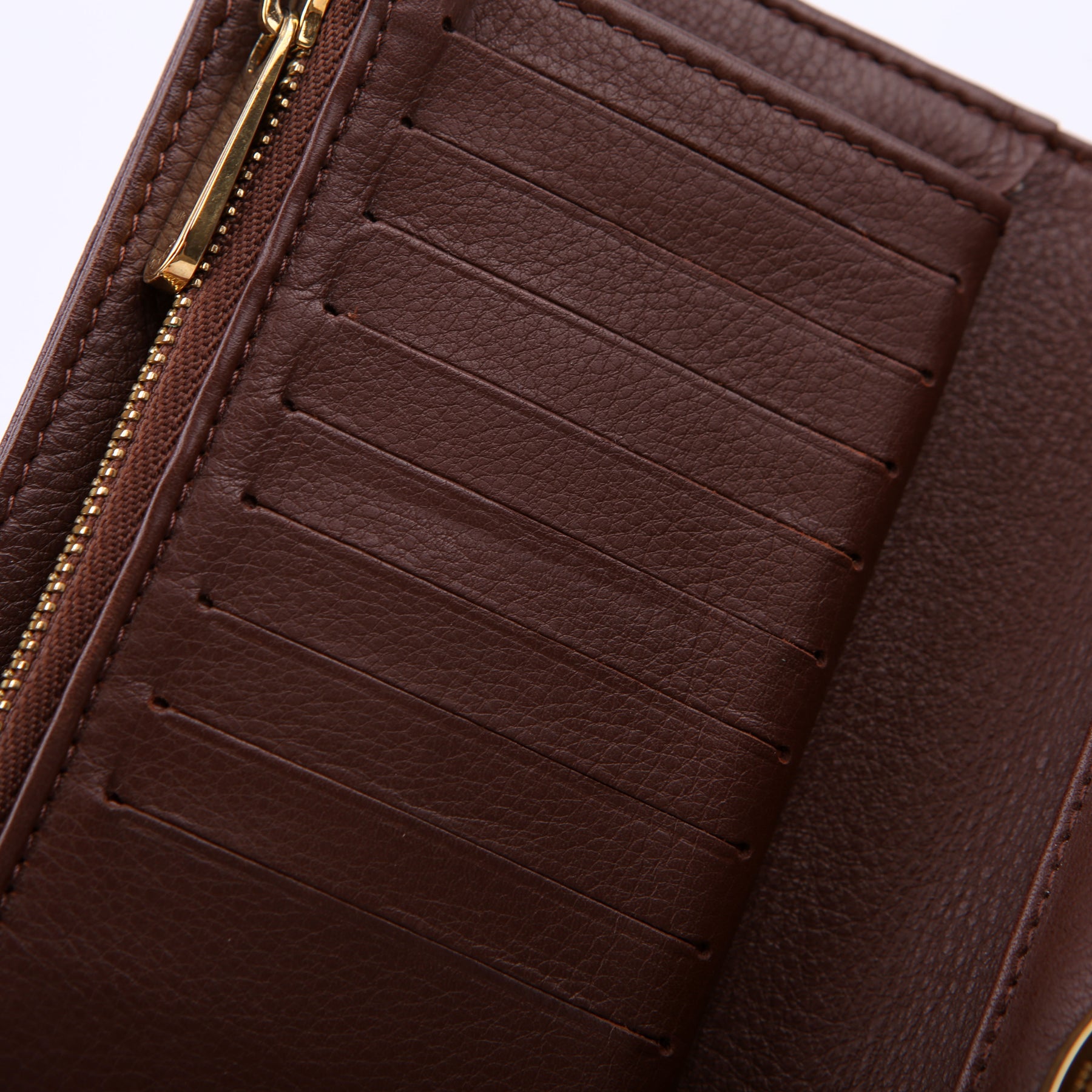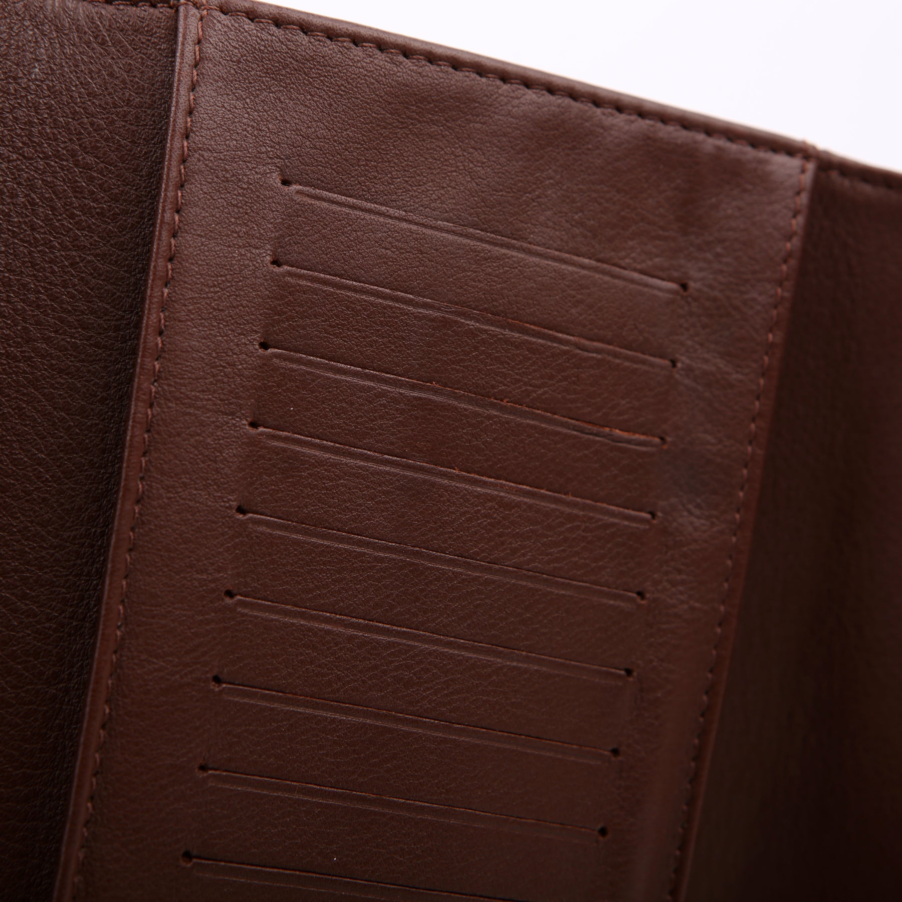 Interior: The interior shows light wear throughout, and features eighteen card slots, three bill slots, and one zip closure pocket.