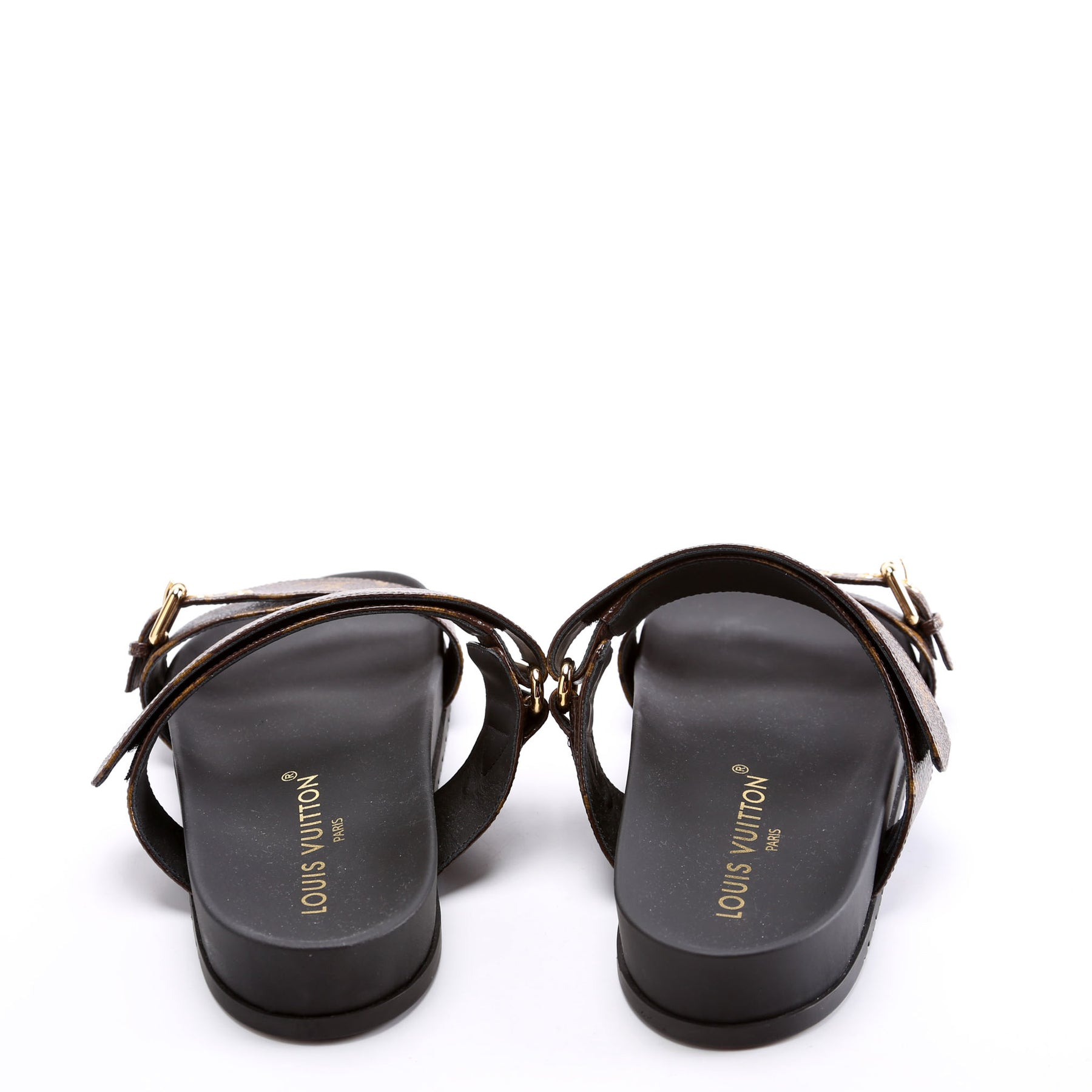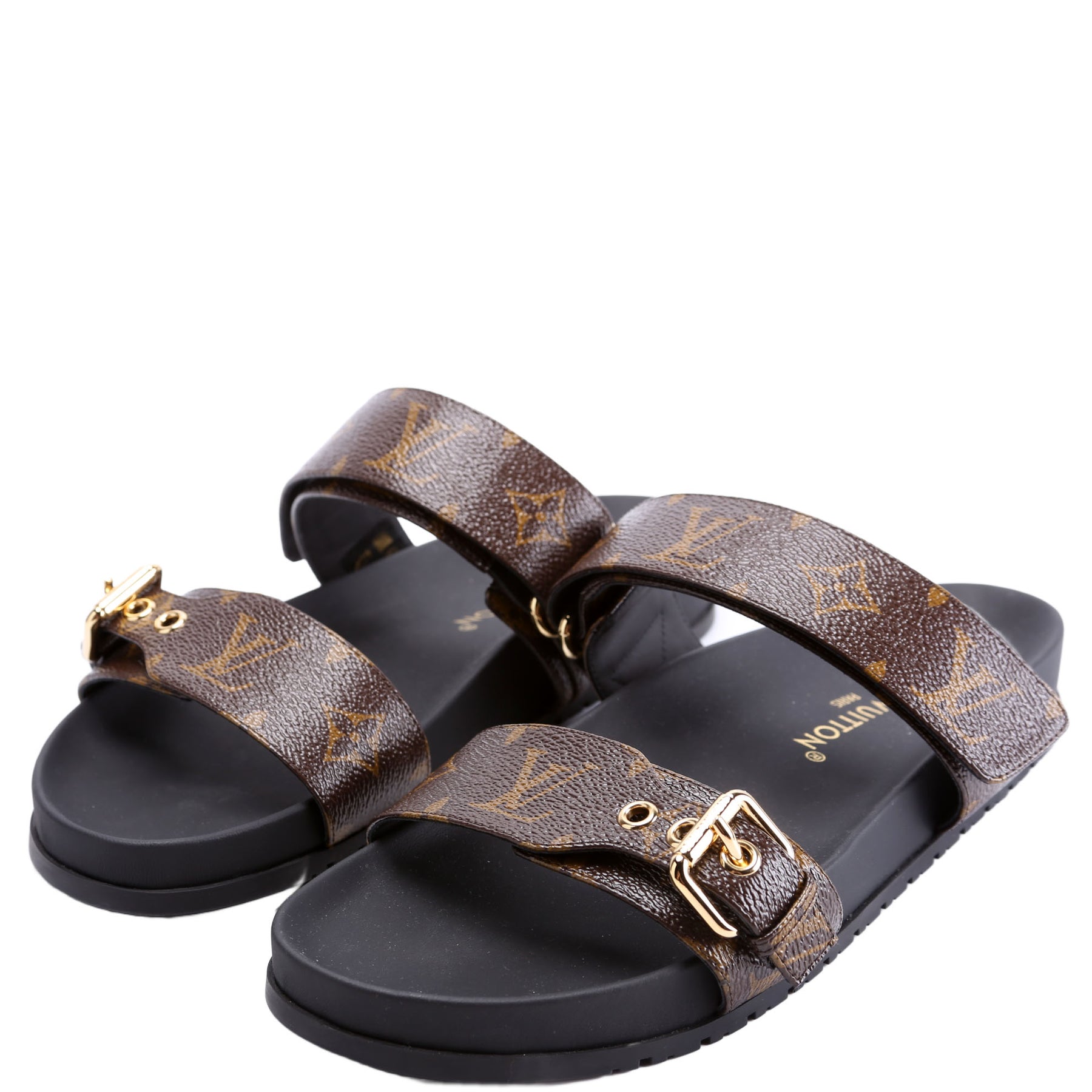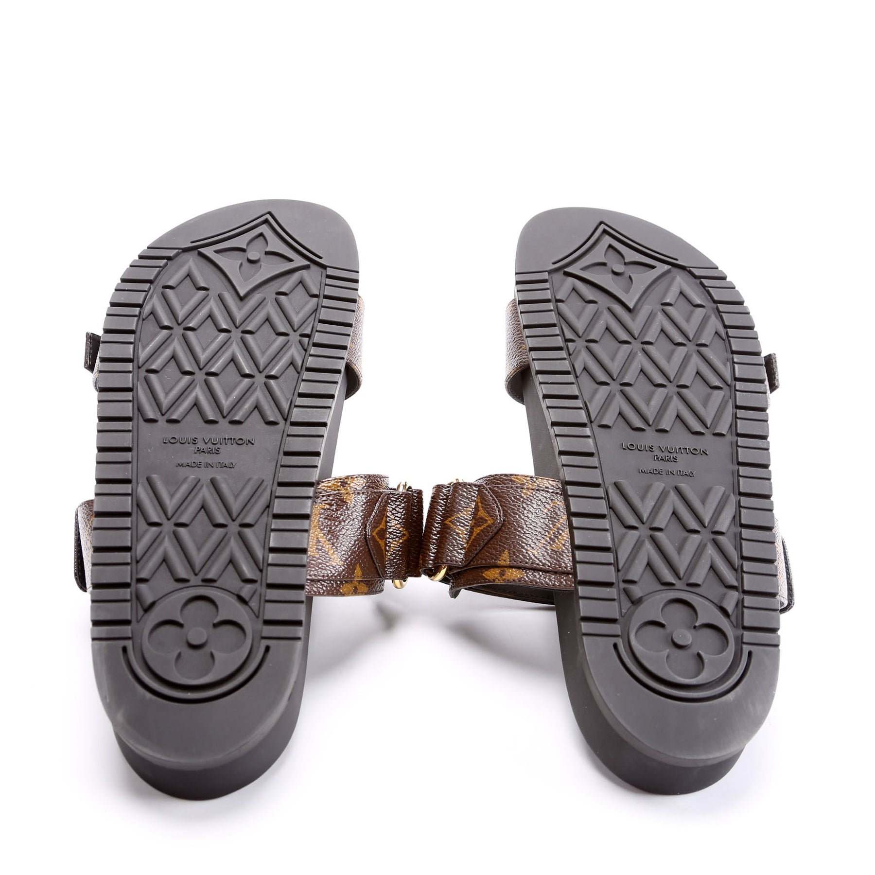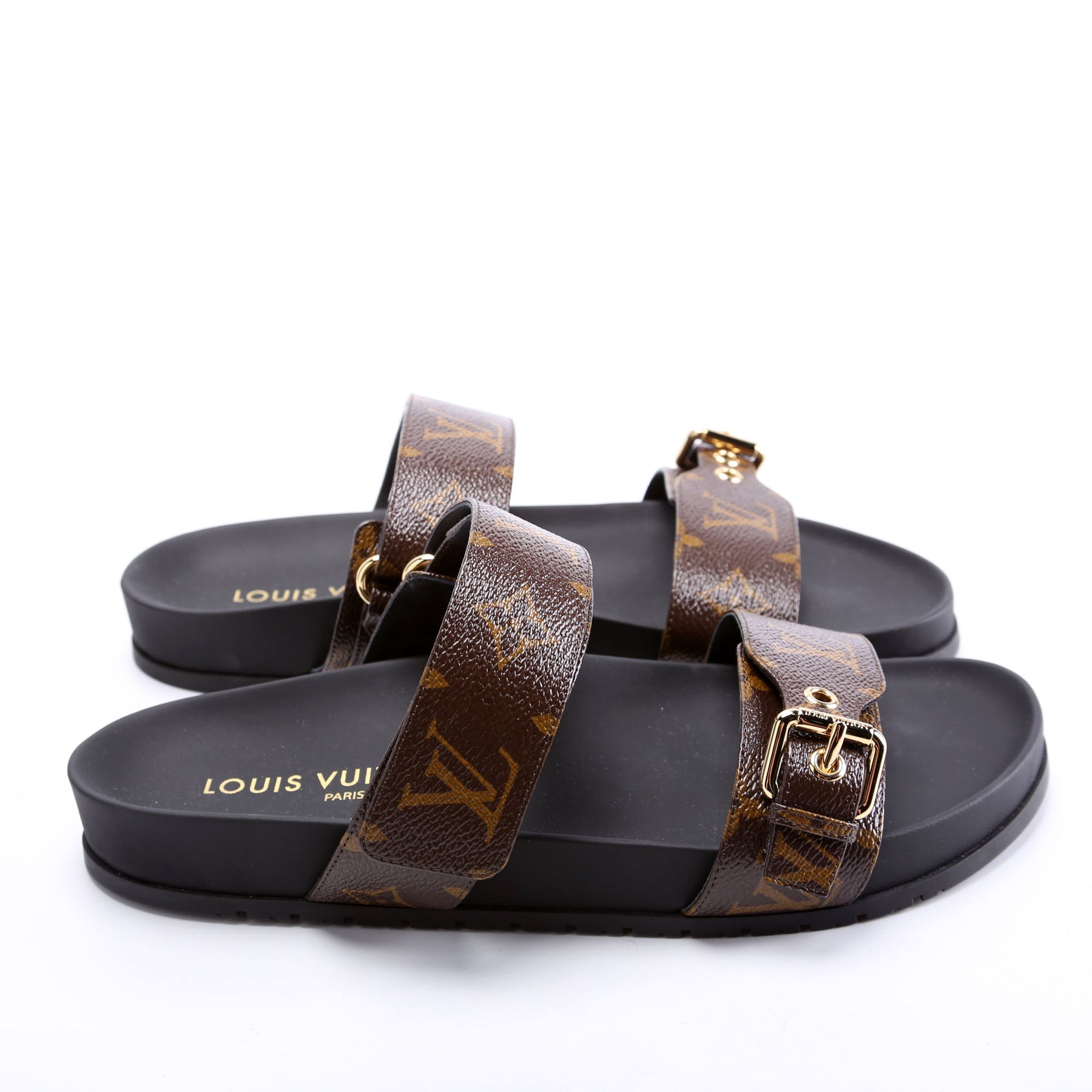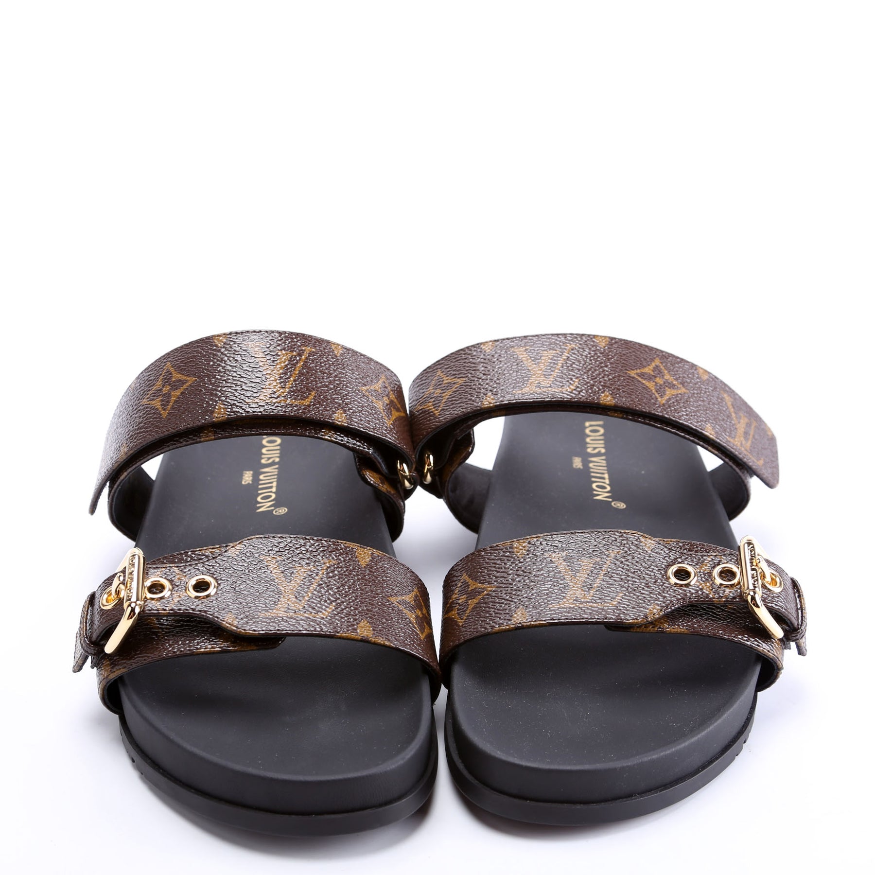 These pre-owned Louis Vuitton Bom Dia Flat Mules Monogram are guaranteed 100% authentic.