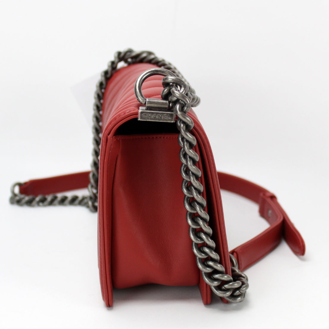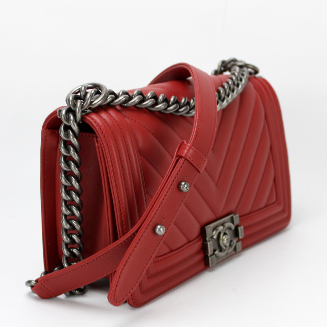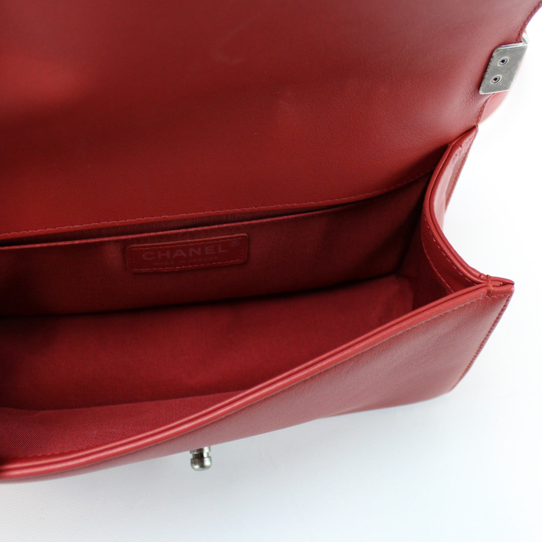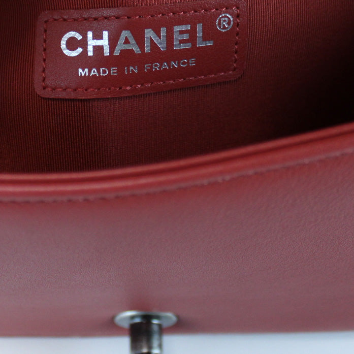 This pre-owned Chanel Boy Flap Medium New 25 Mil is guaranteed 100% authentic. The exterior is in the classic Chanel Lambskin leather.