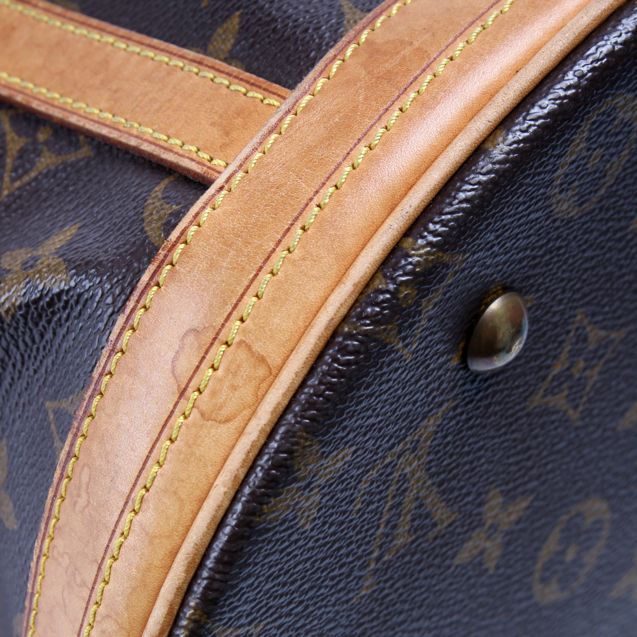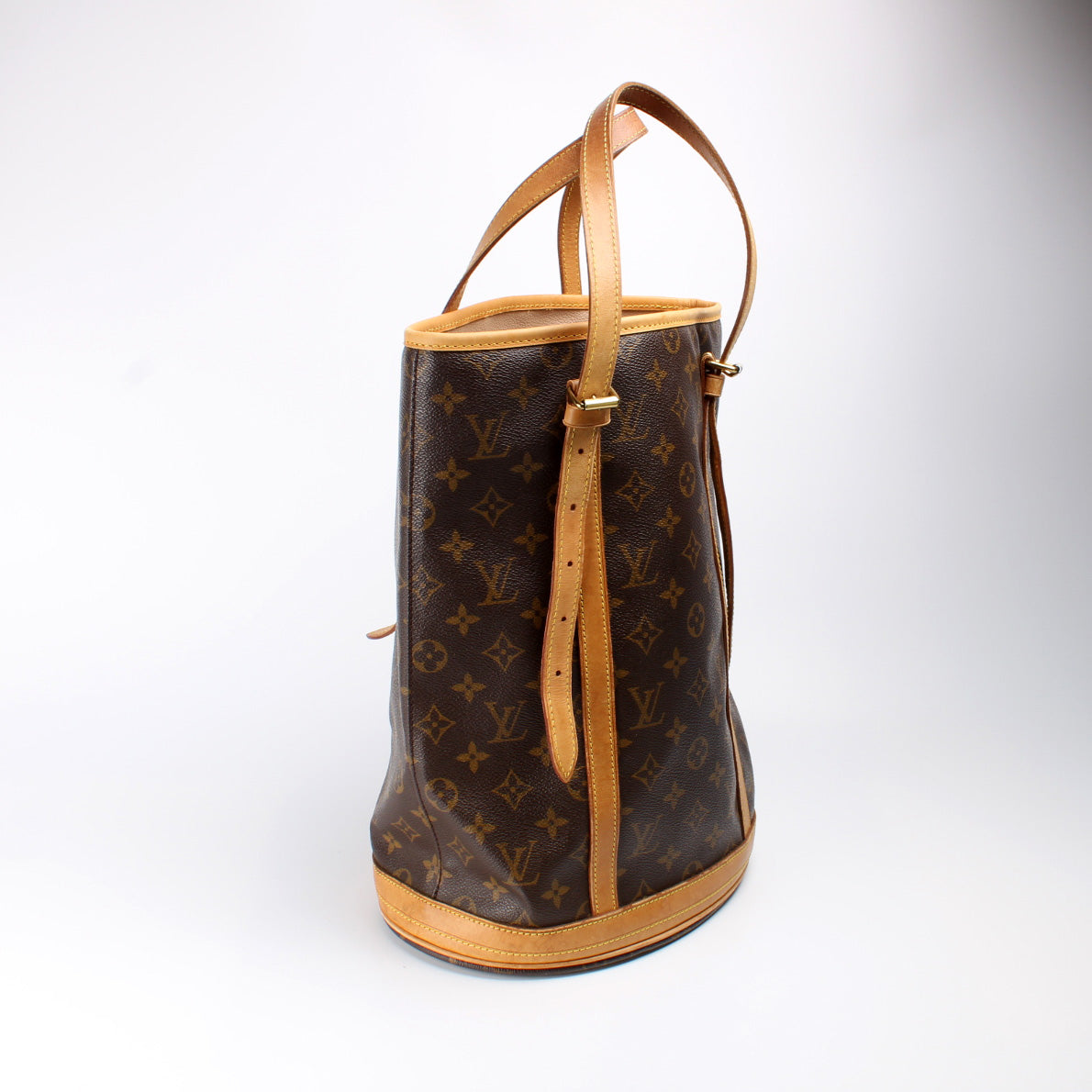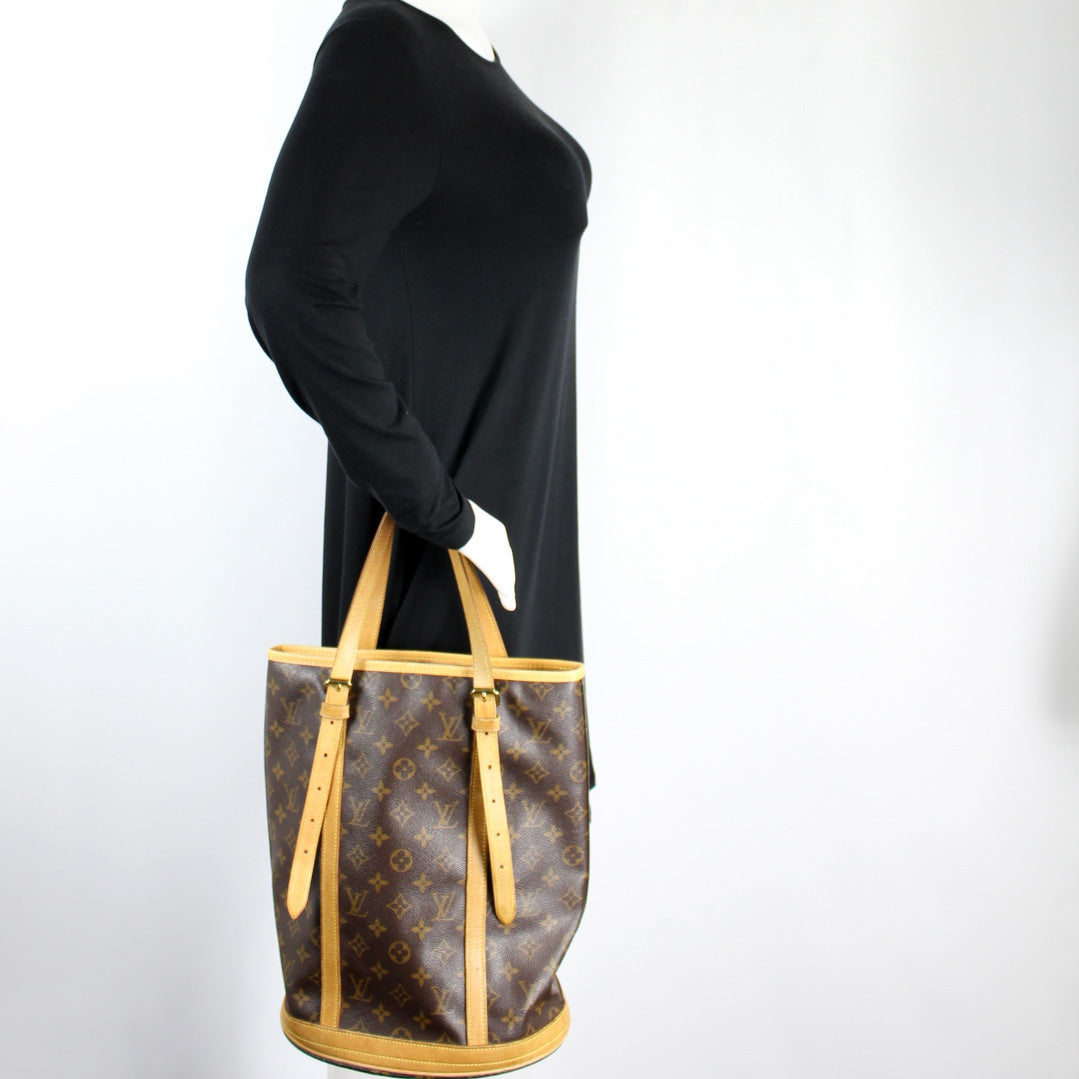 This pre-owned Louis Vuitton Bucket GM is guaranteed 100% authentic. The exterior is in the classic Louis Vuitton Monogram coated canvas.