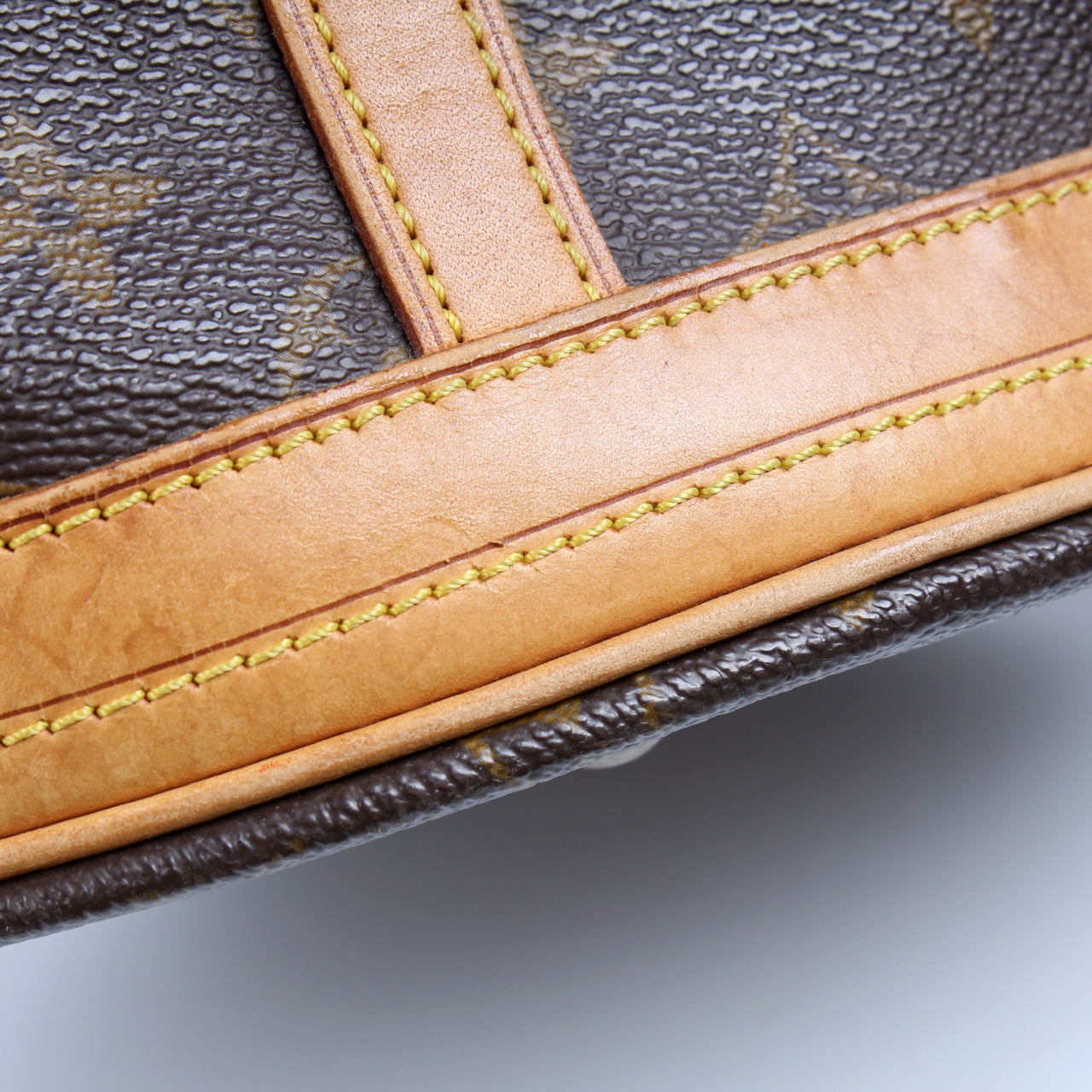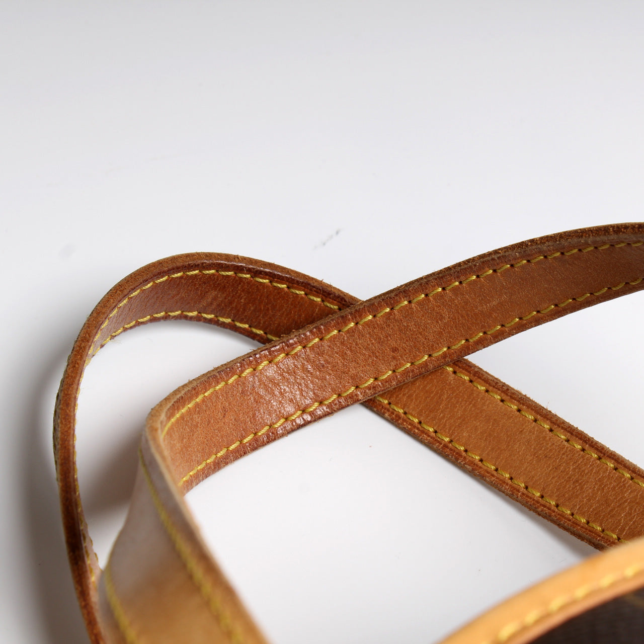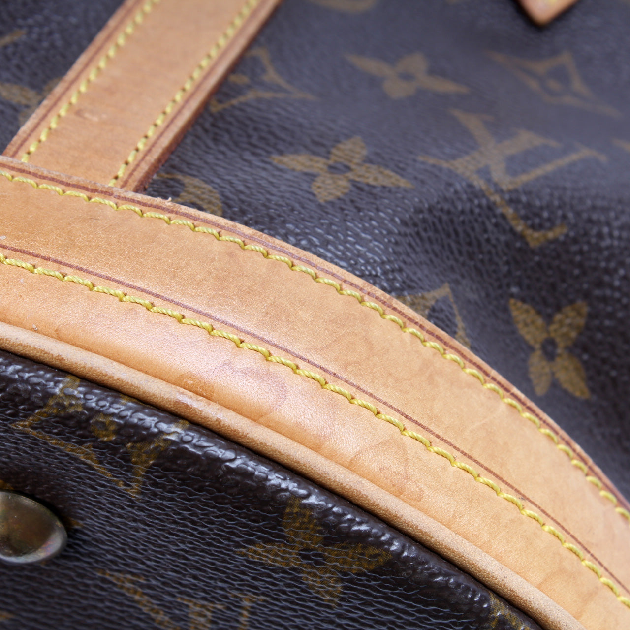 Handle: The leather handles show discoloration and wear as pictured.