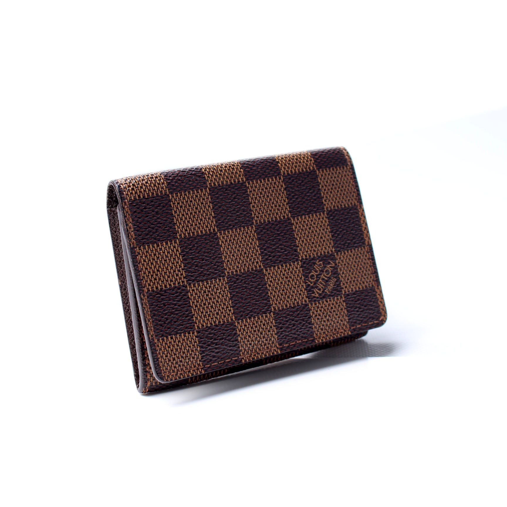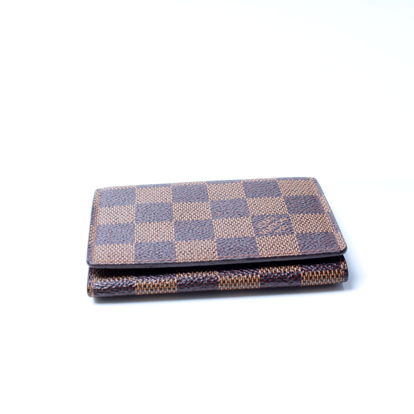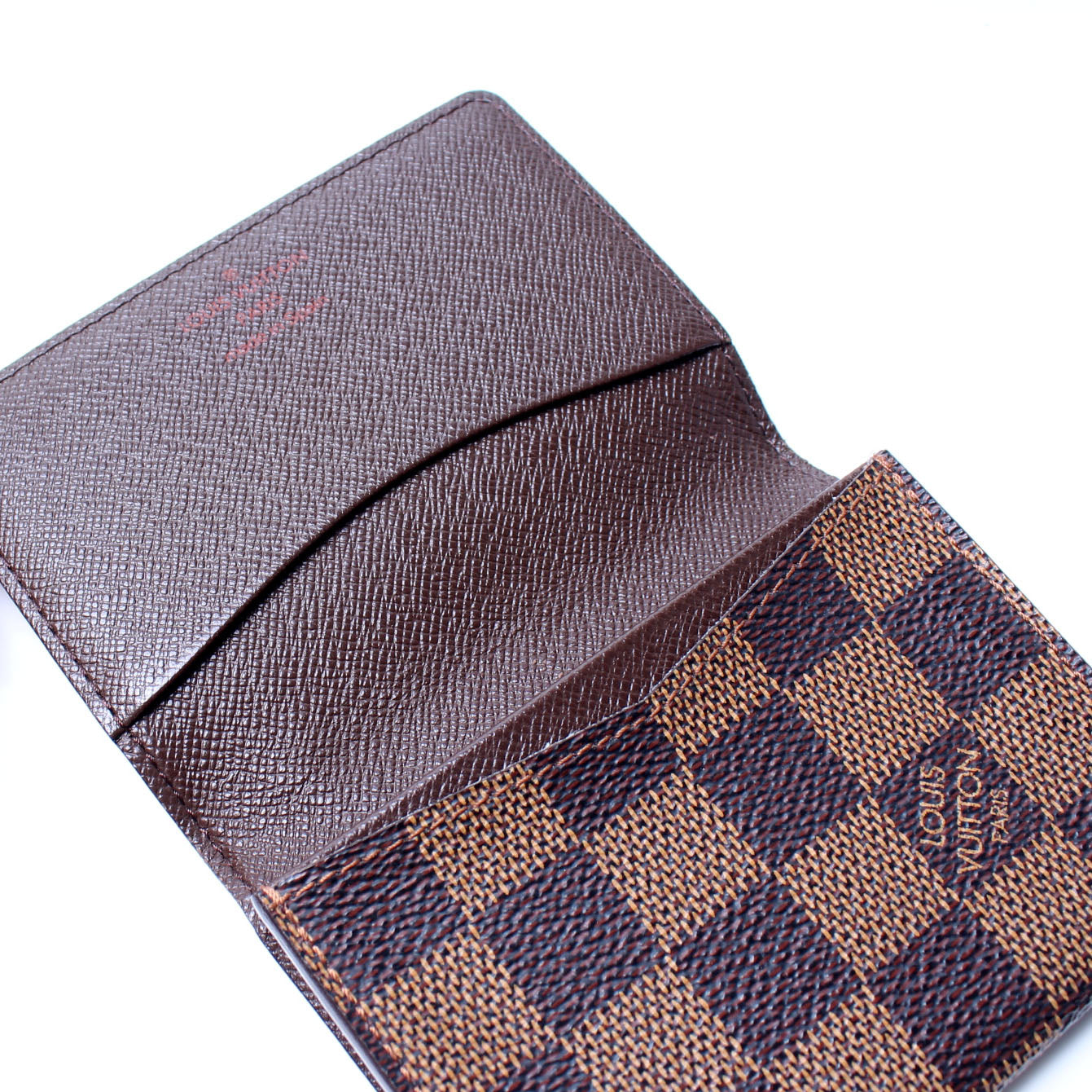 This pre-owned Louis Vuitton Business Card Holder is guaranteed 100% authentic. The exterior is in the classic Louis Vuitton Damier Ebene coated canvas.