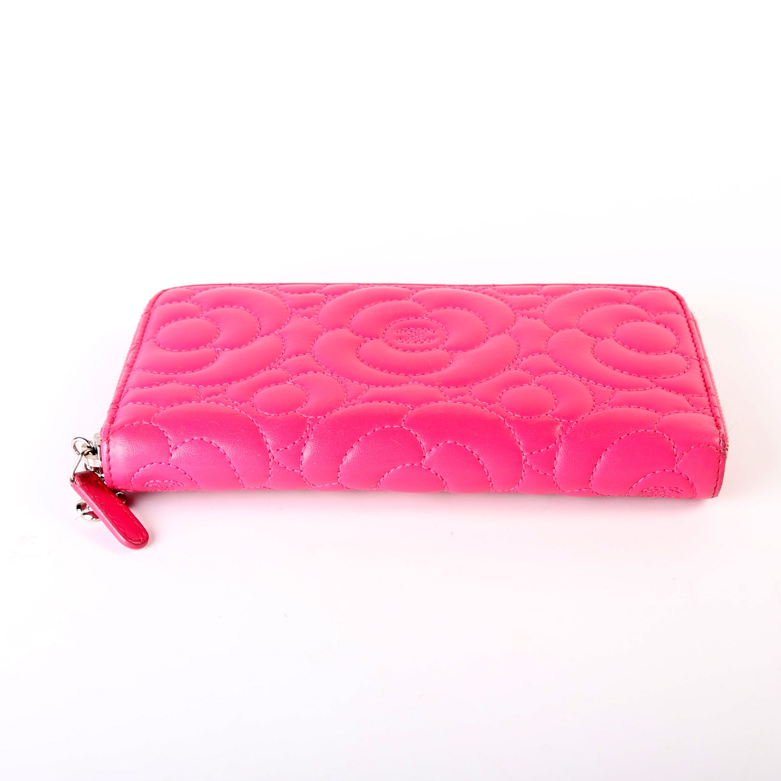 This pre-owned Chanel Camellia Zip Around Wallet is guaranteed 100% authentic. The exterior is in the classic Chanel Camellia Flower Lambskin leather.