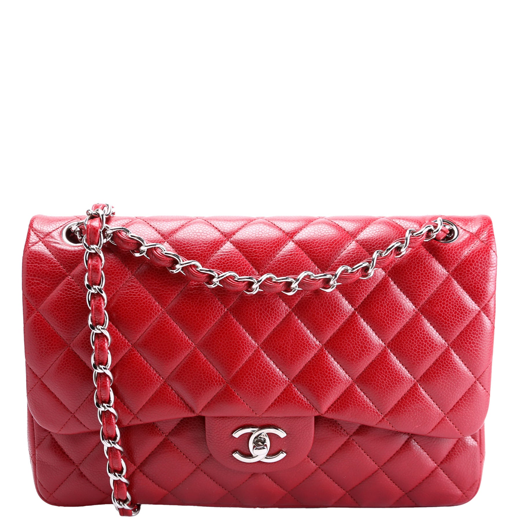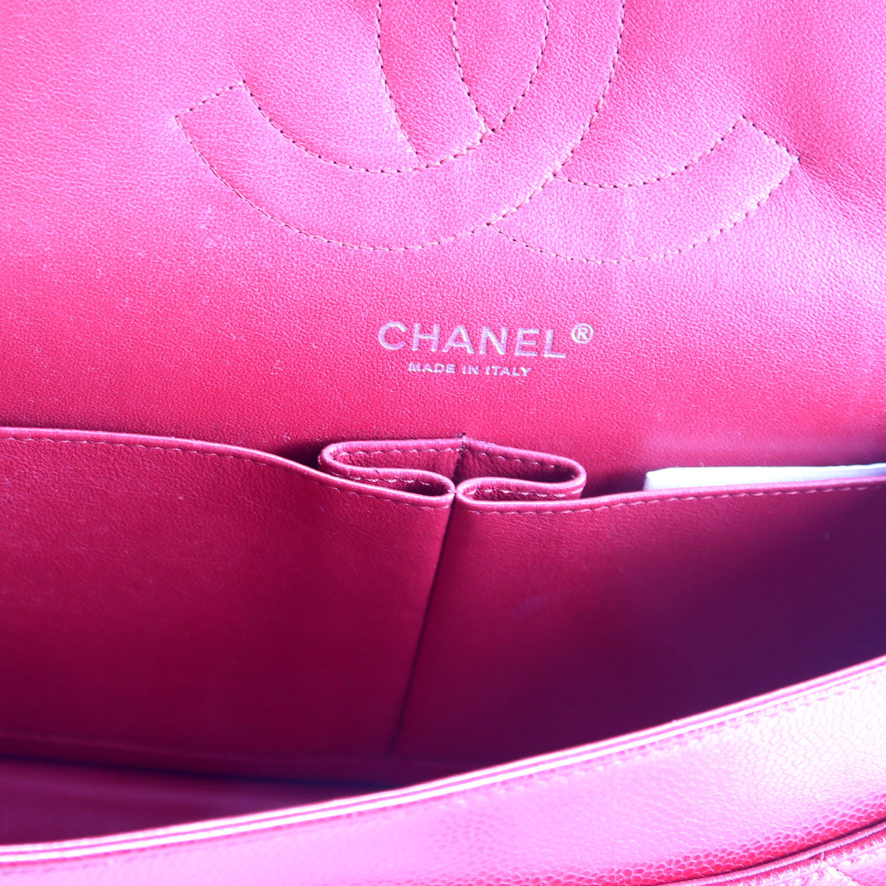 This pre-owned Chanel Classic Flap Jumbo is guaranteed 100% authentic. The exterior is in the classic Chanel Caviar leather.