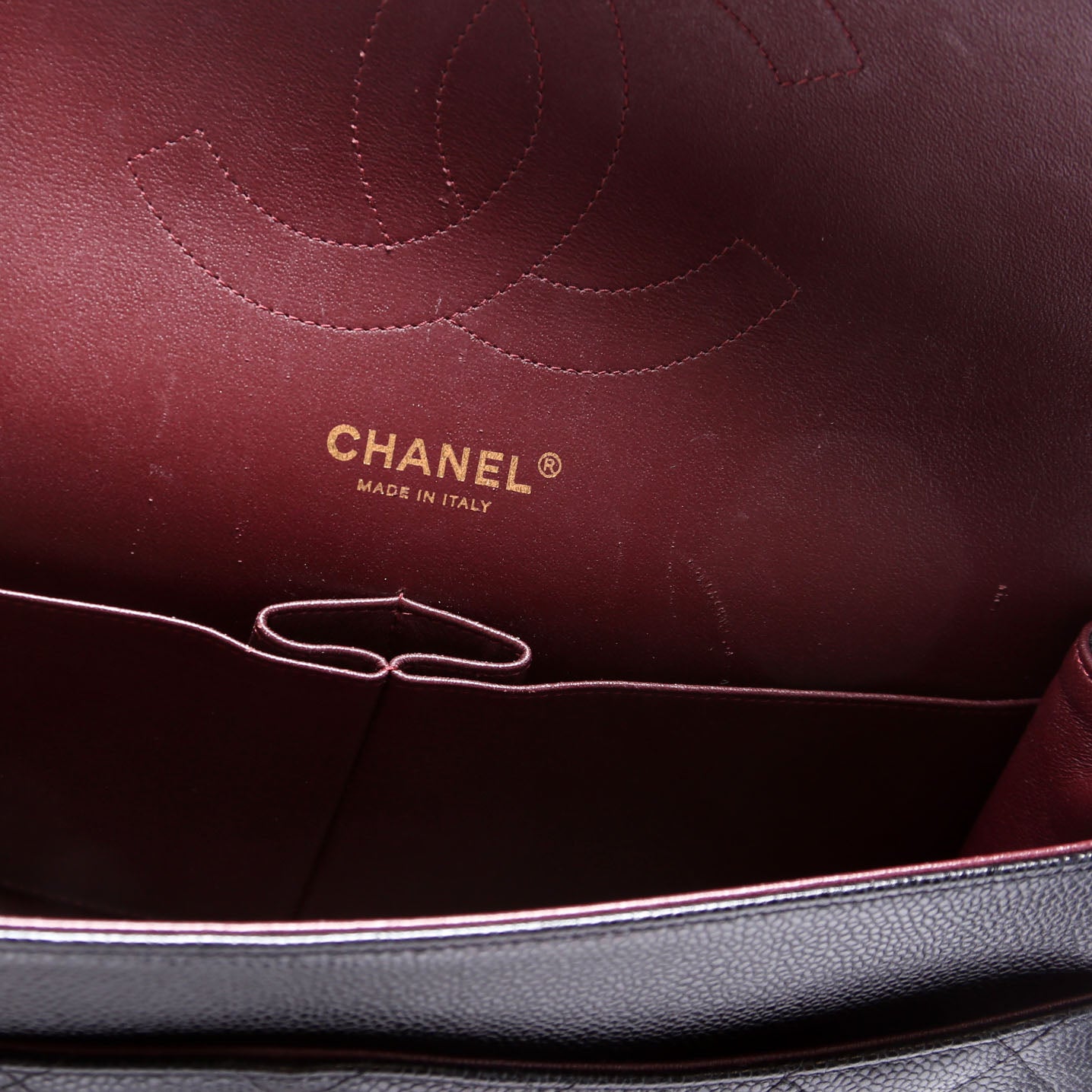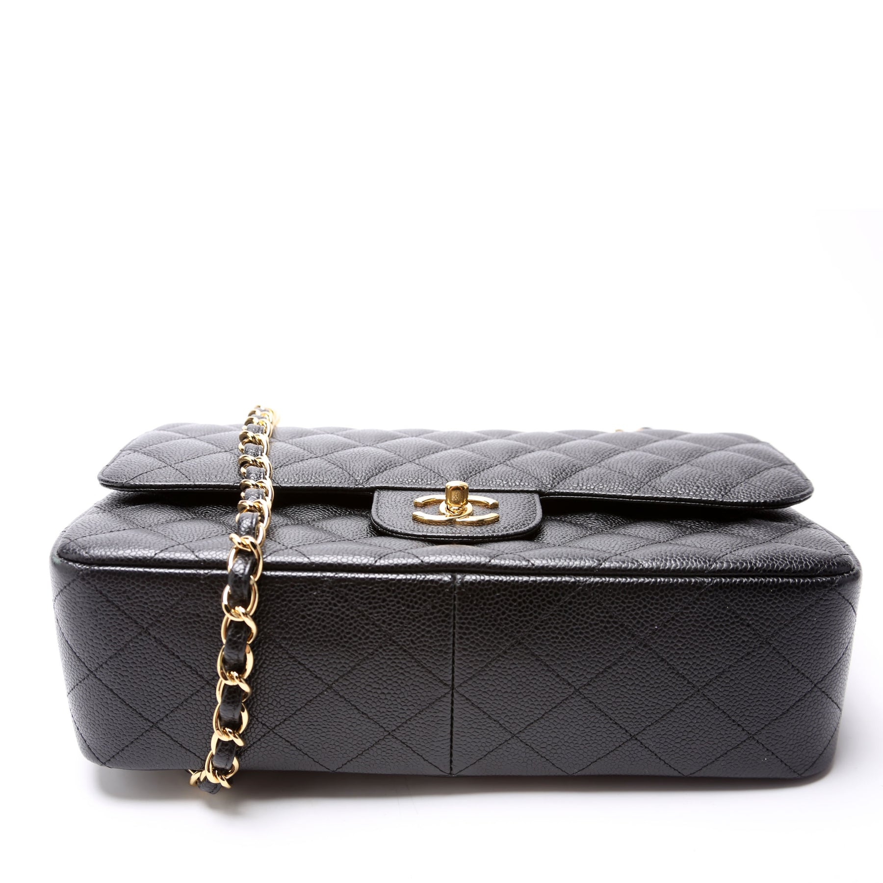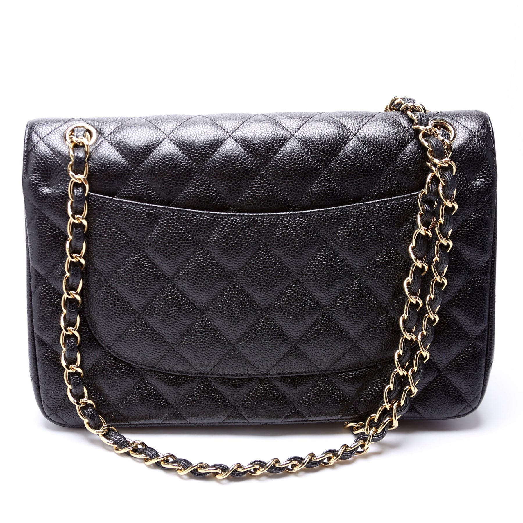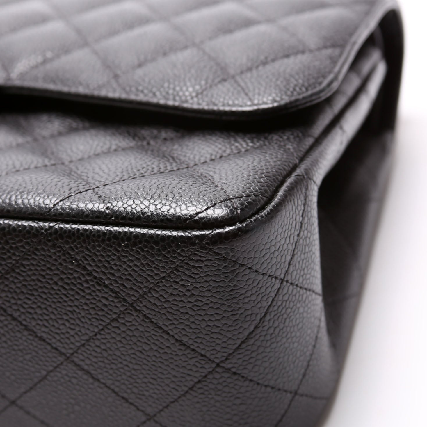 This pre-owned Chanel Classic Flap Jumbo is guaranteed 100% authentic. The exterior is in the classic Chanel Caviar Leather.