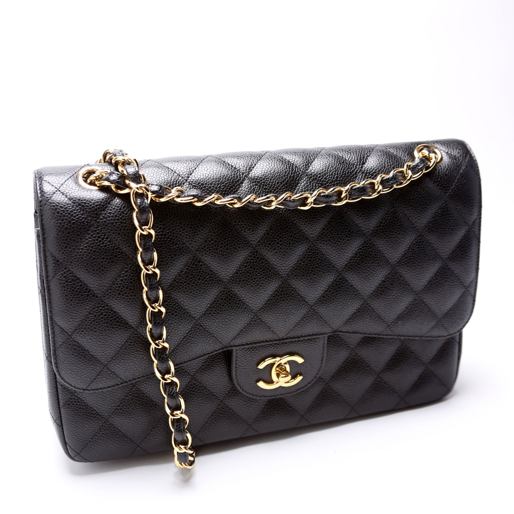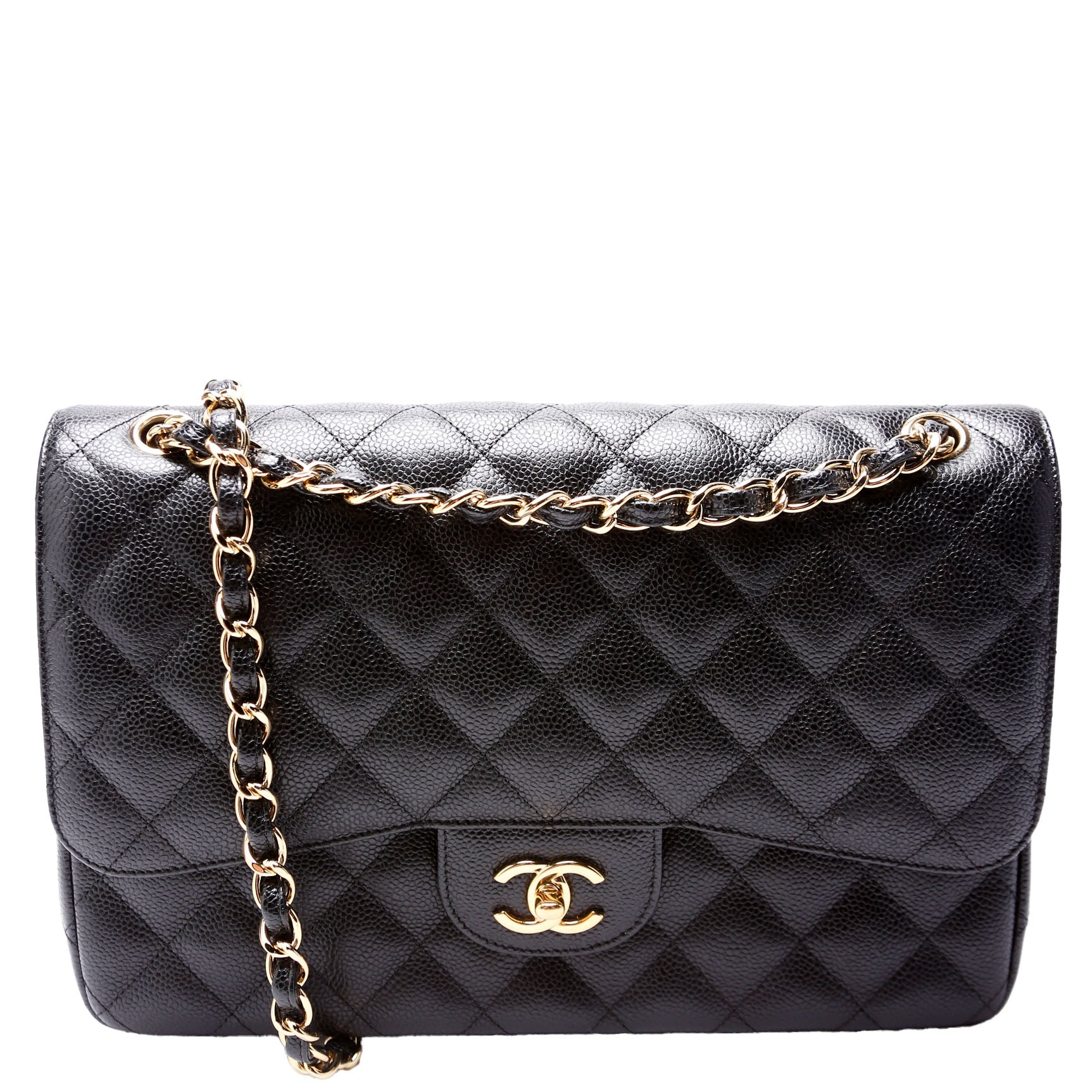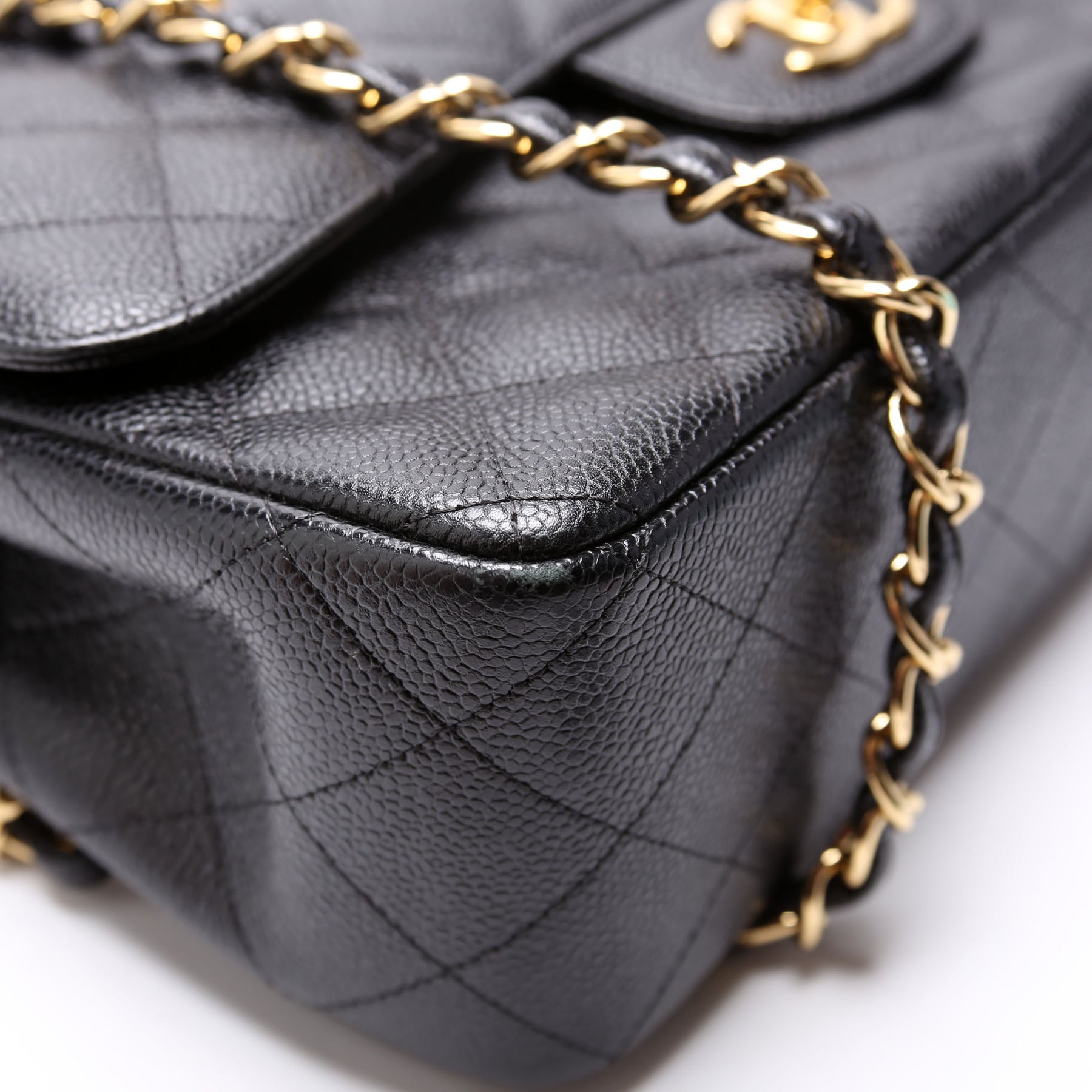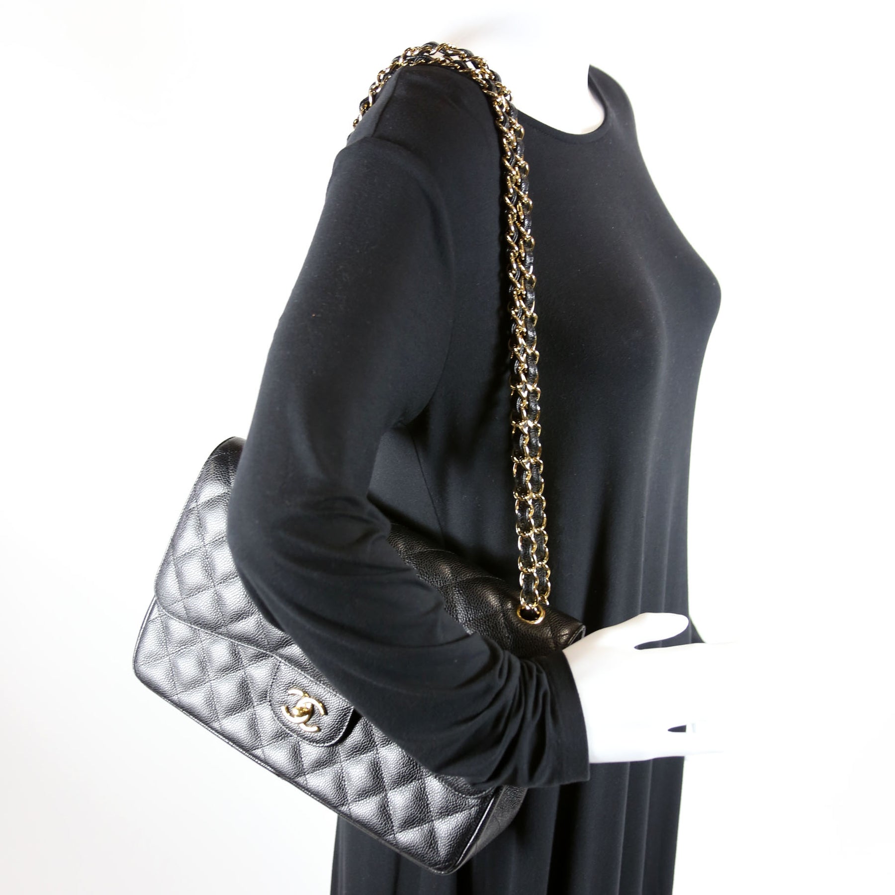 This pre-owned Chanel Classic Flap Jumbo is guaranteed 100% authentic. The exterior is in the classic Chanel Caviar Leather.