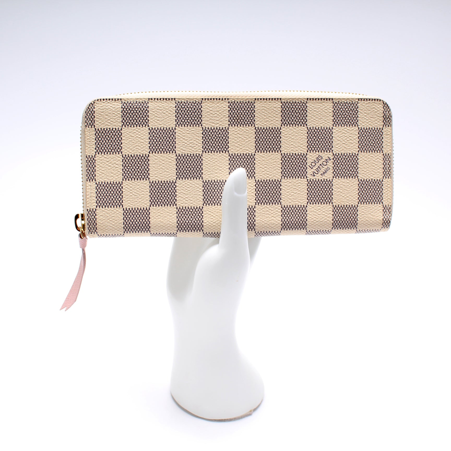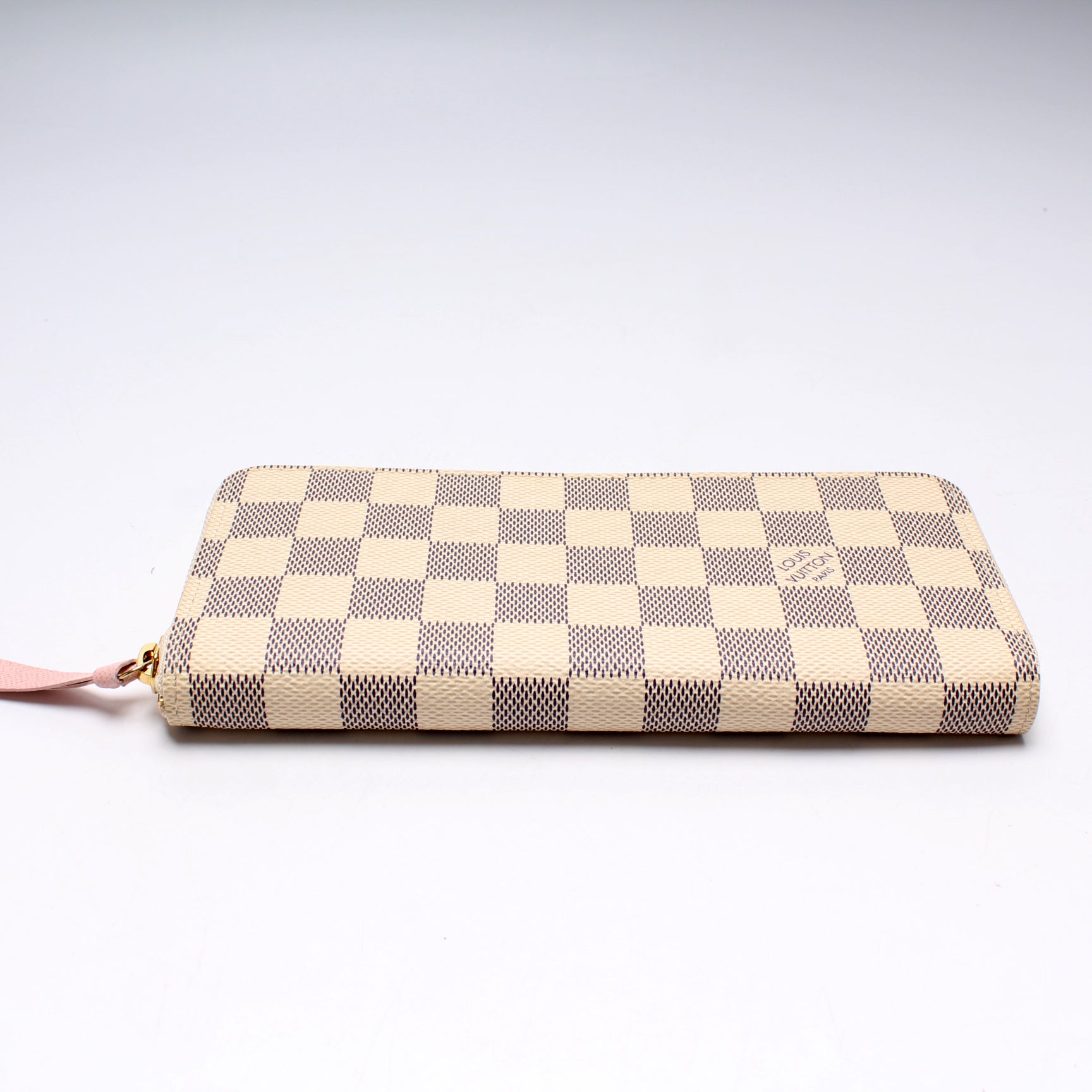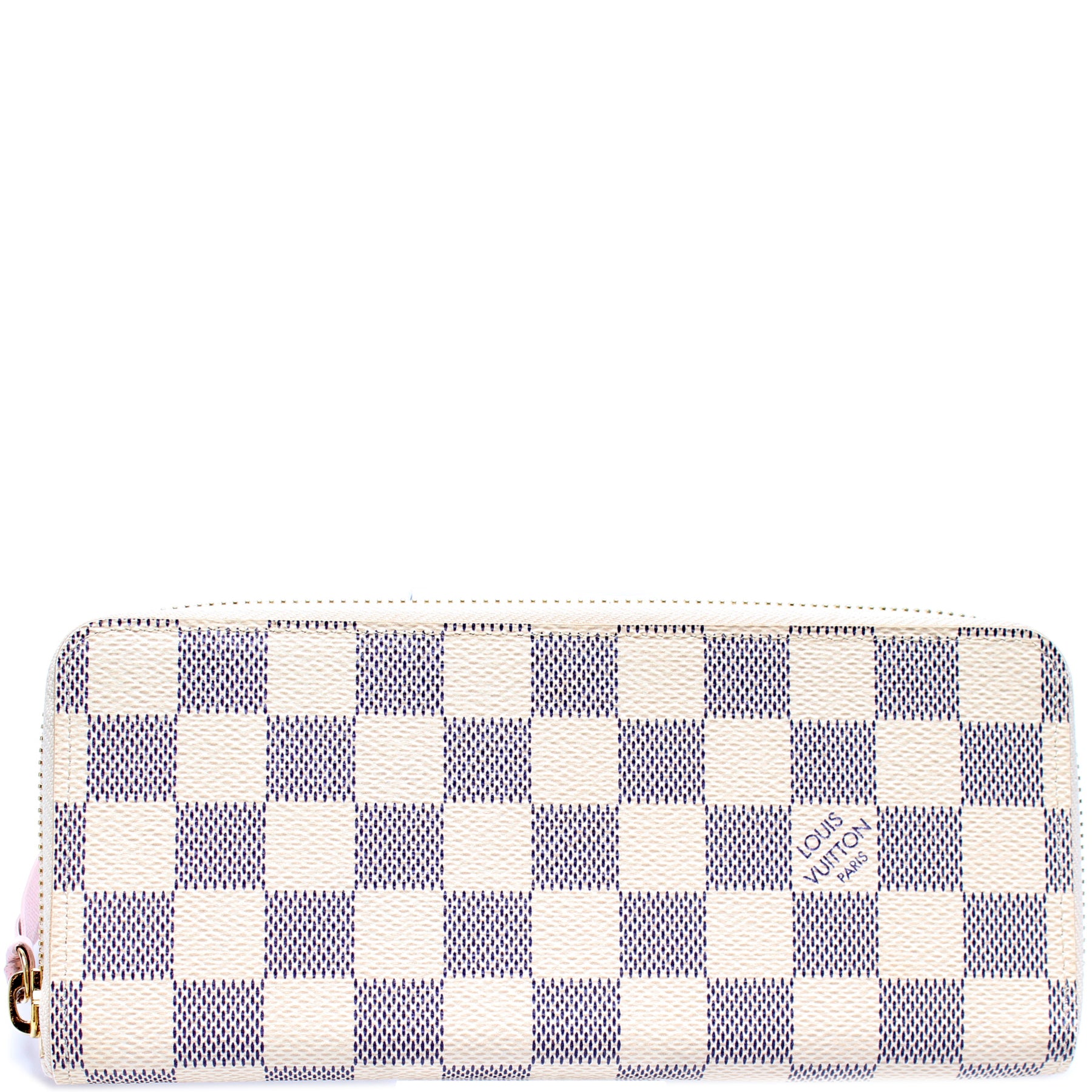 This pre-owned Louis Vuitton Clemence Wallet is guaranteed 100% authentic. The exterior is in the classic Louis Vuitton Damier Azur coated canvas.