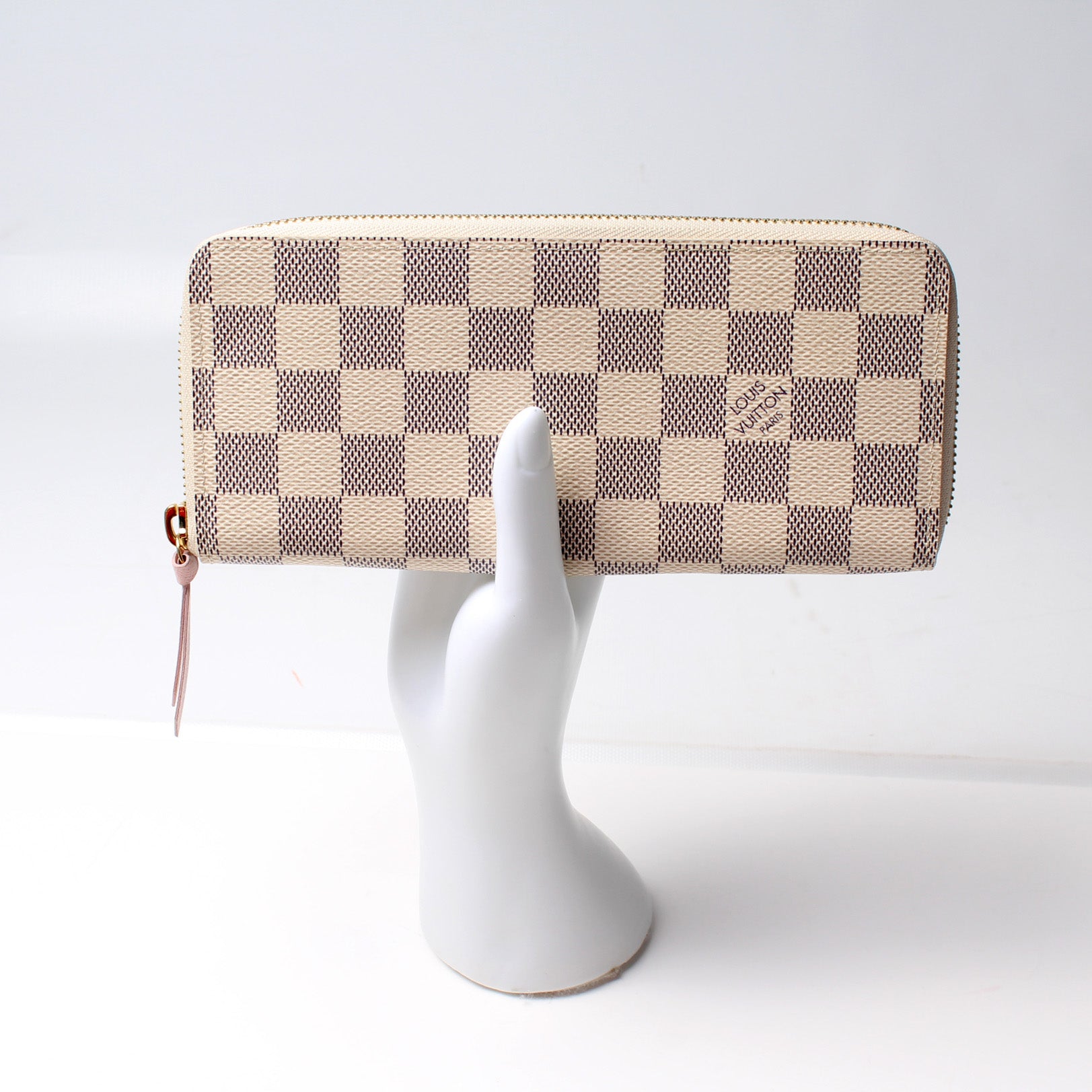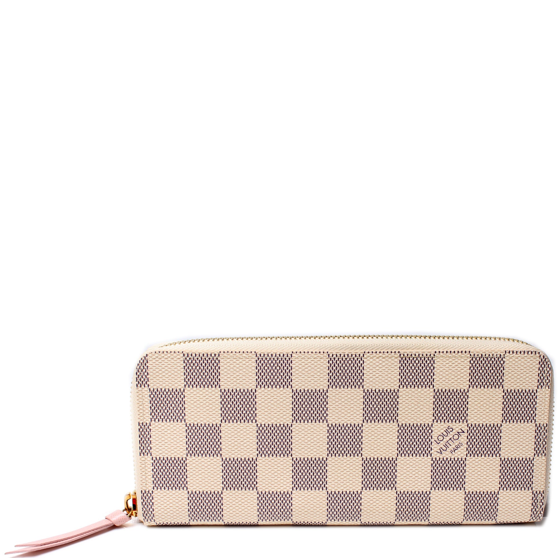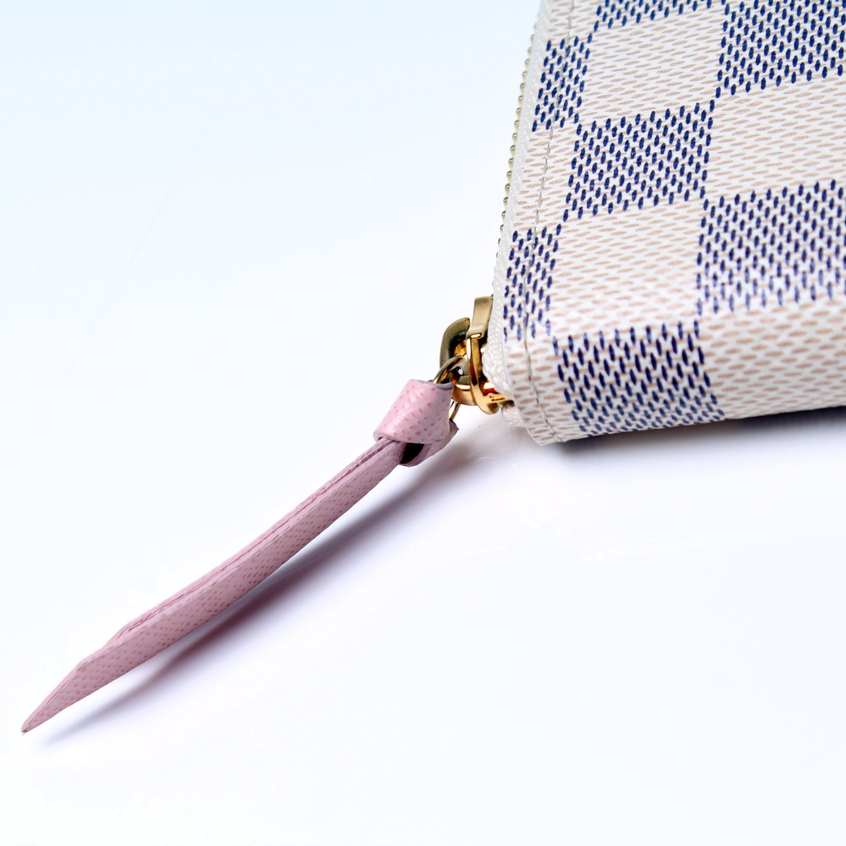 This pre-owned Louis Vuitton Clemence Wallet is guaranteed 100% authentic. The exterior is in the classic Louis Vuitton Damier Azur coated canvas.