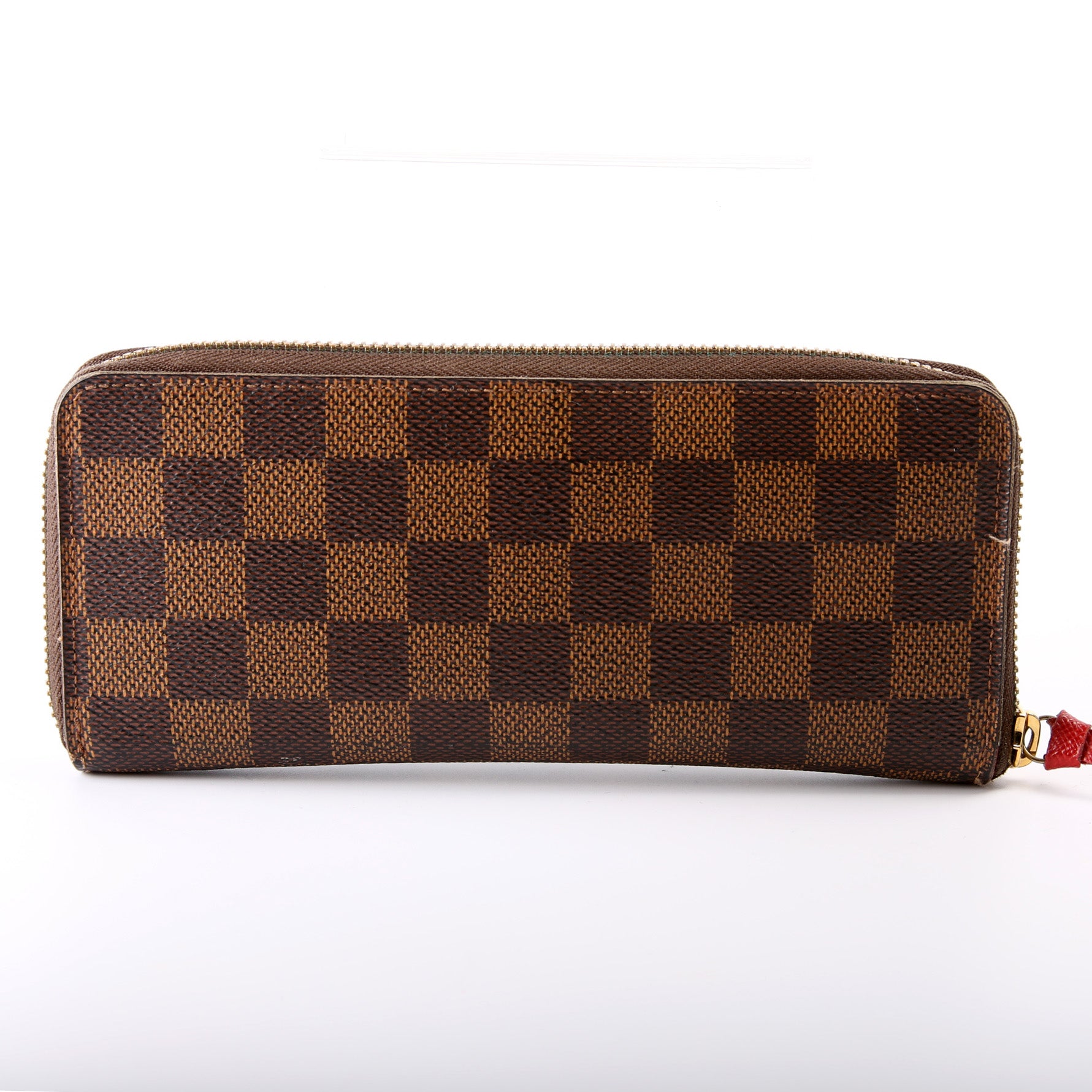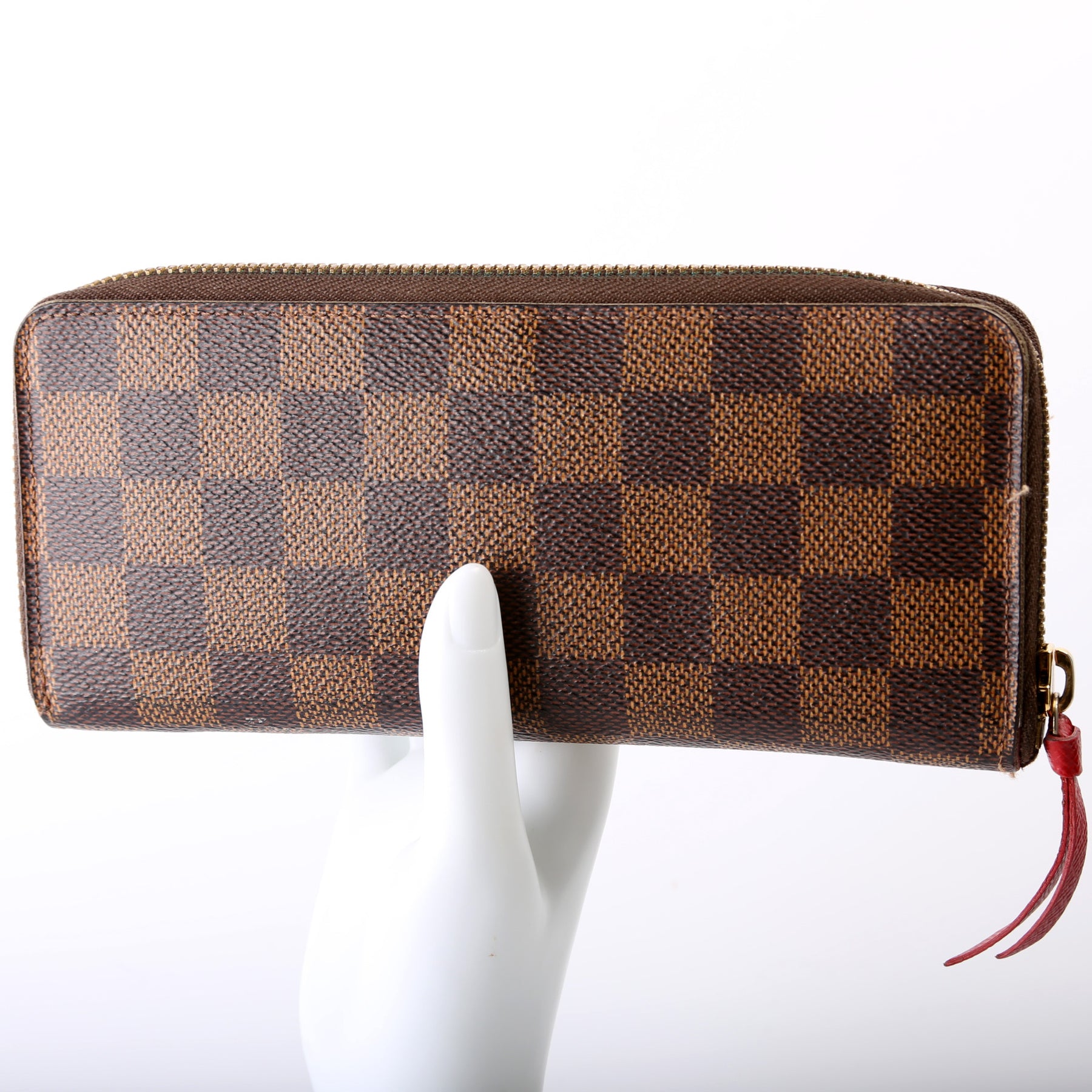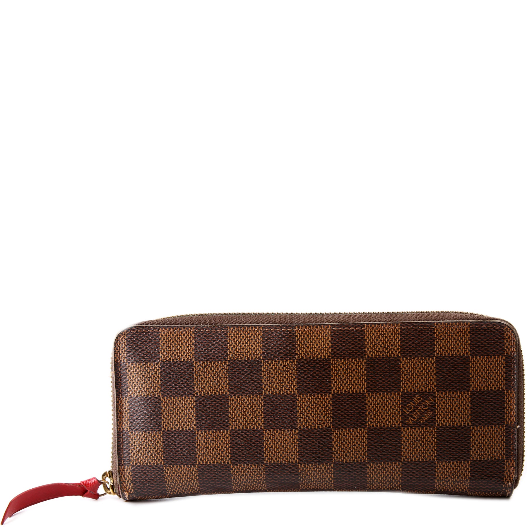 This pre-owned Louis Vuitton Clemence Wallet is guaranteed 100% authentic. The exterior is in the classic Louis Vuitton Damier Ebene coated canvas.