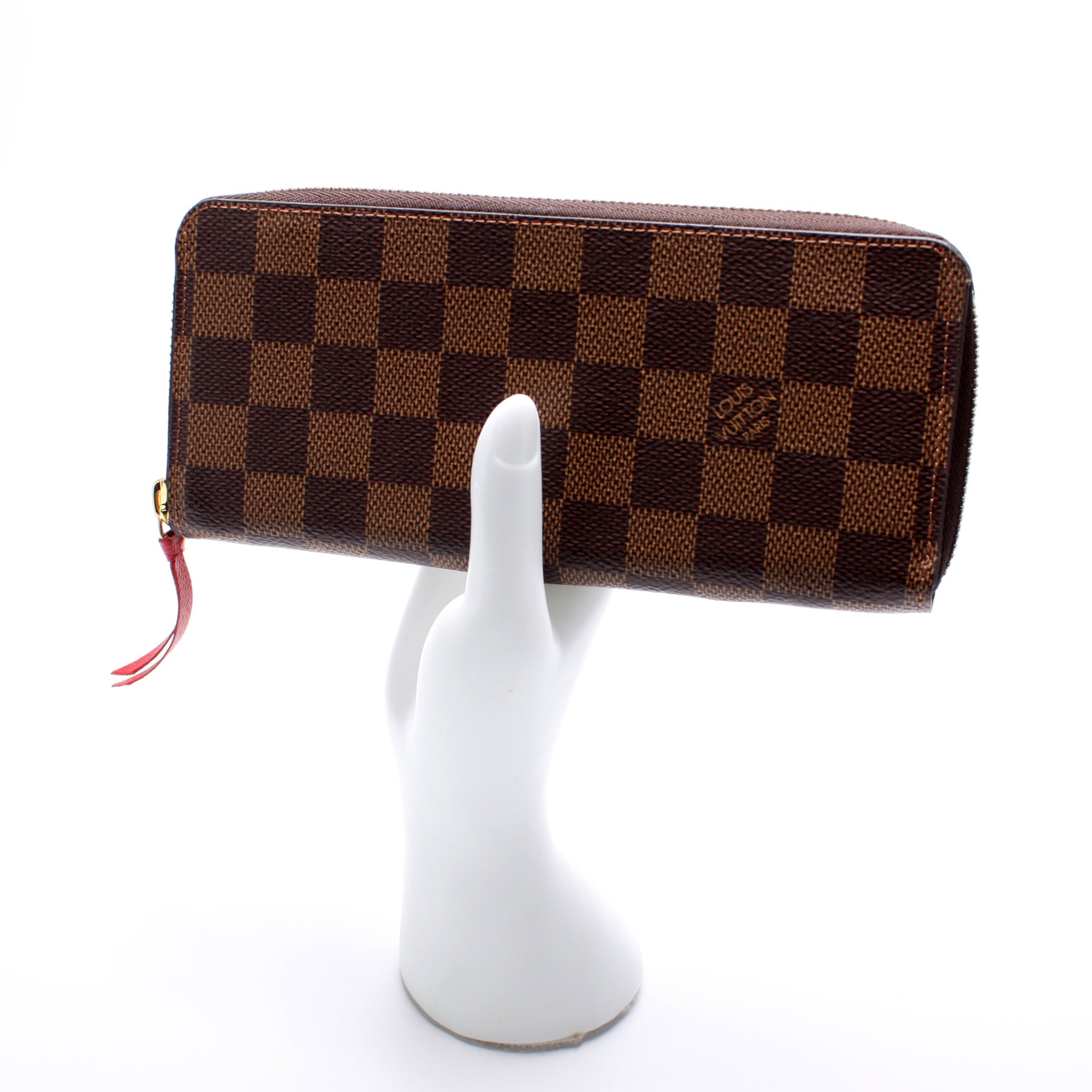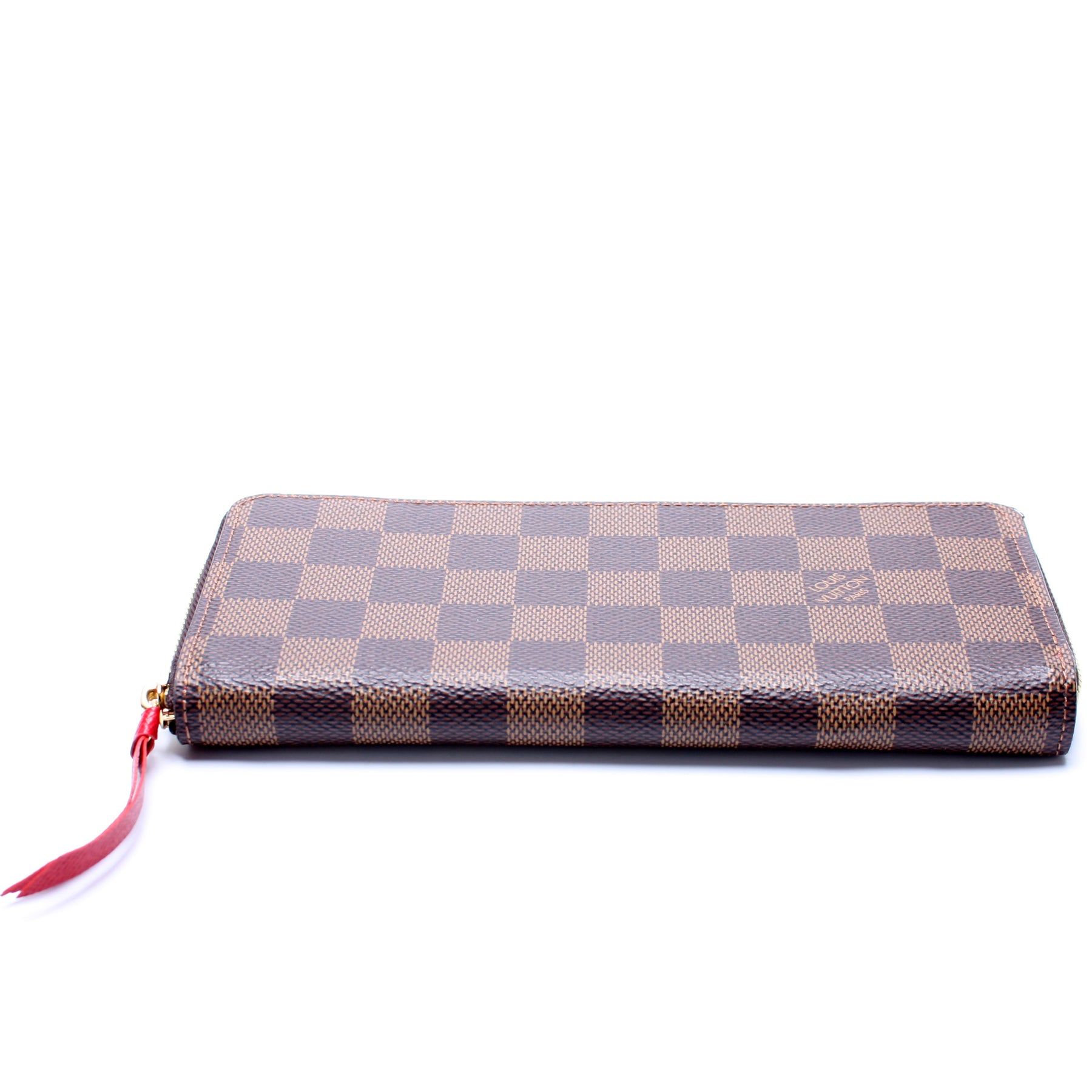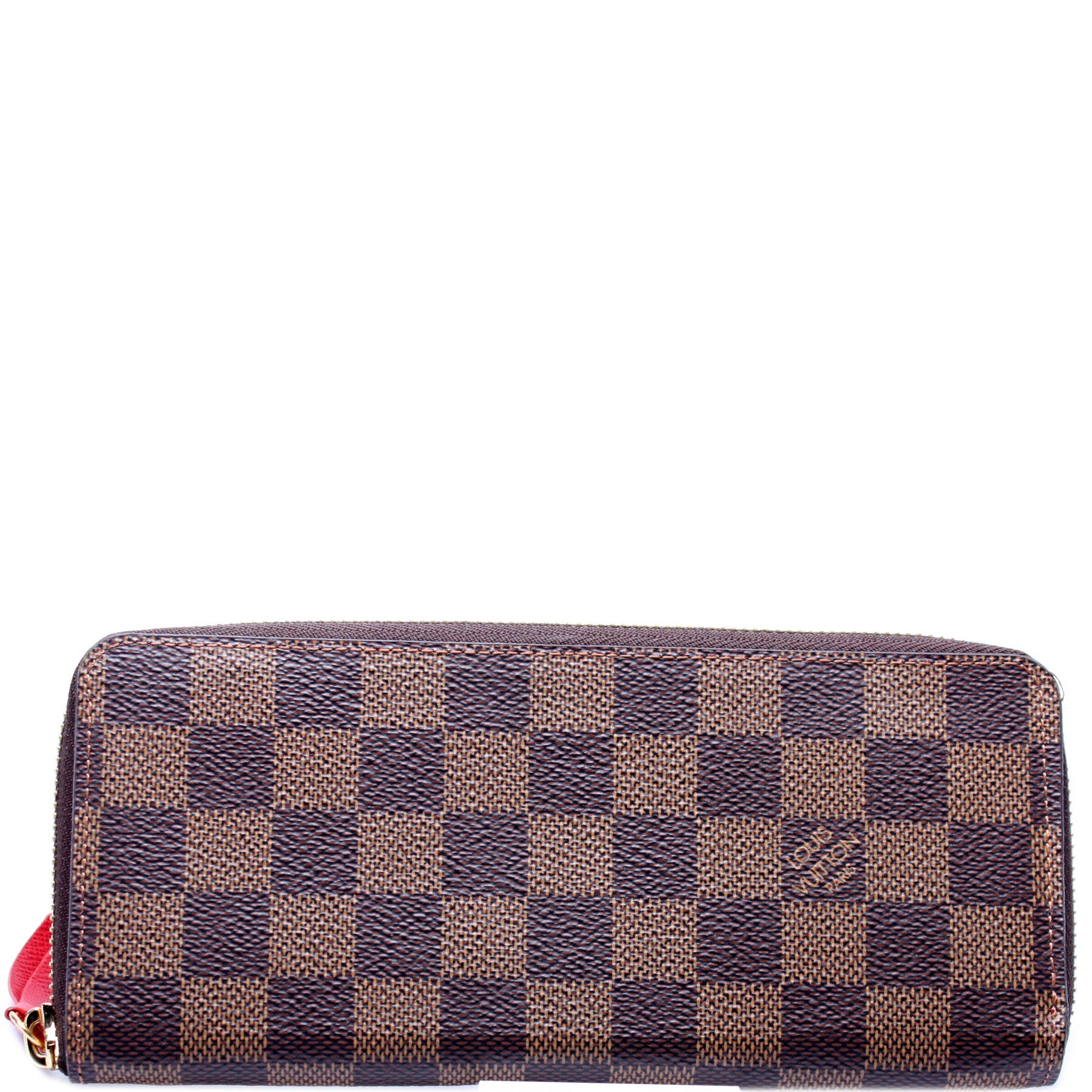 This pre-owned Louis Vuitton Clemence Wallet is guaranteed 100% authentic. The exterior is in the classic Louis Vuitton Damier Ebene coated canvas.