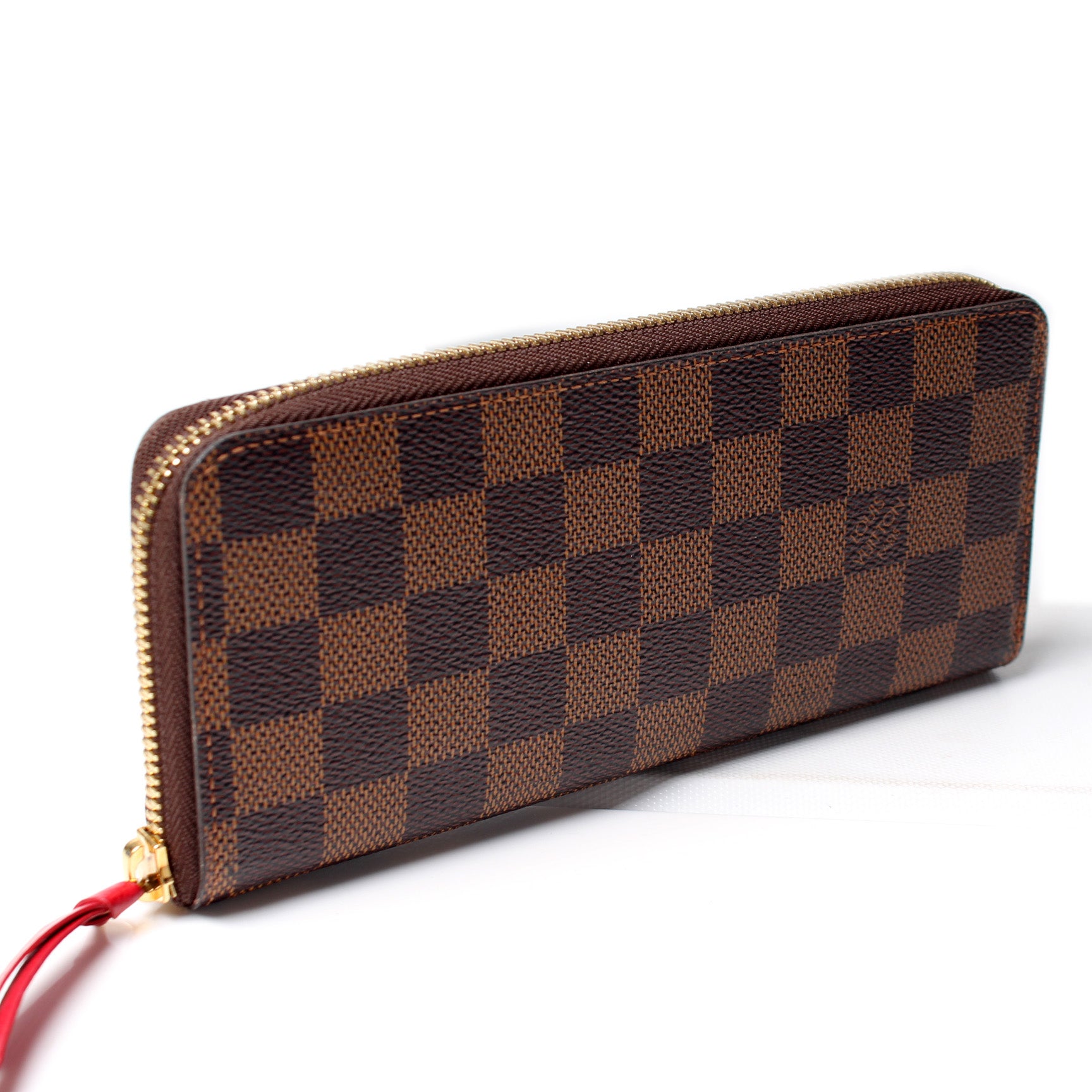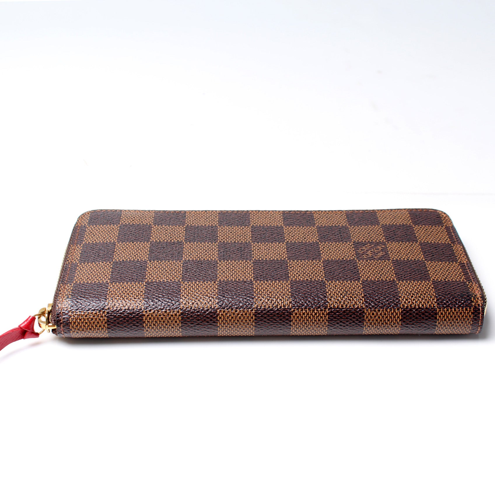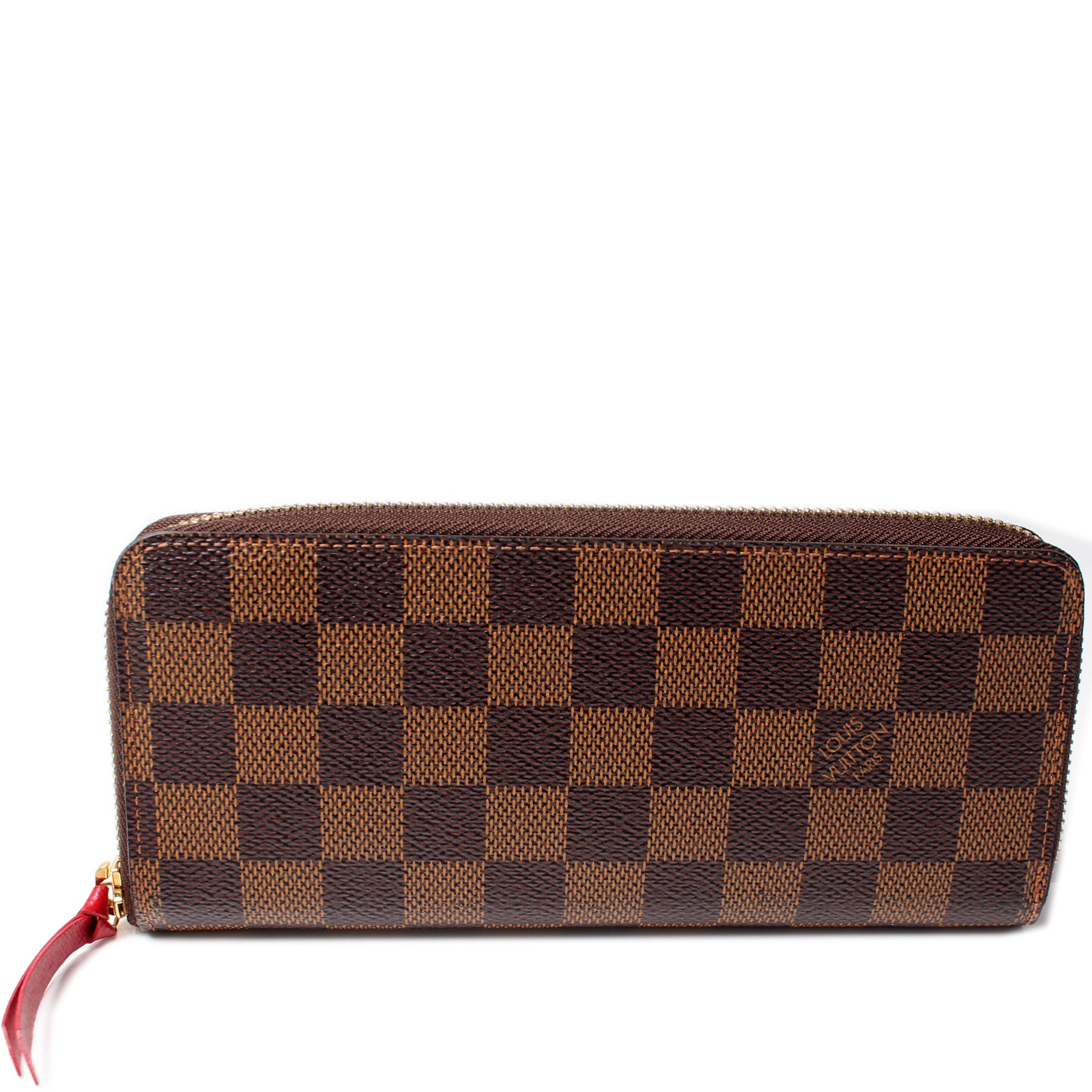 This pre-owned Louis Vuitton Clemence Wallet is guaranteed 100% authentic. The exterior is in the classic Louis Vuitton Damier Ebene coated canvas.