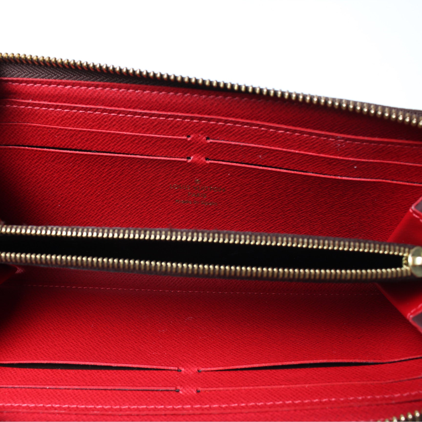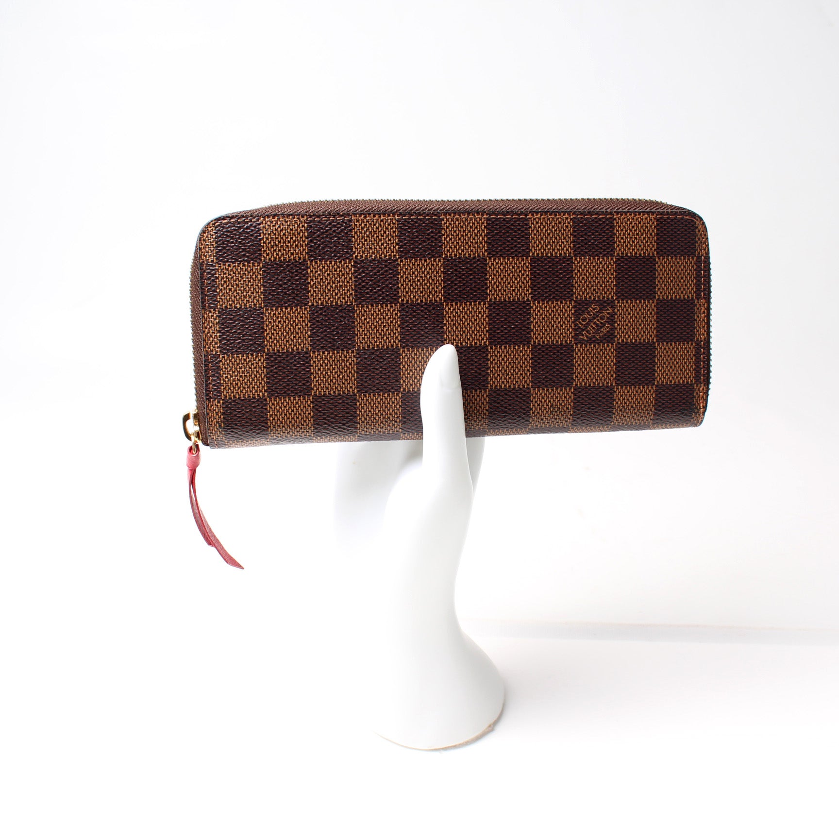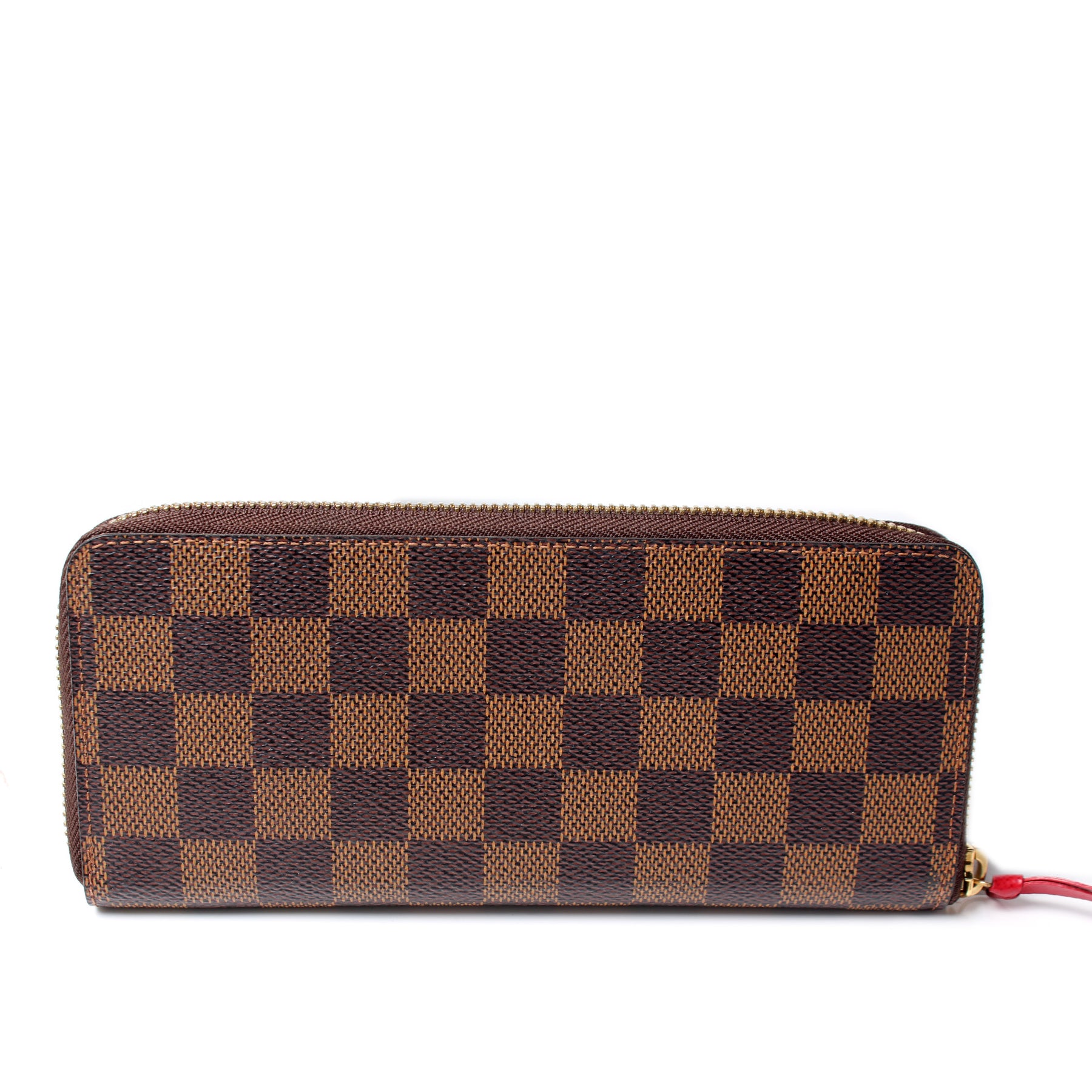 This pre-owned Louis Vuitton Clemence Wallet is guaranteed 100% authentic. The exterior is in the classic Louis Vuitton Damier Ebene coated canvas.