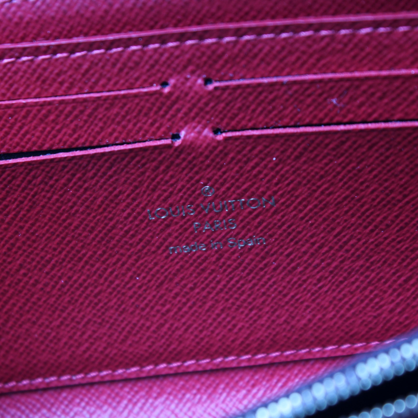 Interior: The interior has light staining, and is free of rips or tears. The interior features eight card slots, four bill slots, and one zip closure coin pouch.