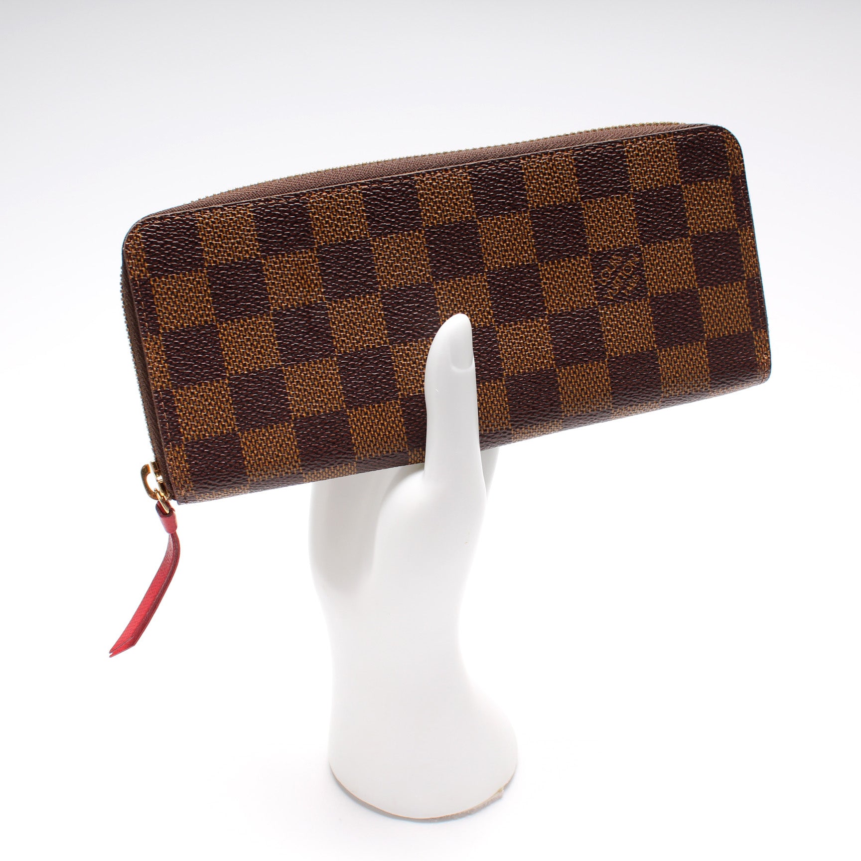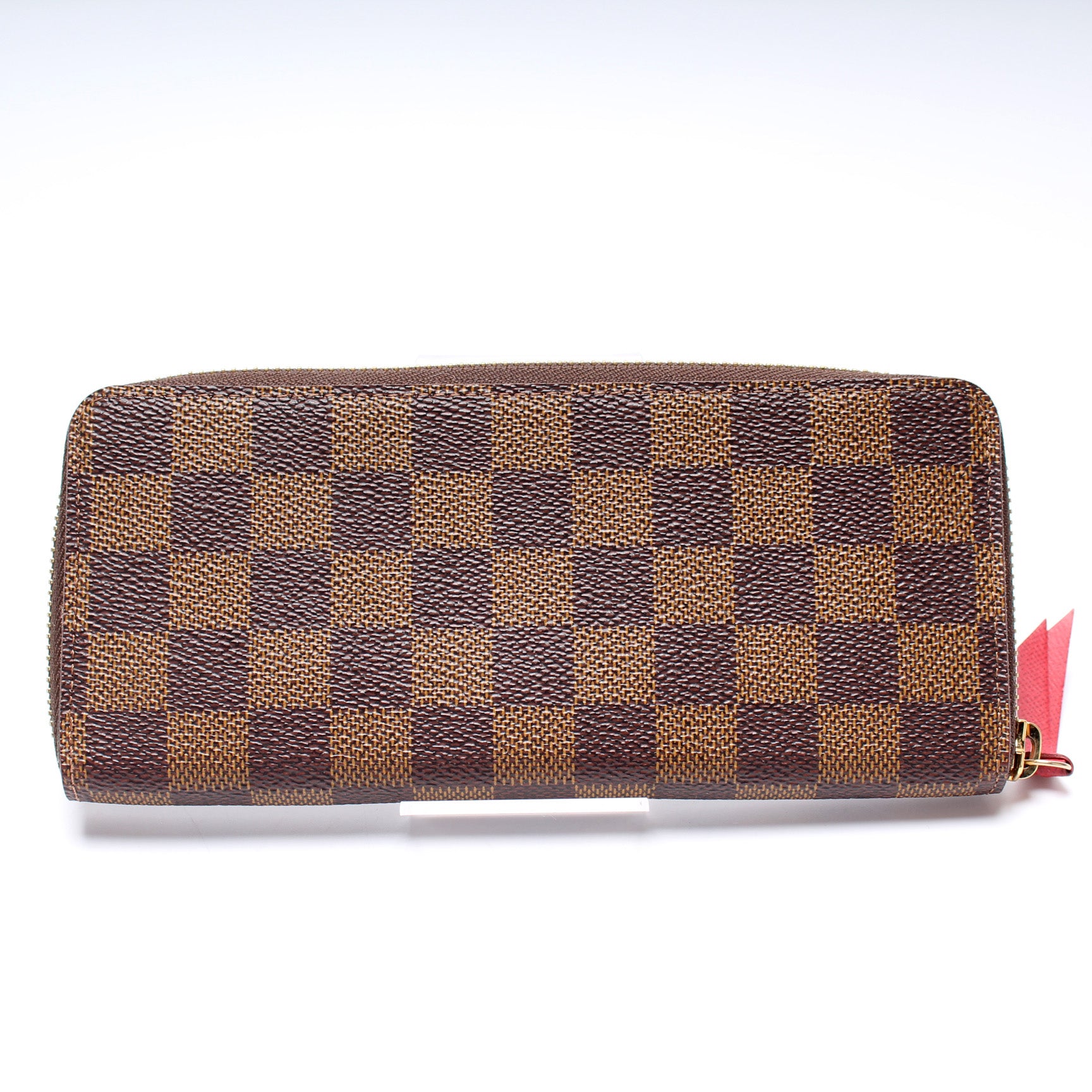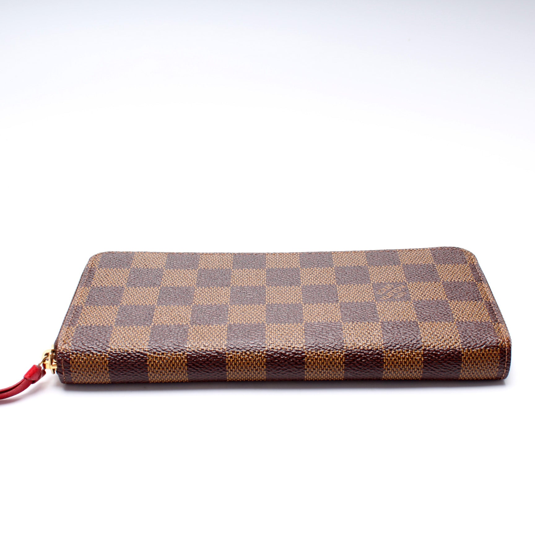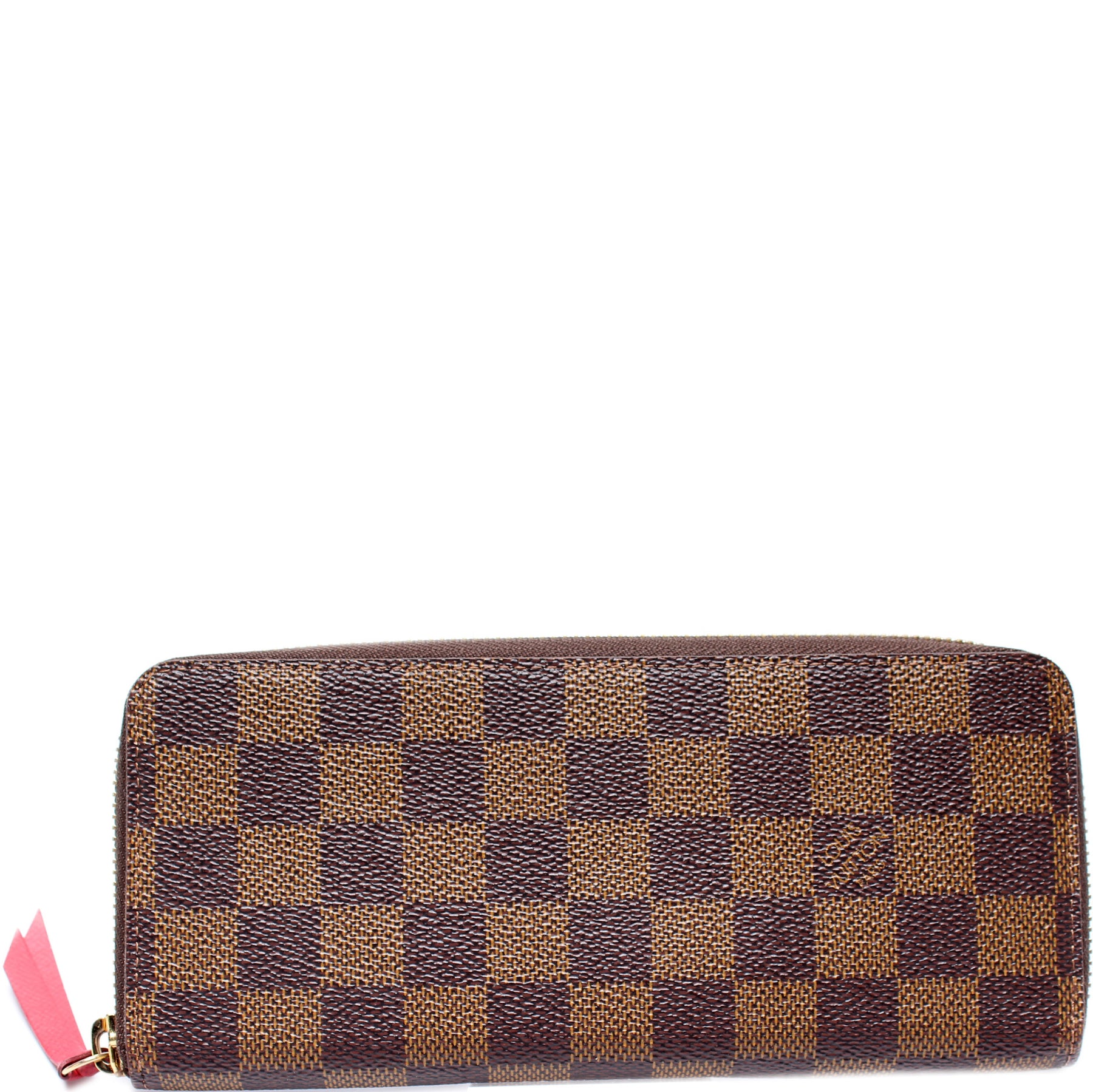 This pre-owned Louis Vuitton Clemence Wallet is guaranteed 100% authentic. The exterior is in the classic Louis Vuitton Damier Ebene coated canvas.