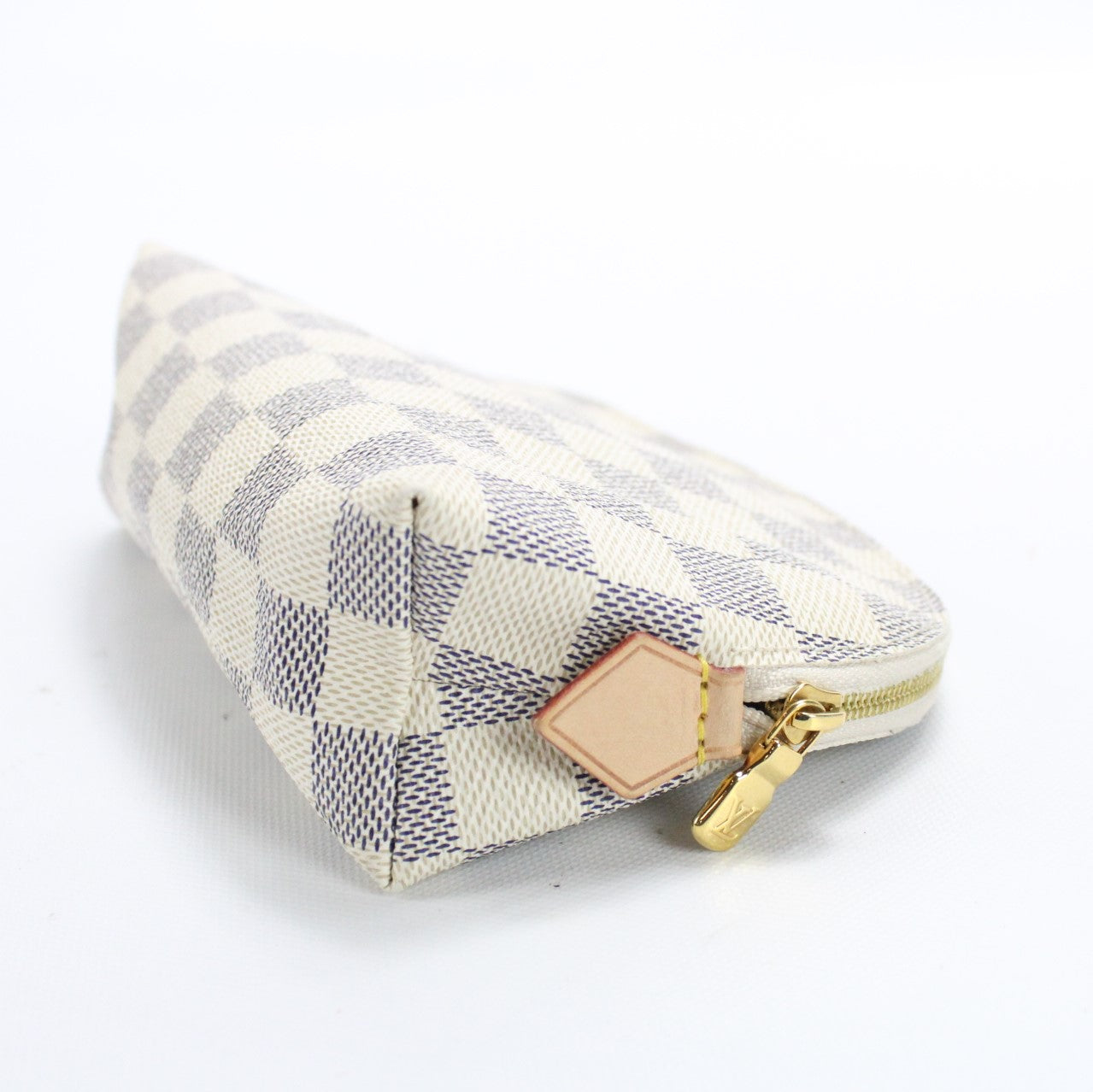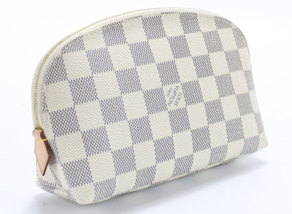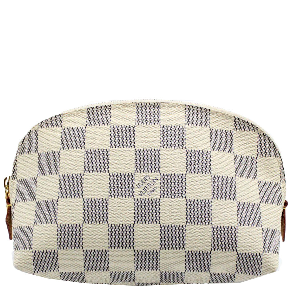 This pre-owned Louis Vuitton Cosmetic Case MM Azur is guaranteed 100% authentic. The exterior is in the classic Louis Vuitton Damier Azur coated canvas.