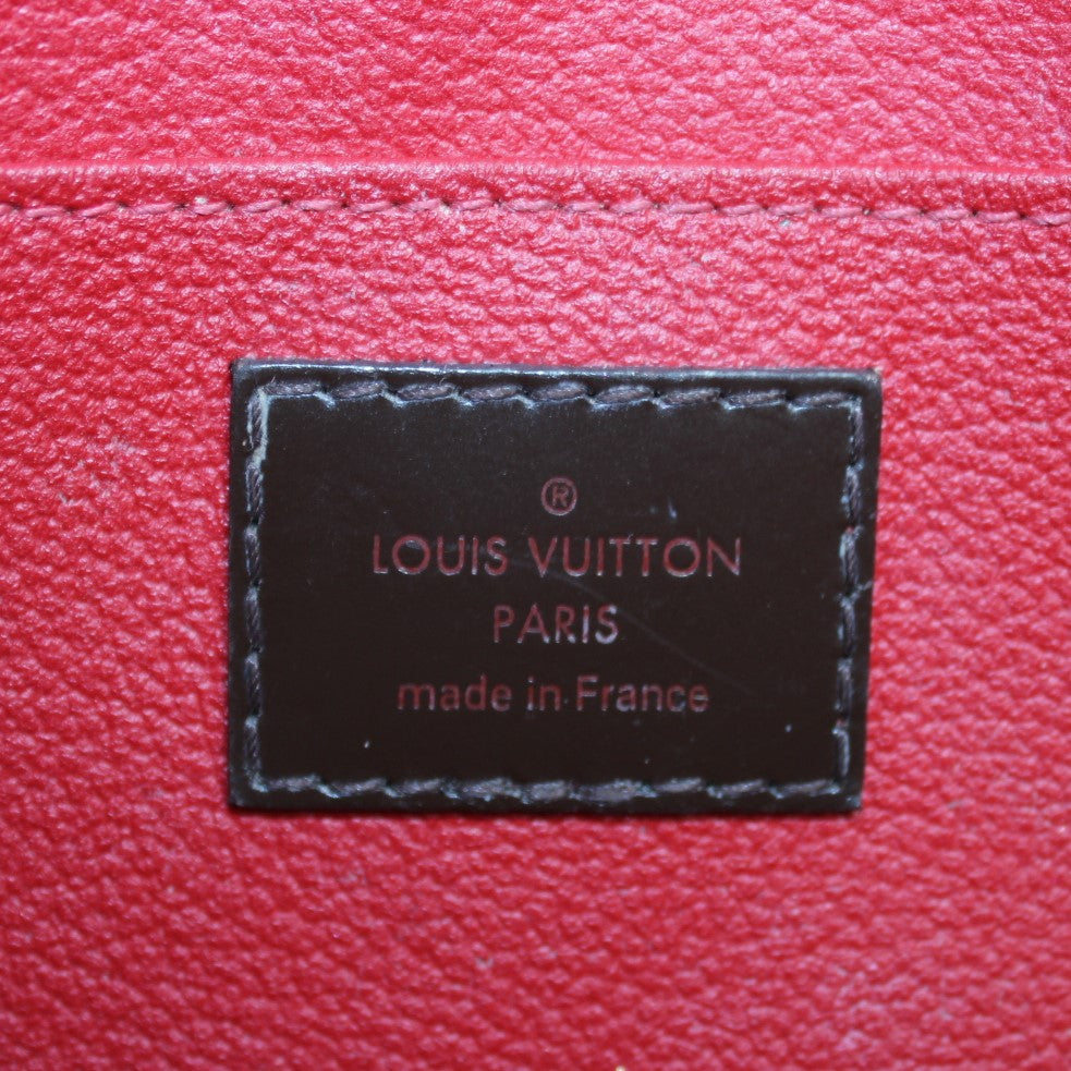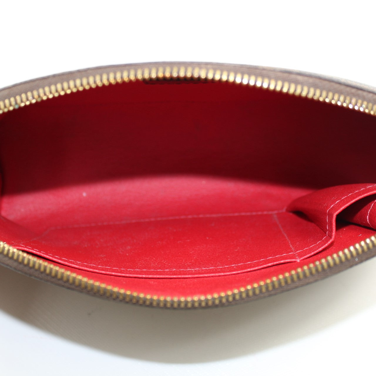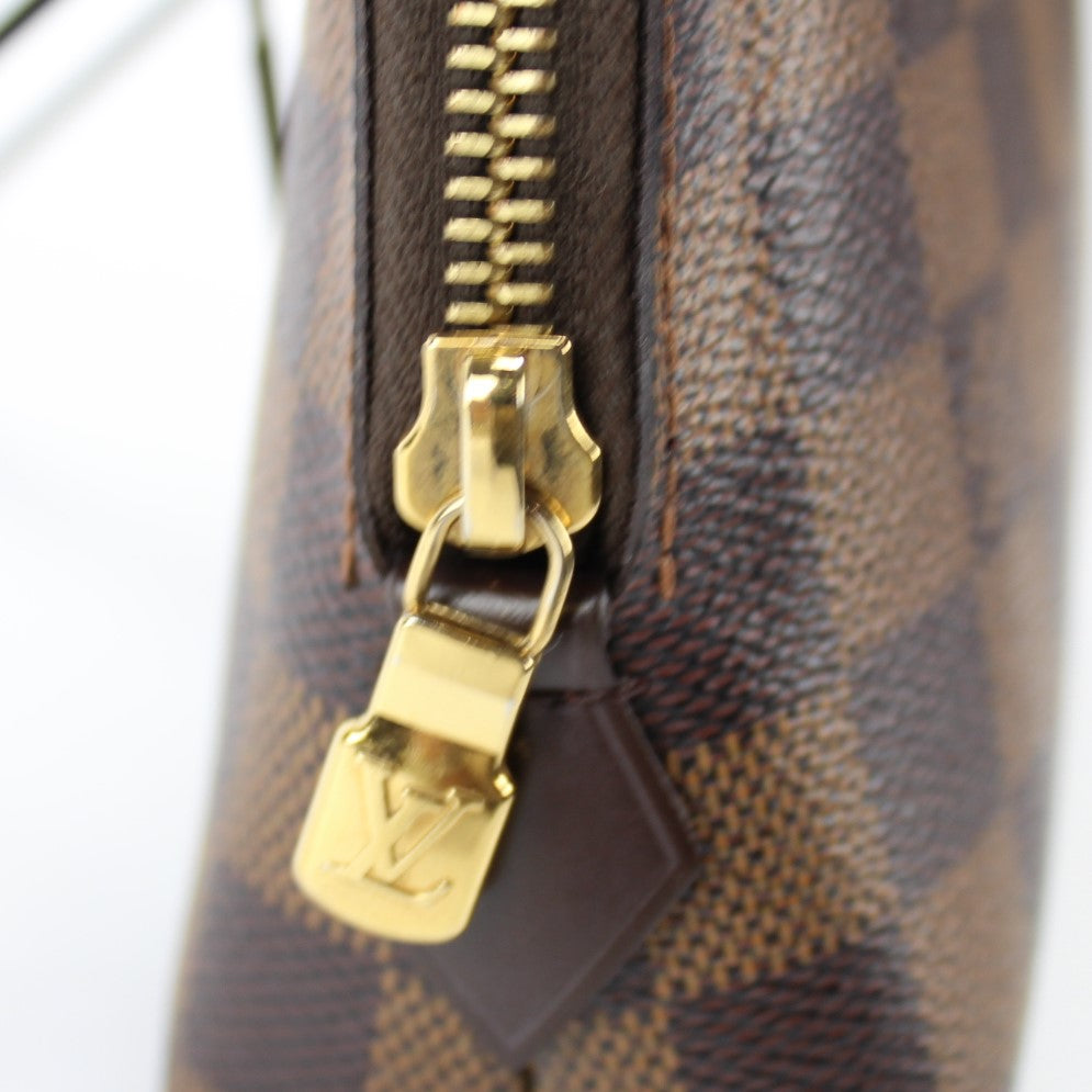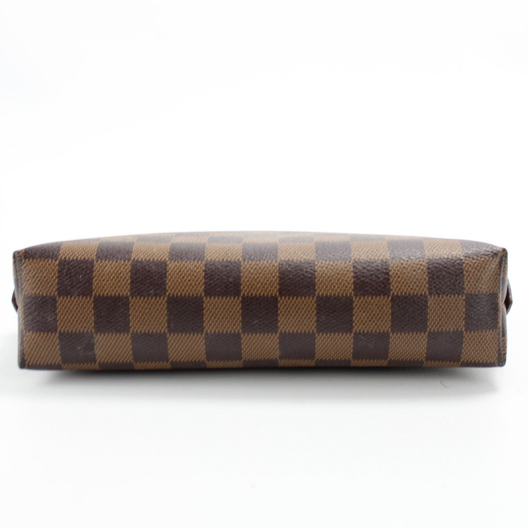 This pre-owned Louis Vuitton Cosmetic Pouch GM is guaranteed 100% authentic. The exterior is in the classic Damier Ebene coated canvas.