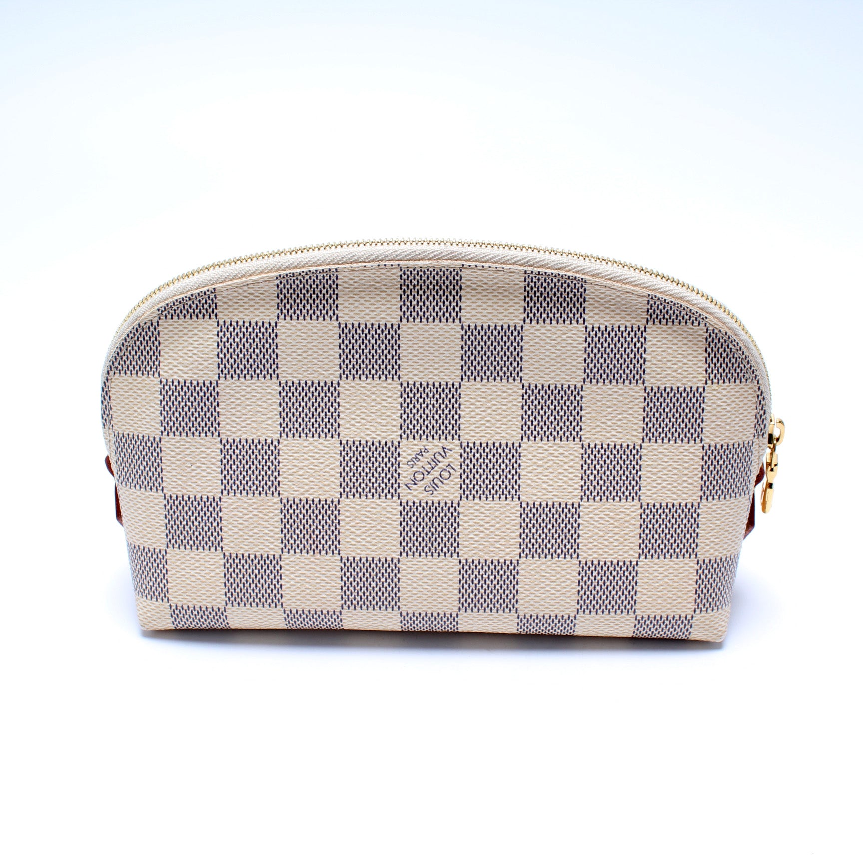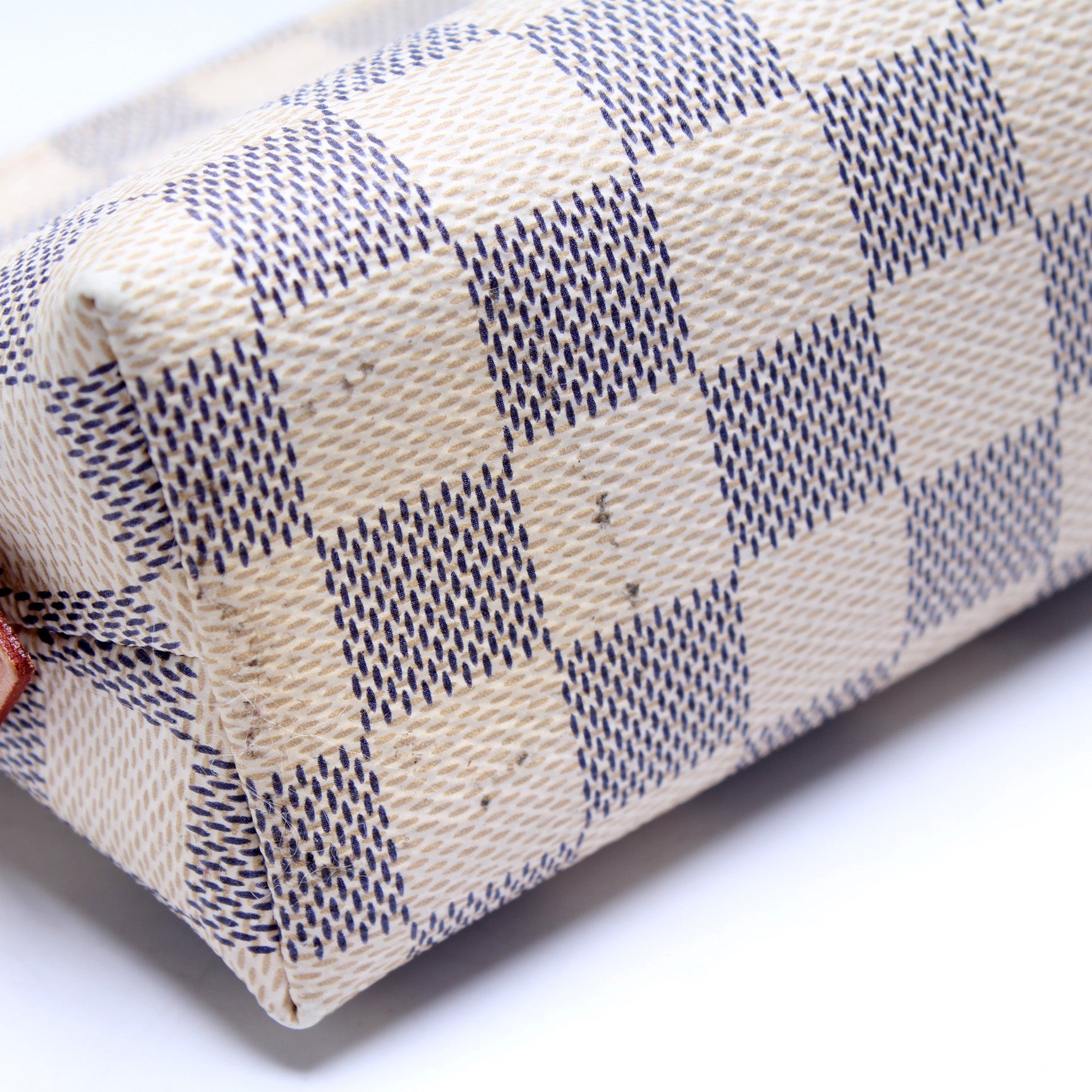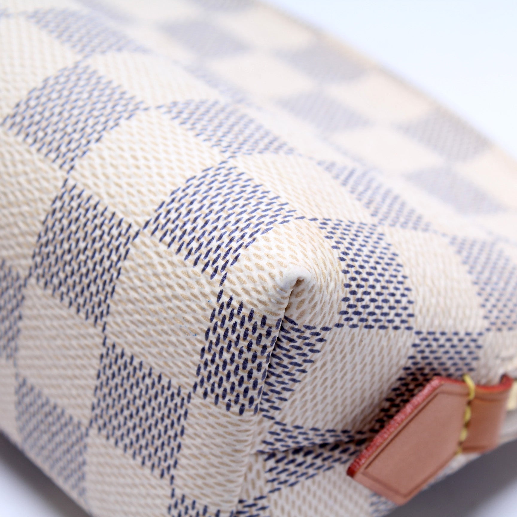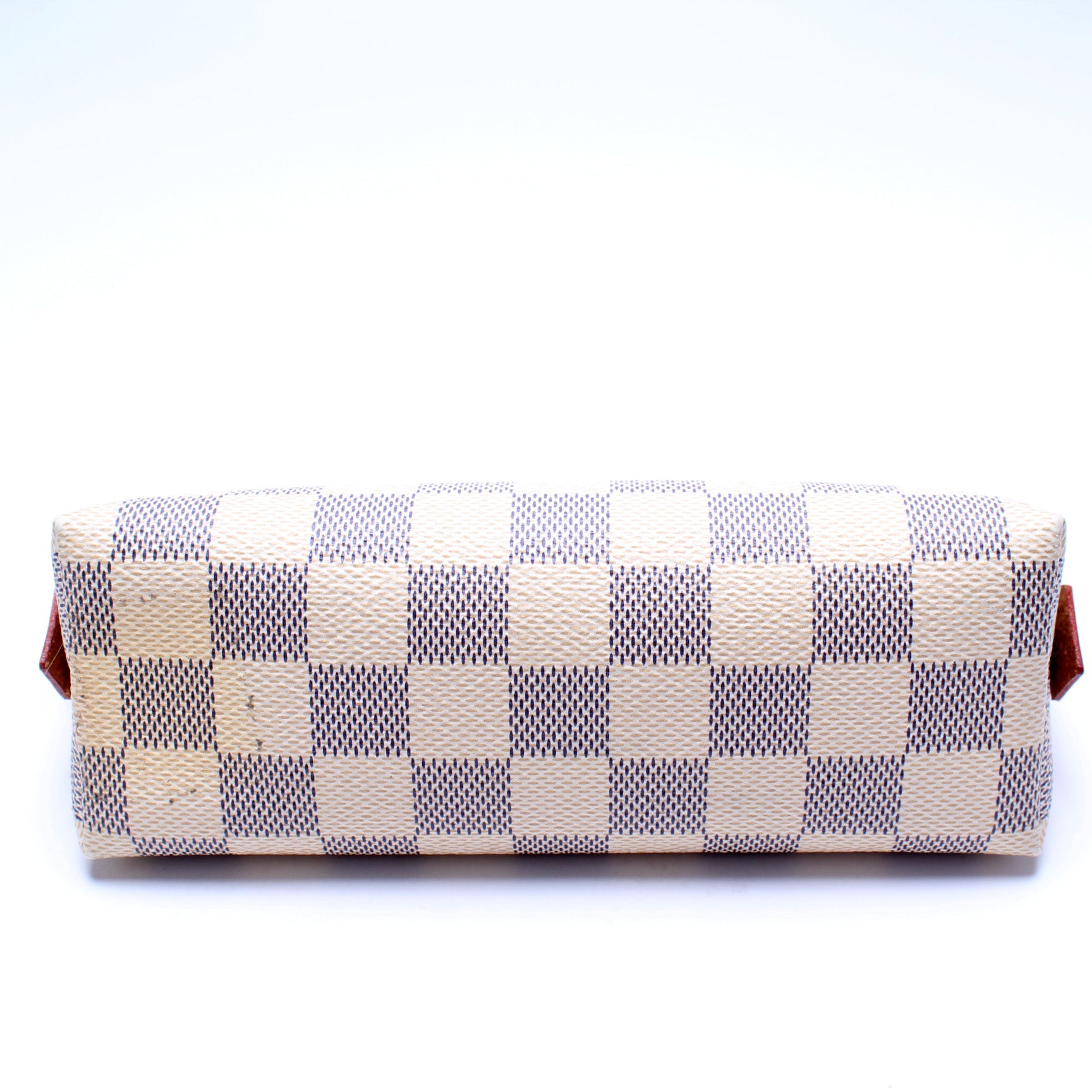 This pre-owned Louis Vuitton Cosmetic Pouch PM is guaranteed 100% authentic. The exterior is in the classic Louis Vuitton Damier Azur coated canvas.