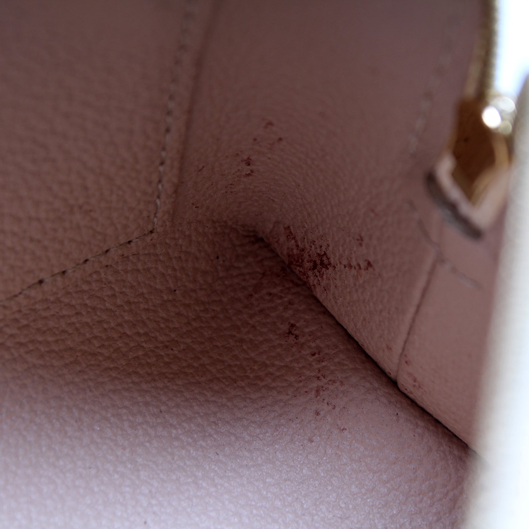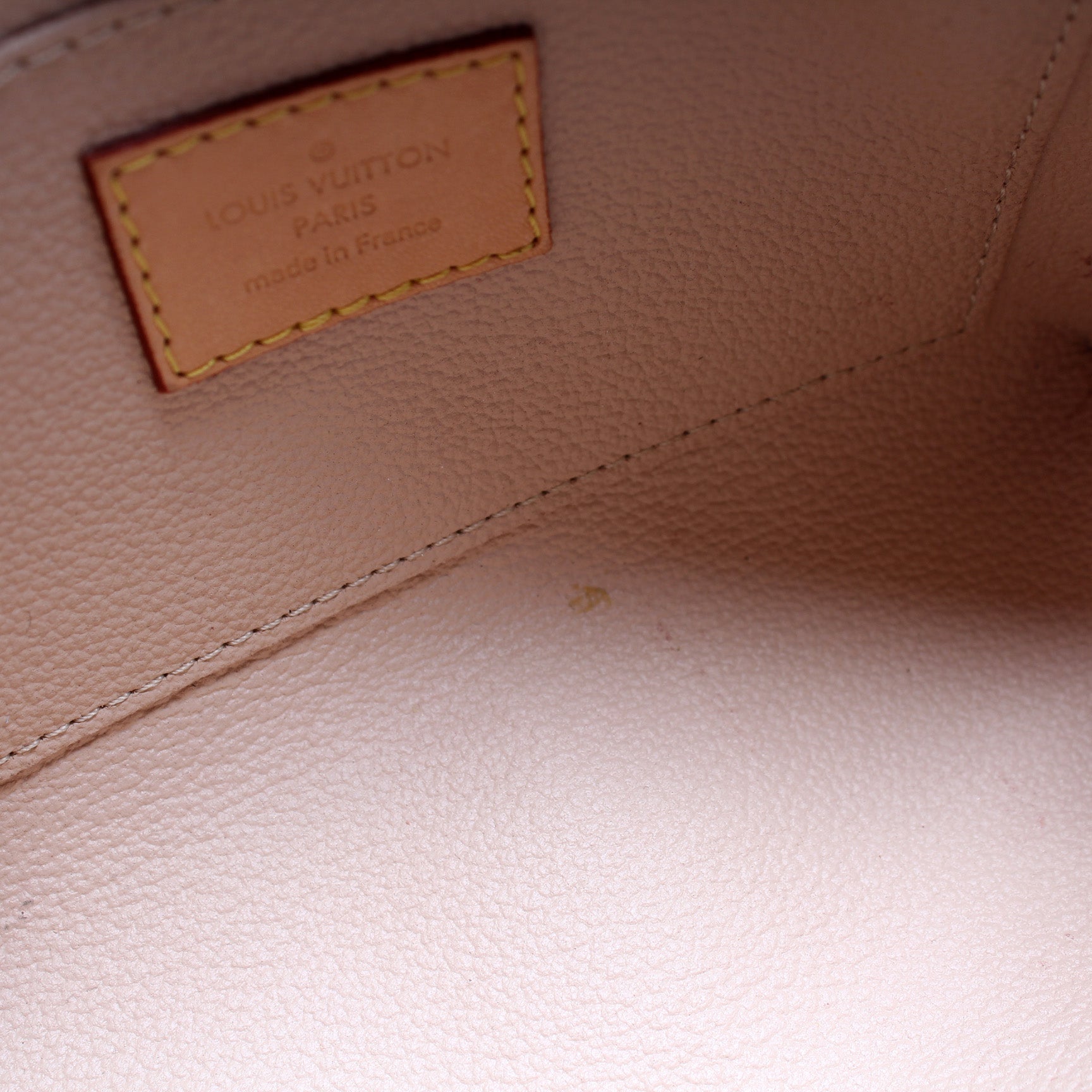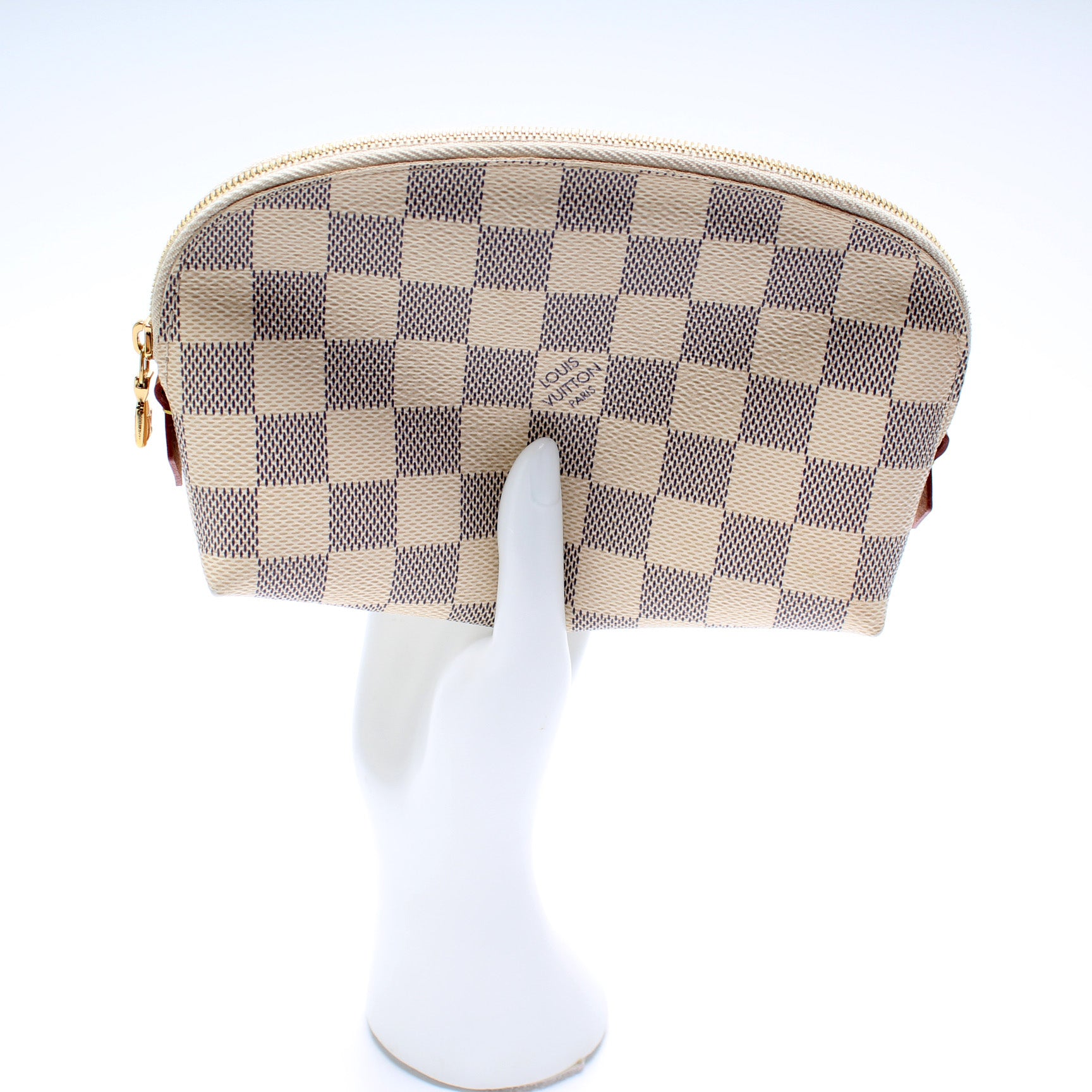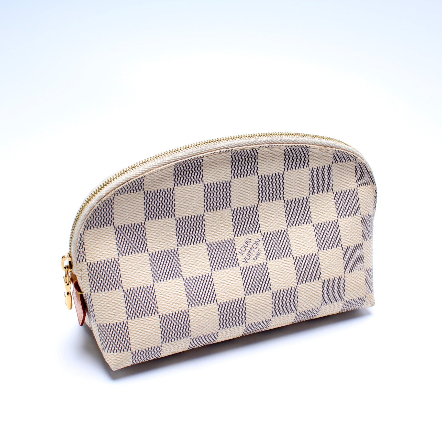 This pre-owned Louis Vuitton Cosmetic Pouch PM is guaranteed 100% authentic. The exterior is in the classic Louis Vuitton Damier Azur coated canvas.