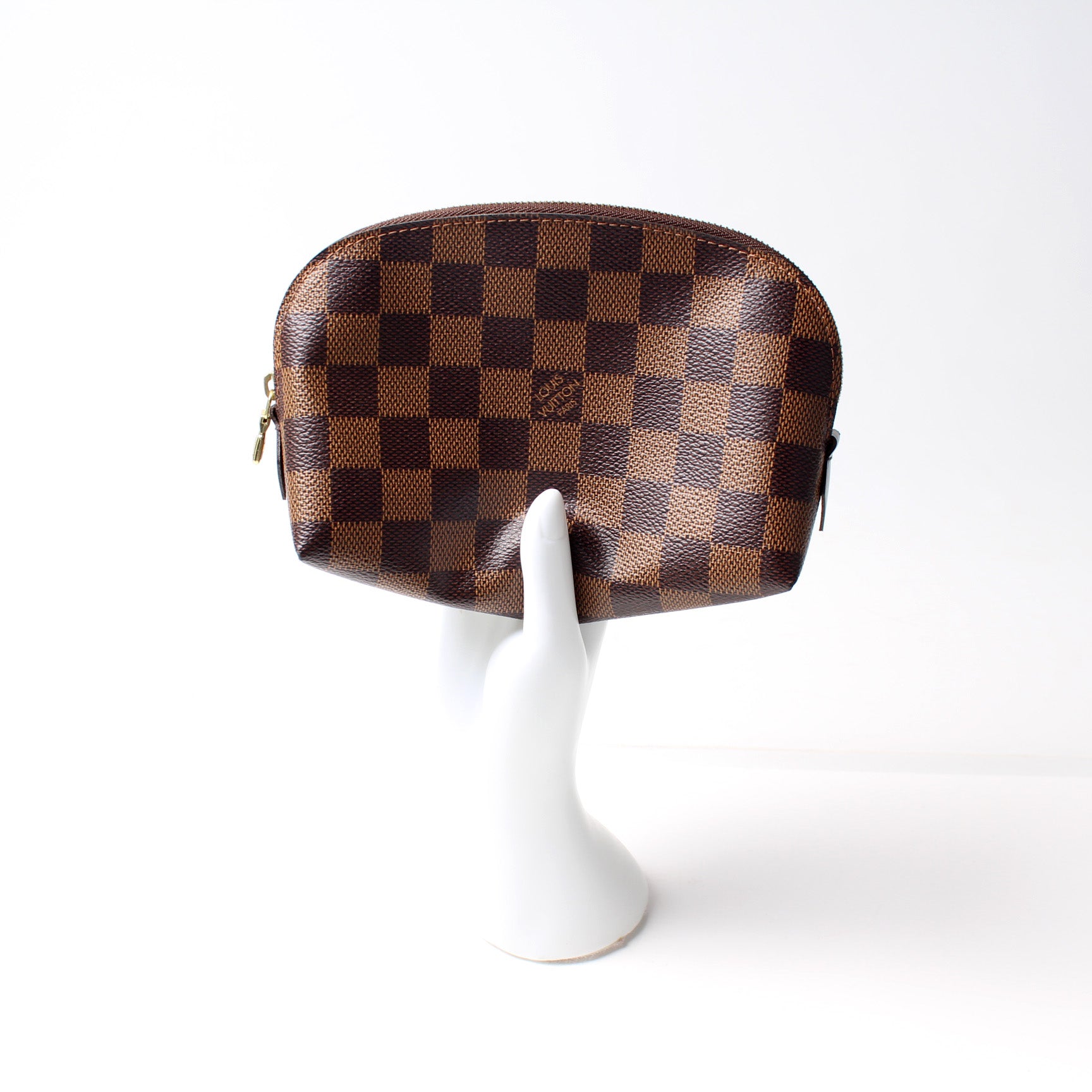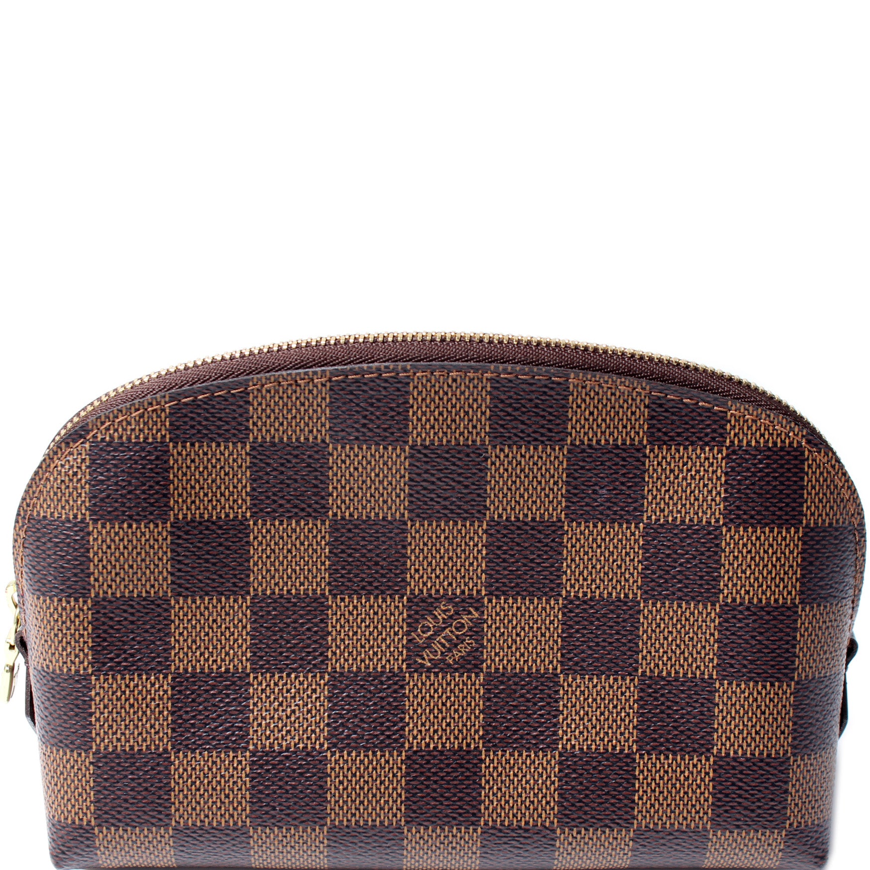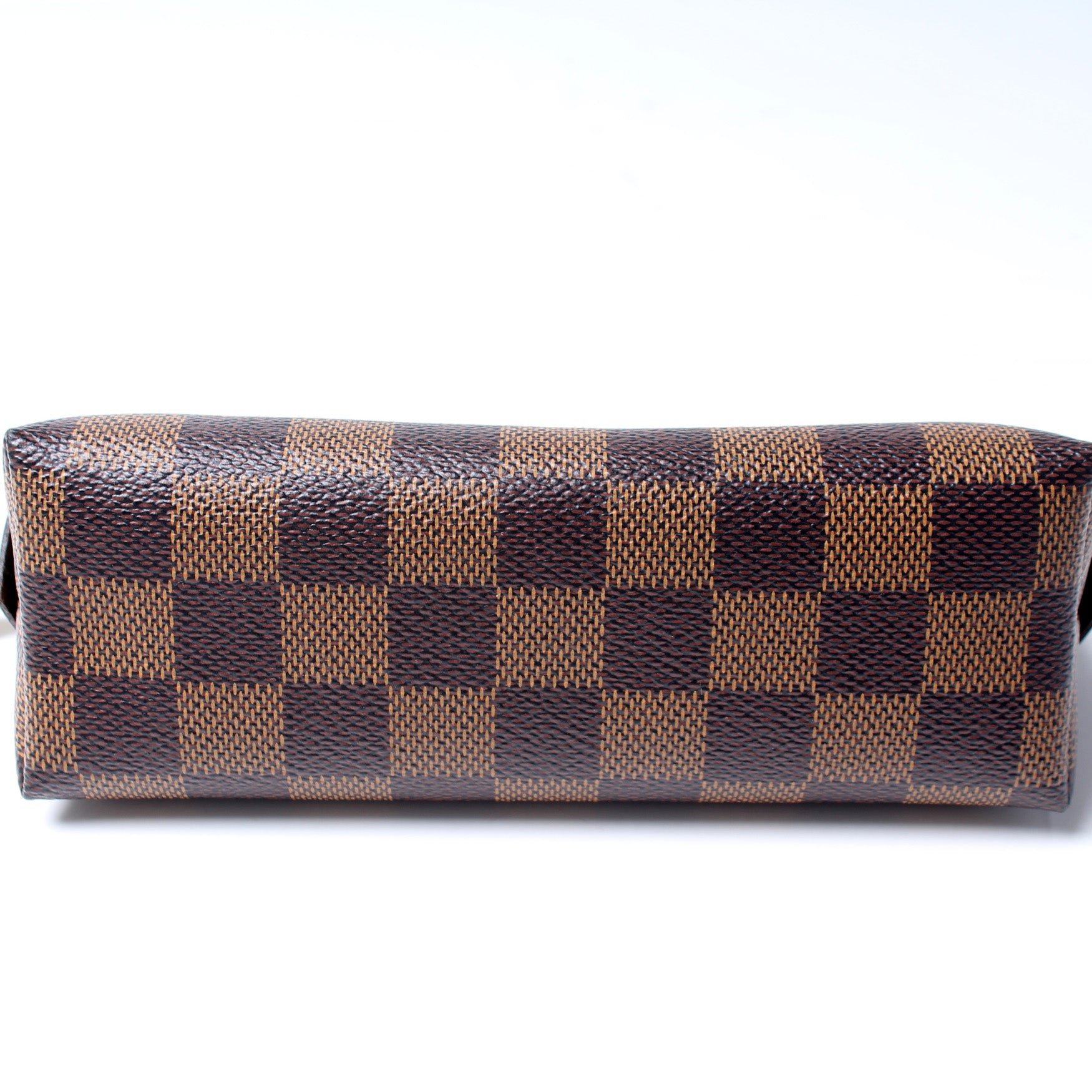 This pre-owned Louis Vuitton Cosmetic Pouch PM is guaranteed 100% authentic. The exterior is in the classic Louis Vuitton Damier Ebene coated canvas.