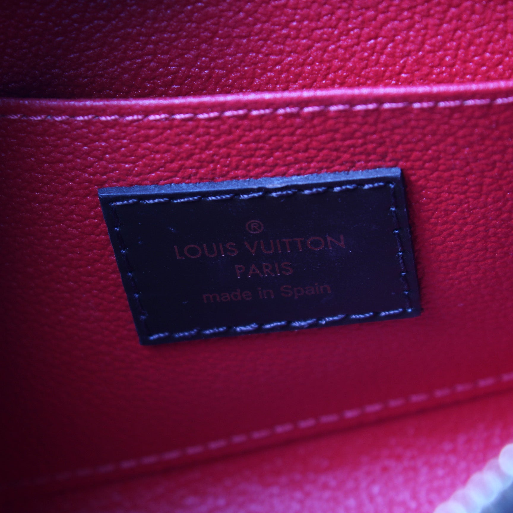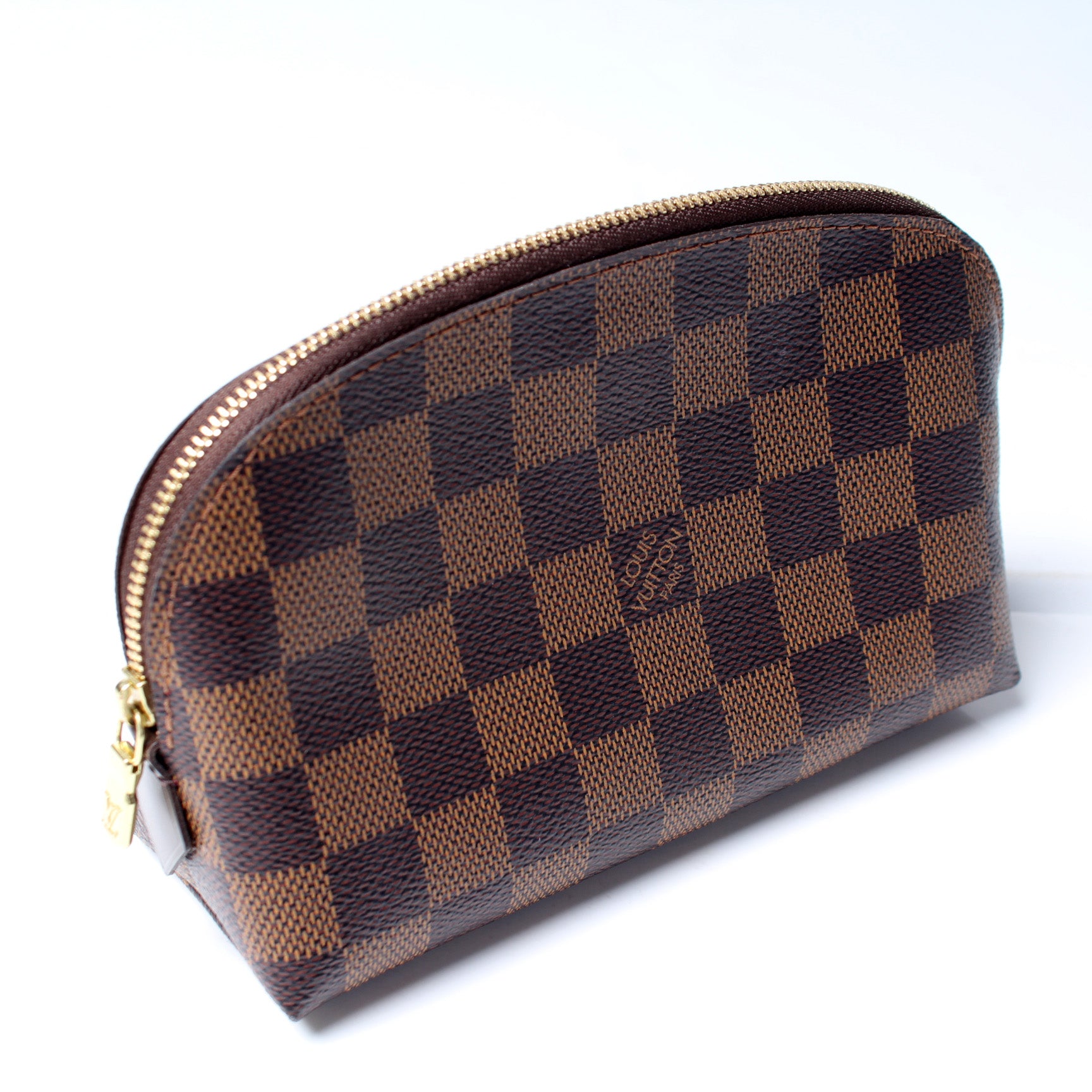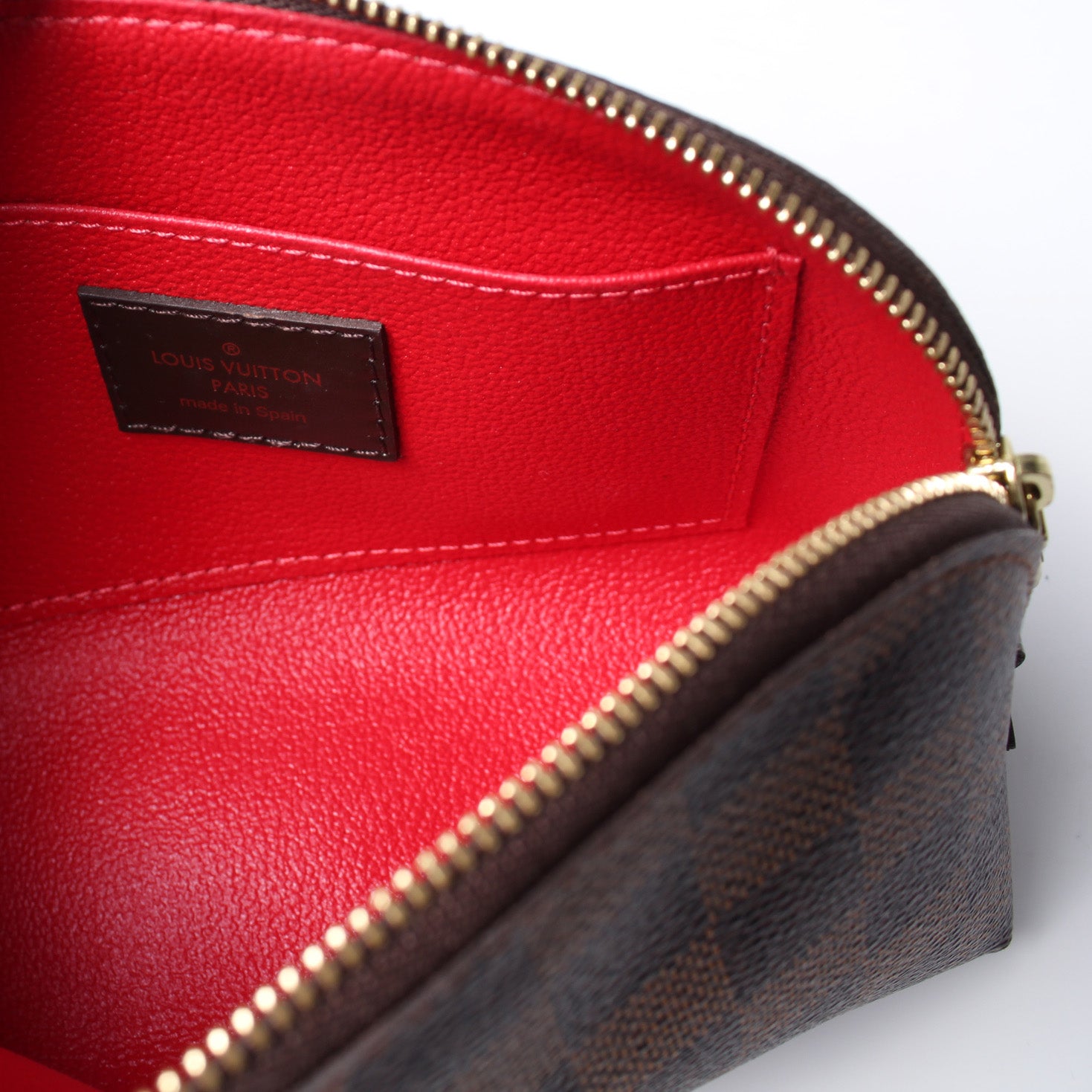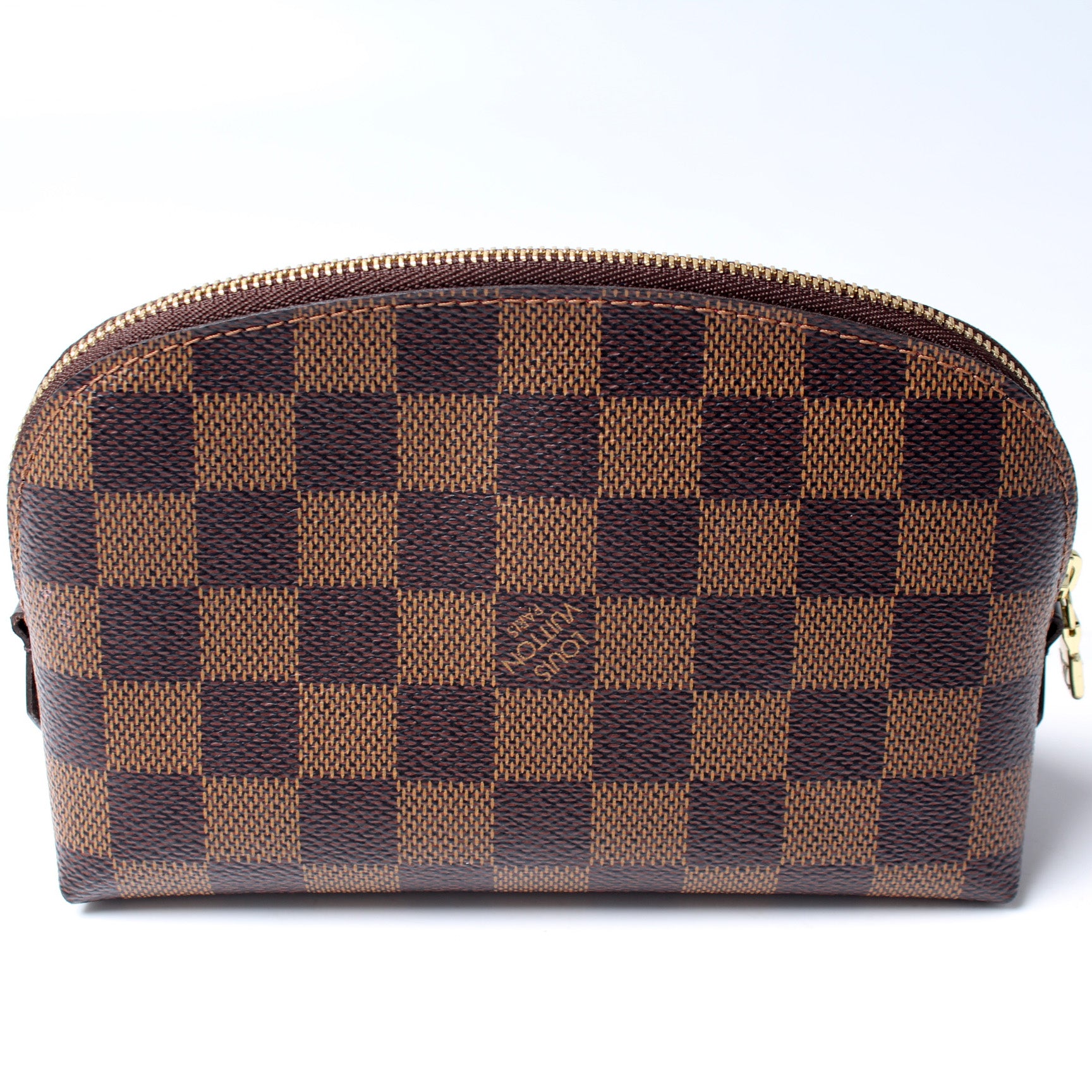 This pre-owned Louis Vuitton Cosmetic Pouch PM is guaranteed 100% authentic. The exterior is in the classic Louis Vuitton Damier Ebene coated canvas.