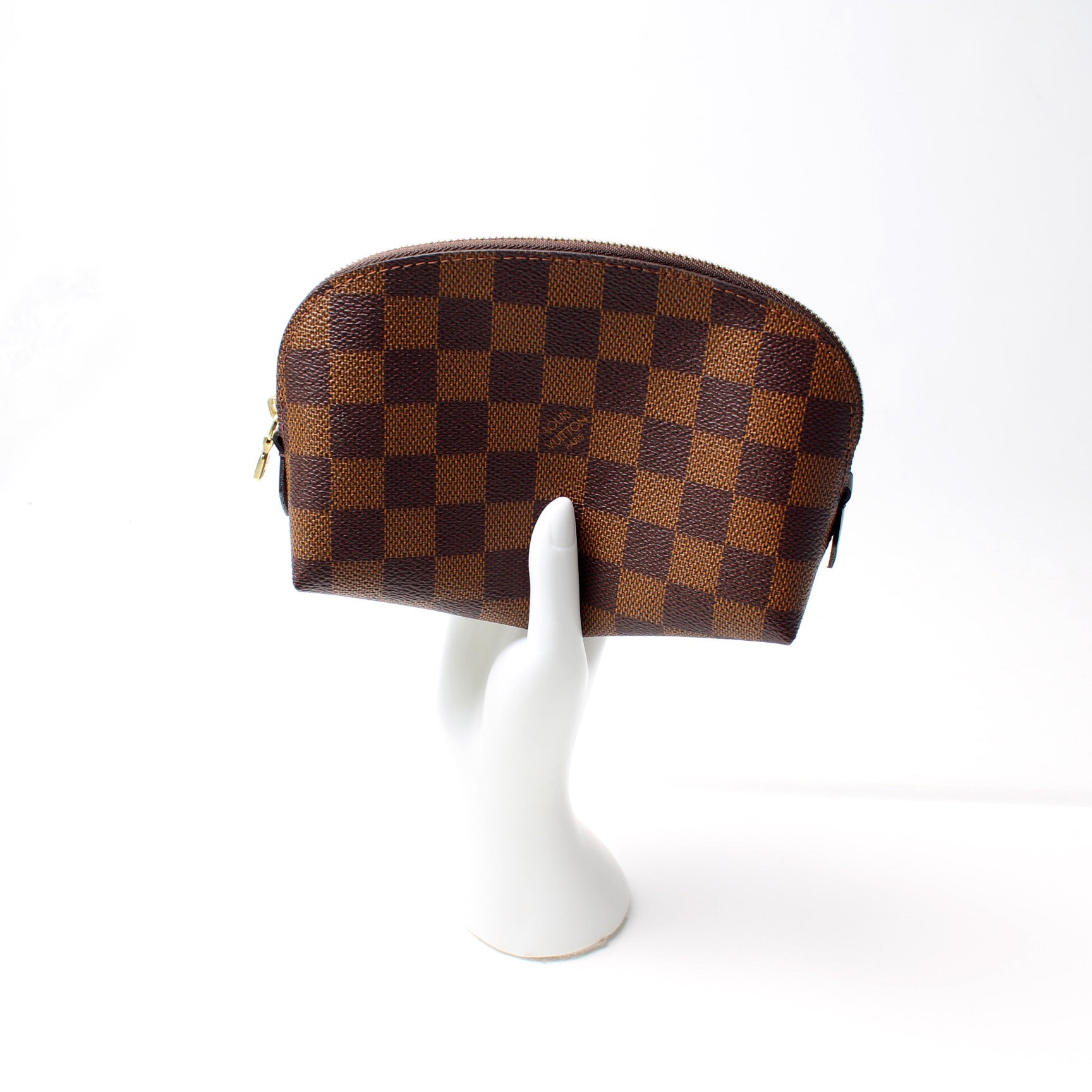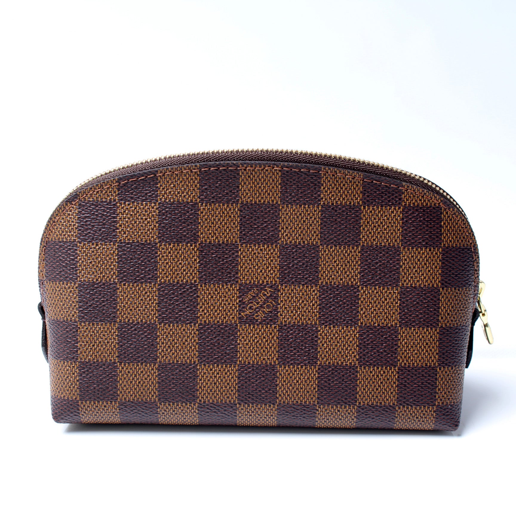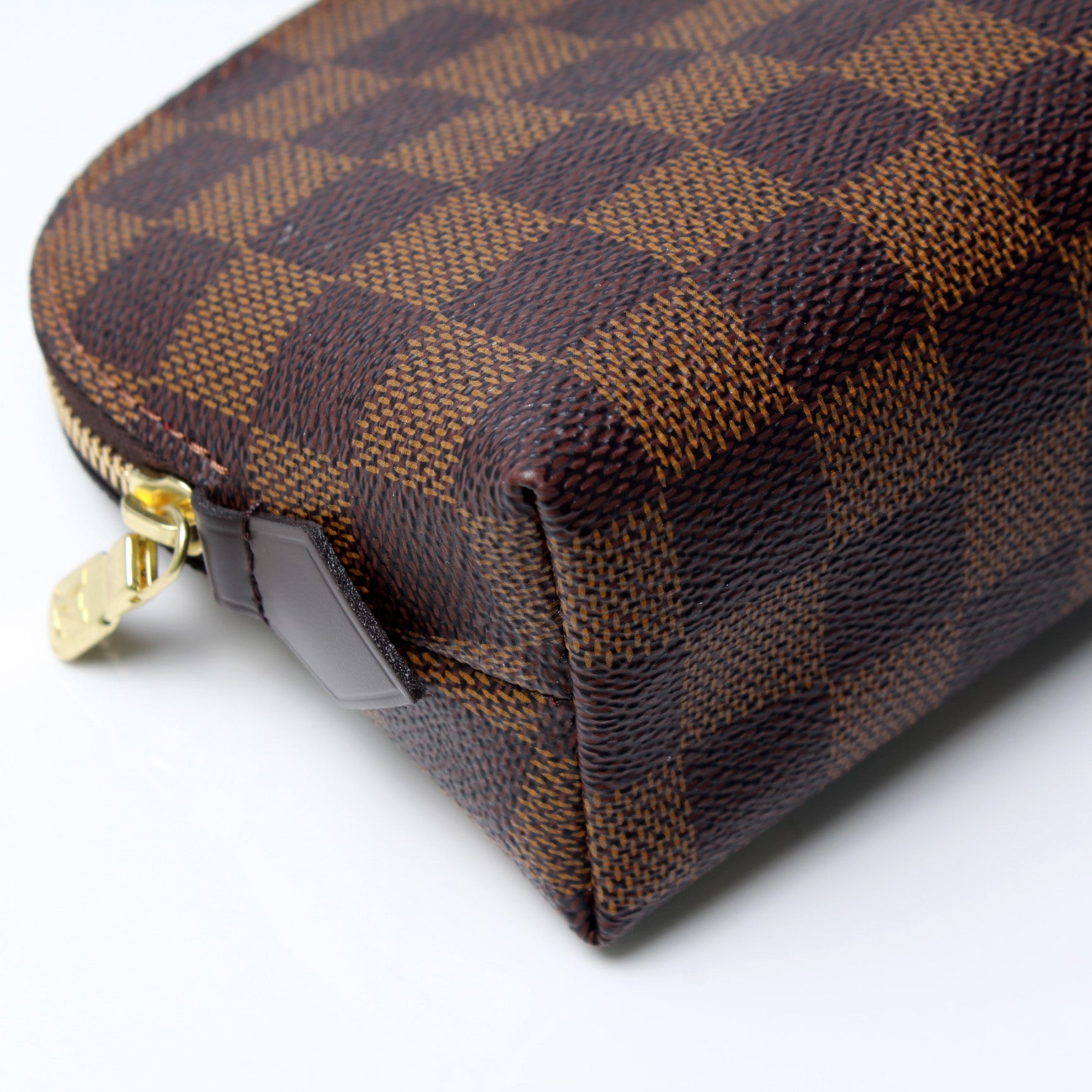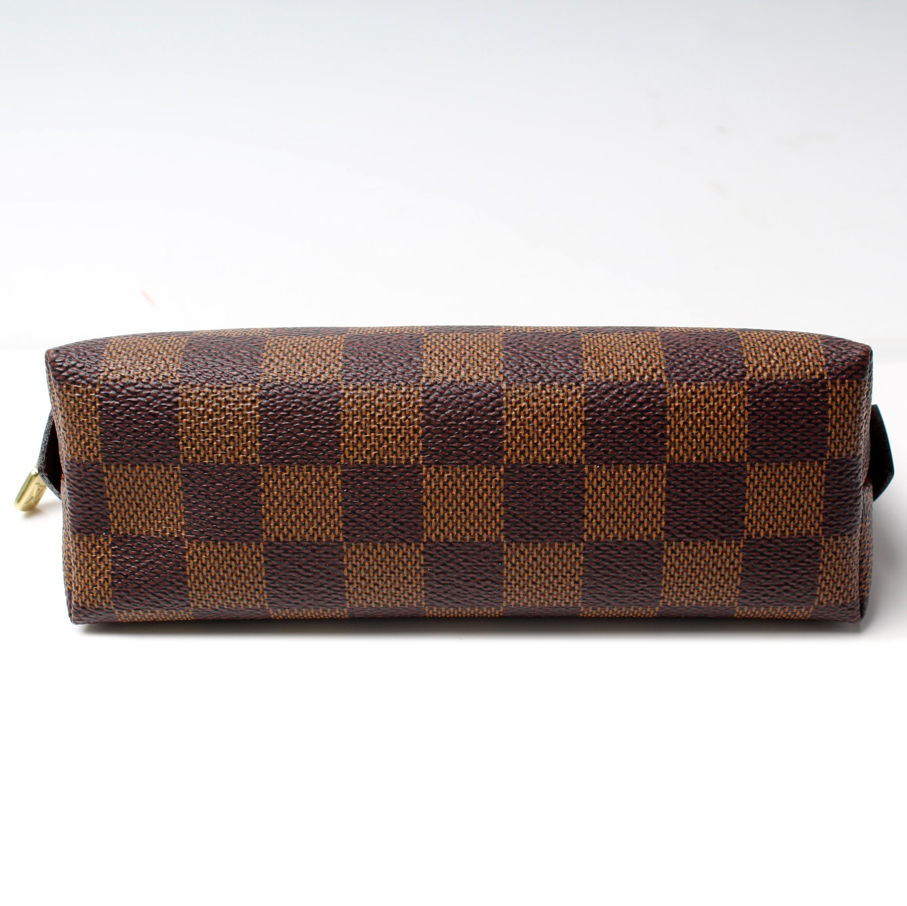 This pre-owned Louis Vuitton Cosmetic Pouch PM is guaranteed 100% authentic. The exterior is in the classic Louis Vuitton Damier Ebene coated canvas.
