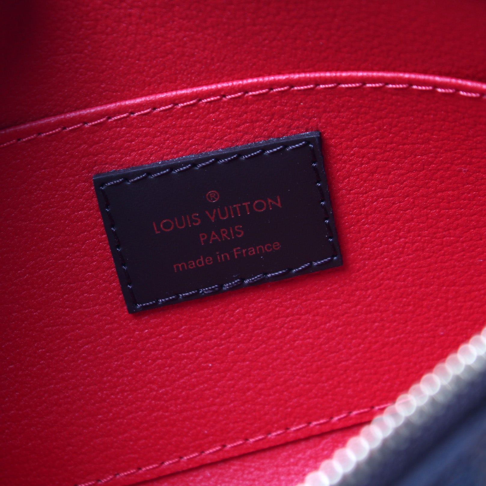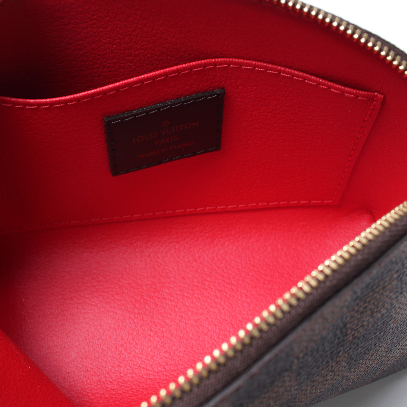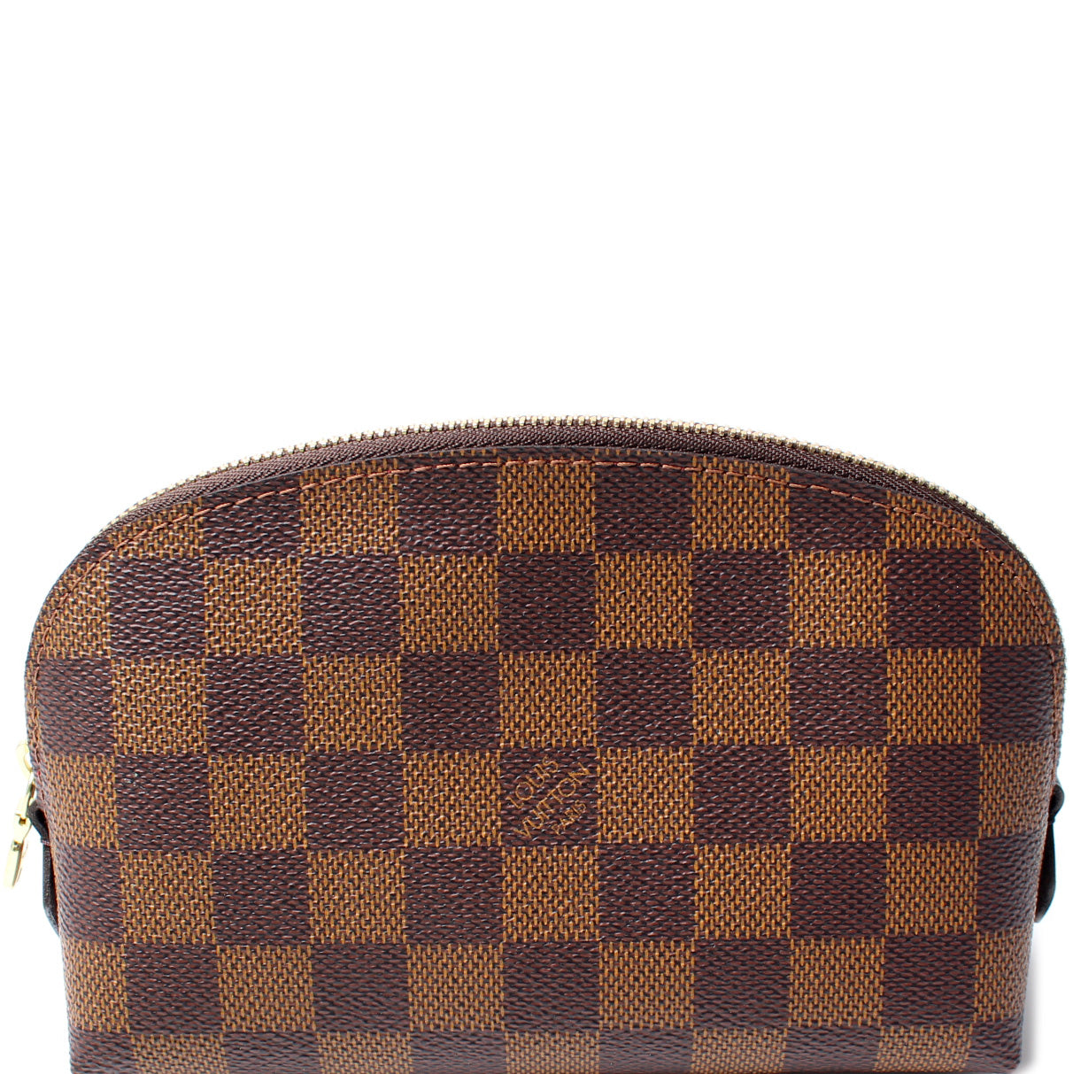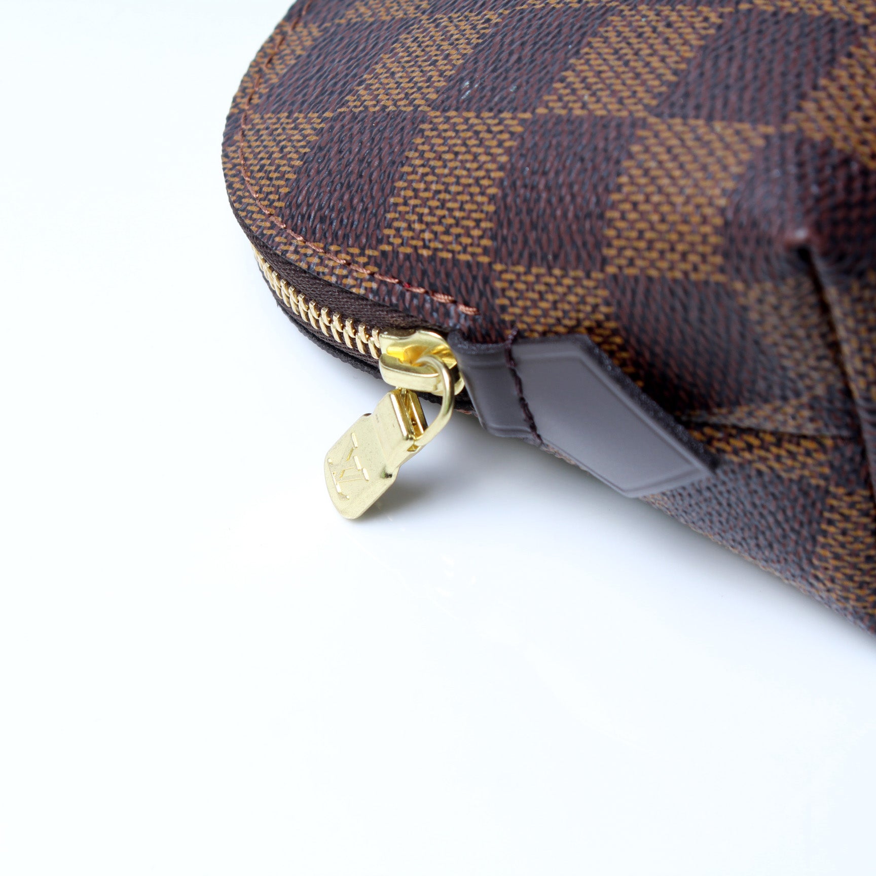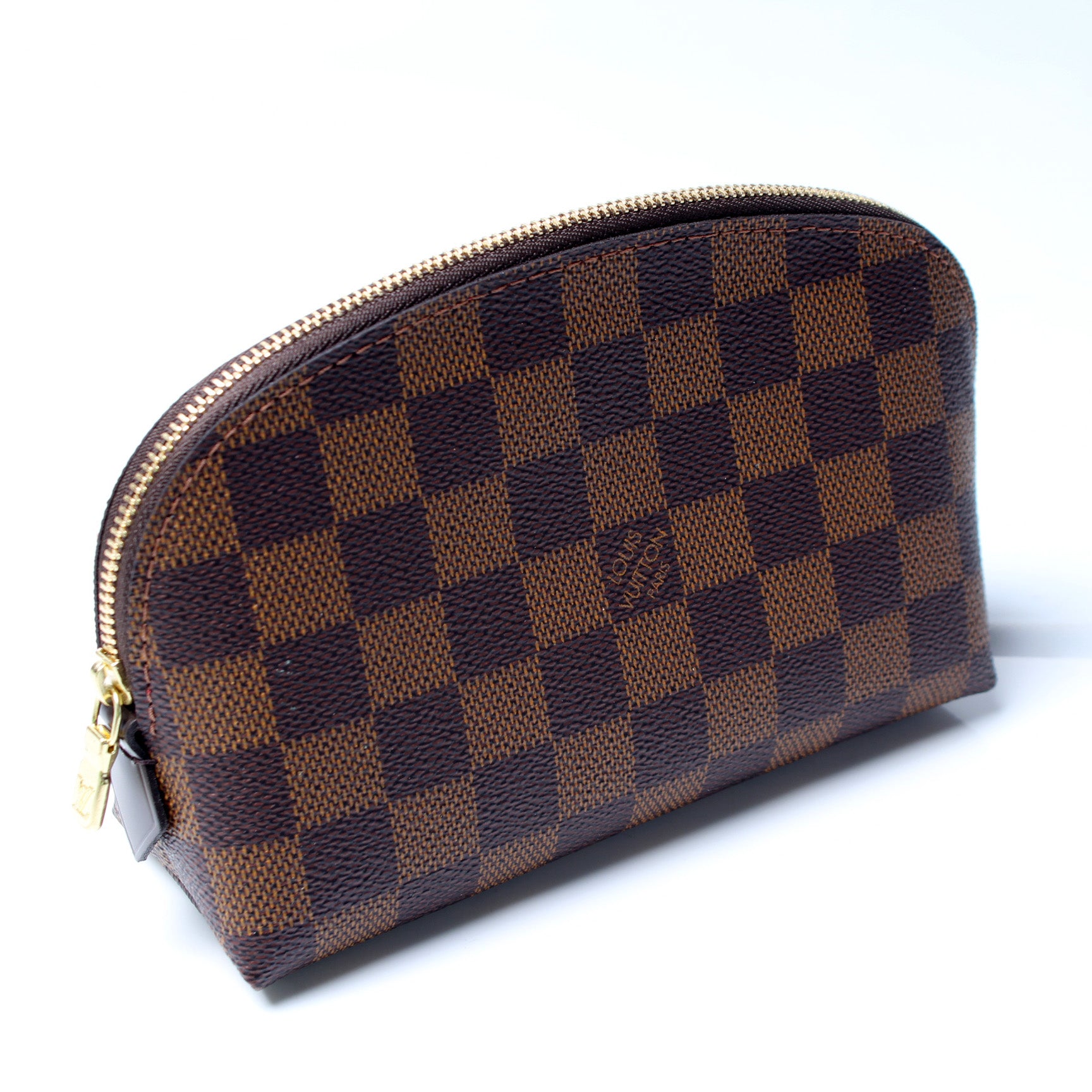 This pre-owned Louis Vuitton Cosmetic Pouch PM is guaranteed 100% authentic. The exterior is in the classic Louis Vuitton Damier Ebene coated canvas.